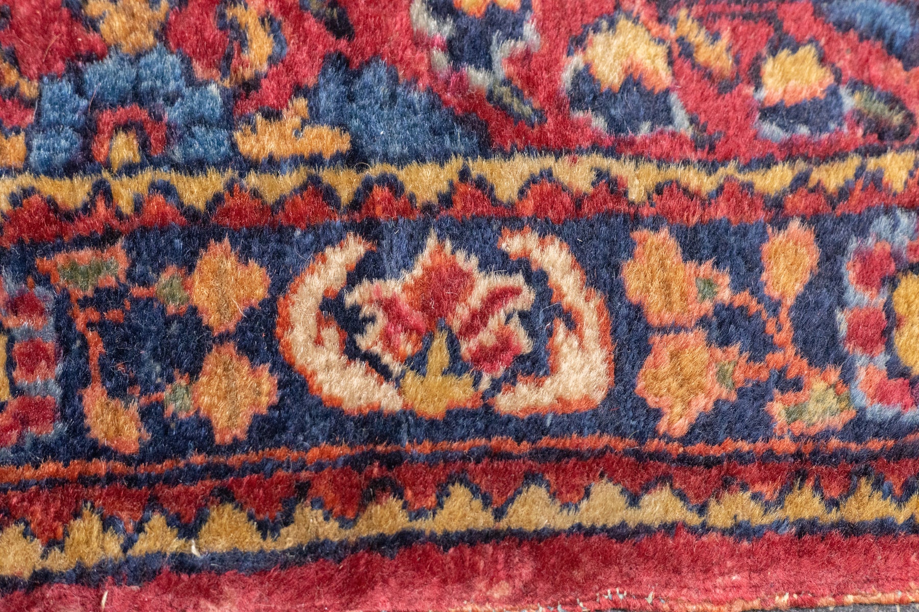 The well-woven village carpets from the Arak/Sultanabad area, especially the red field/navy border, detached floral spray pattern “American Sarouks” of the 1920-1970 period. Robust and leathery, on cotton. Recent examples show medallions and classic allover patterns. Best Sarouks are reputed to be Mohajerans.