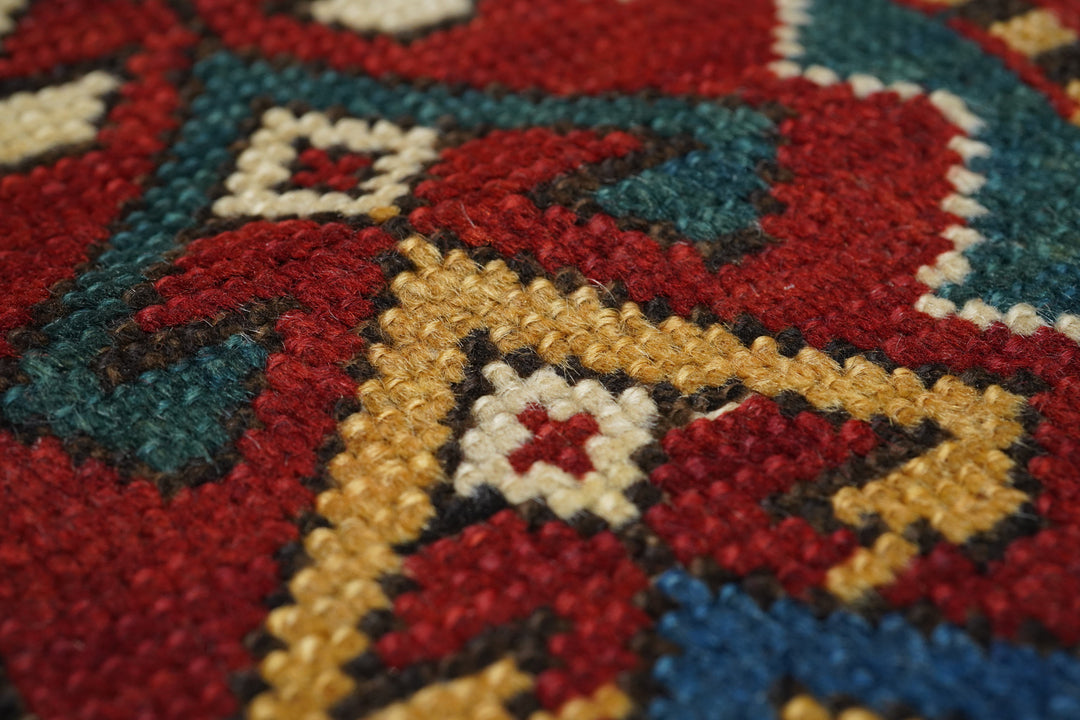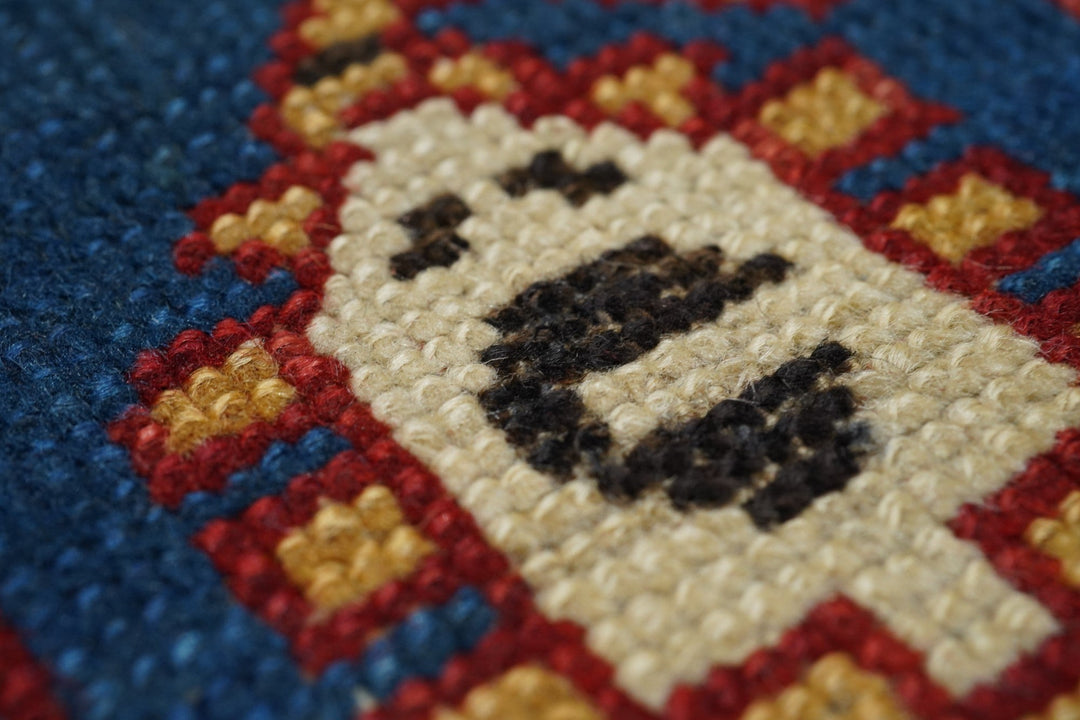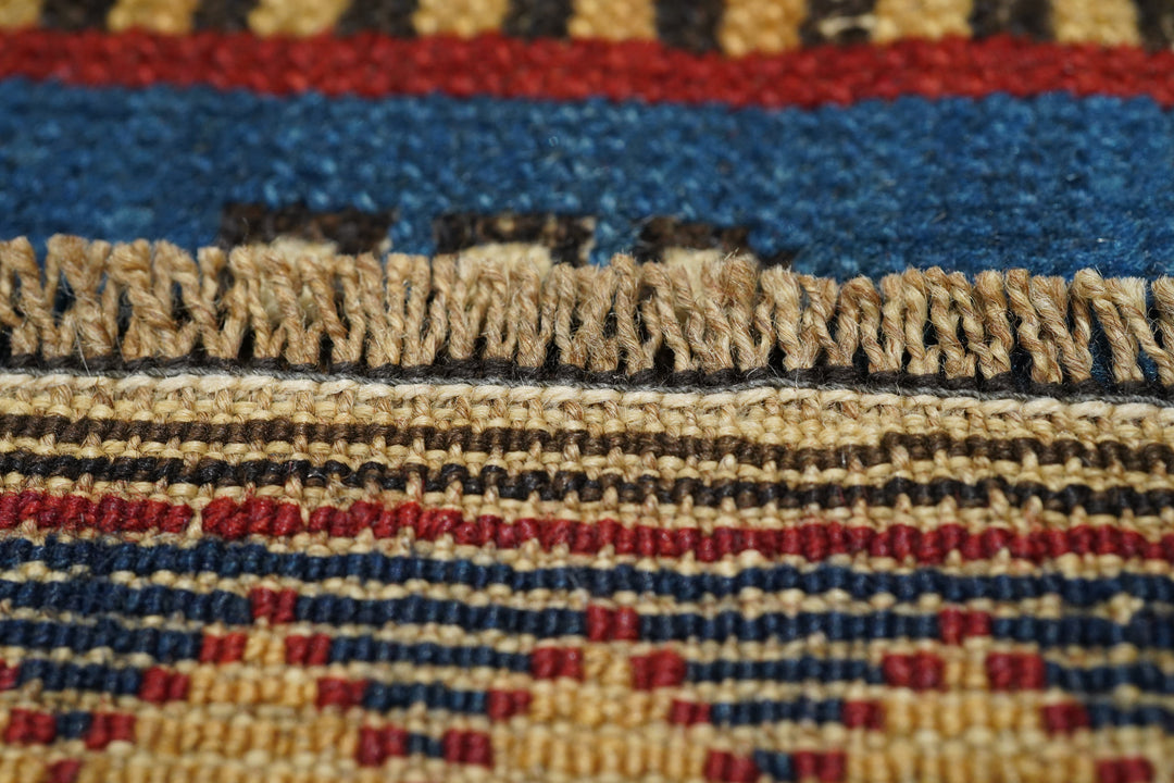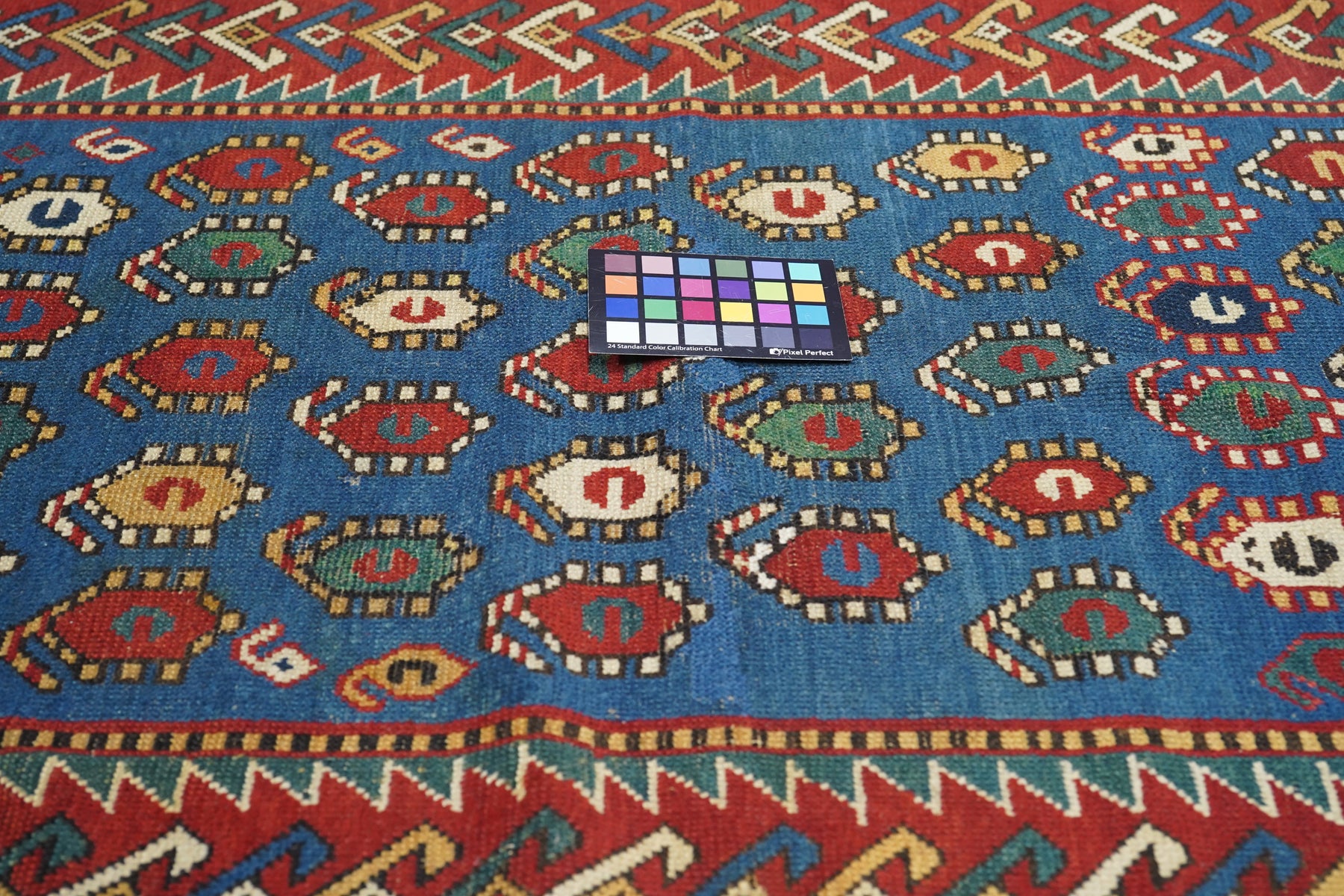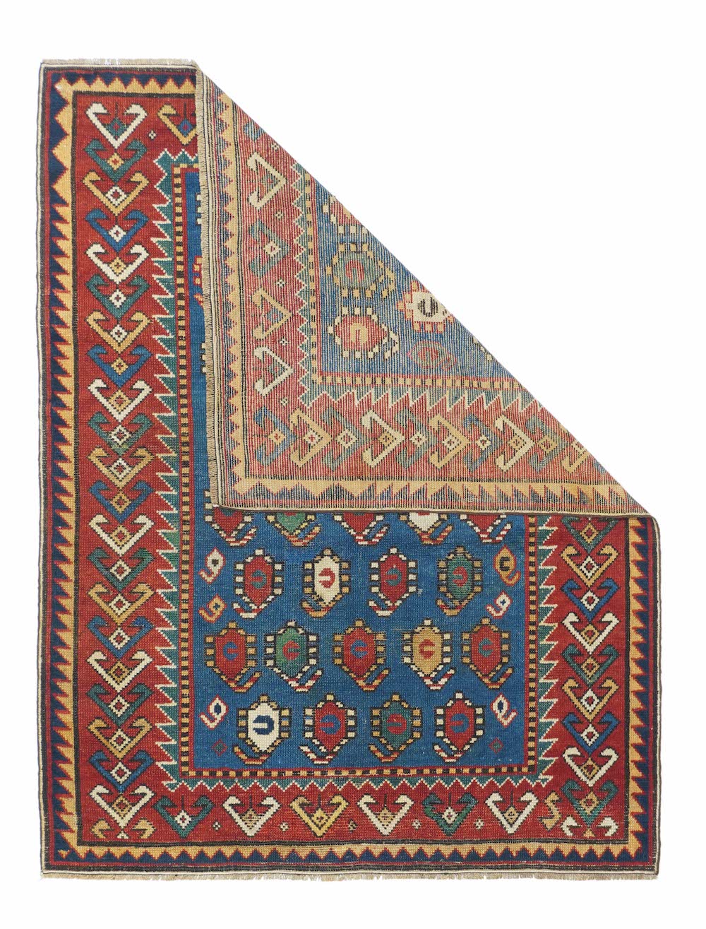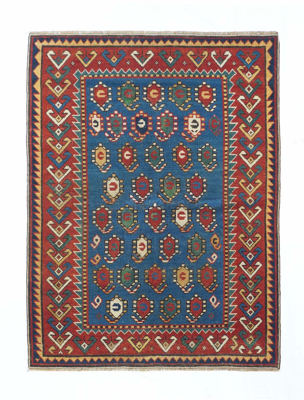 The medium blue field shows eight reversing offset rows of colorful floriated floating botehs. The red border shows hooked Vees in herringbone style, accented in goldenrod, green, medium blue and ivory. Sawtooth minor borders. Wool warp, medium weave, rustic work. Unusual and possibly unique main border. Attractive small scatter in good condition.