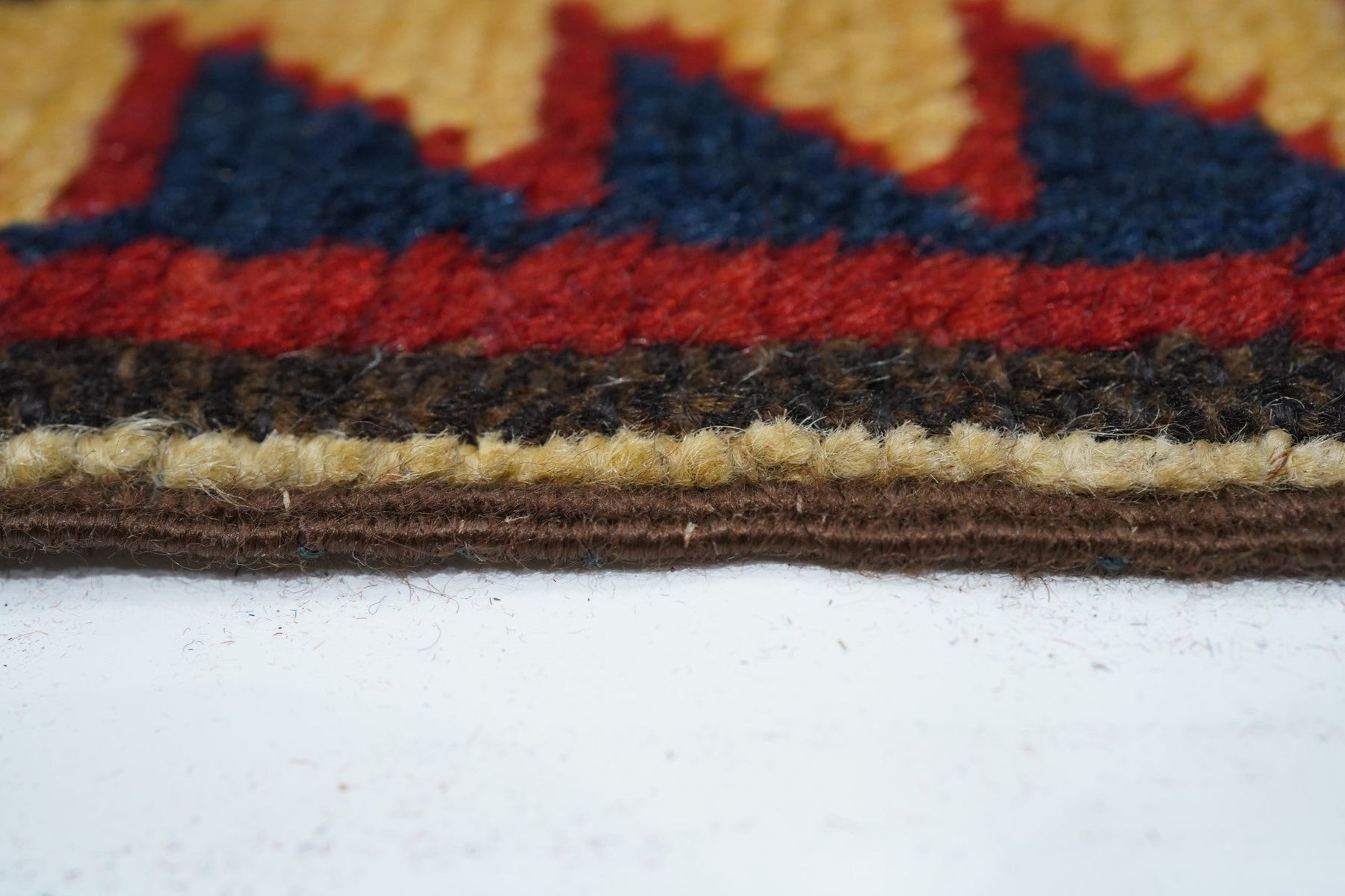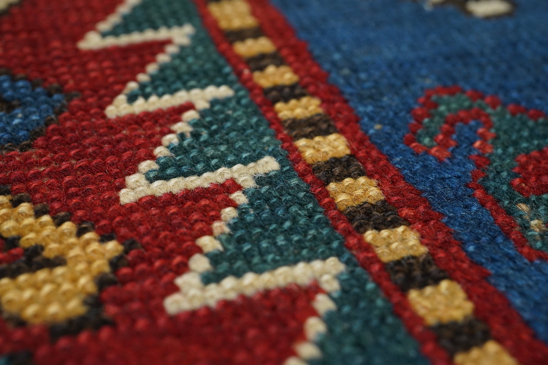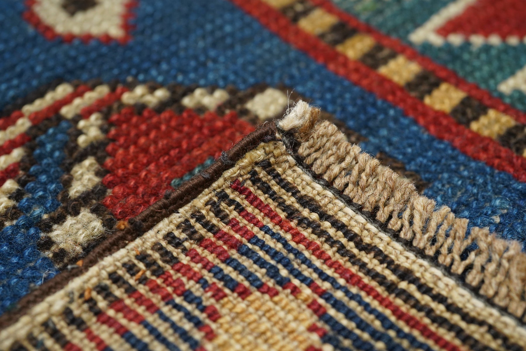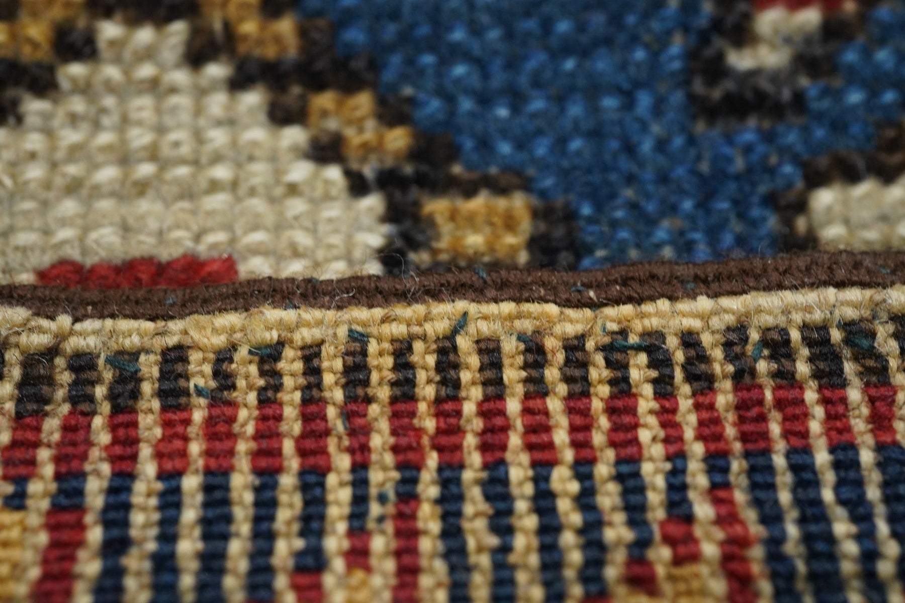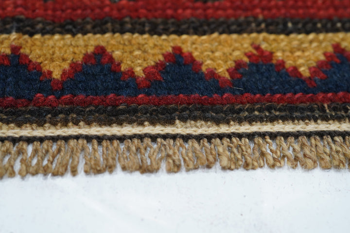 The medium blue field shows eight reversing offset rows of colorful floriated floating botehs. The red border shows hooked Vees in herringbone style, accented in goldenrod, green, medium blue and ivory. Sawtooth minor borders. Wool warp, medium weave, rustic work. Unusual and possibly unique main border. Attractive small scatter in good condition.