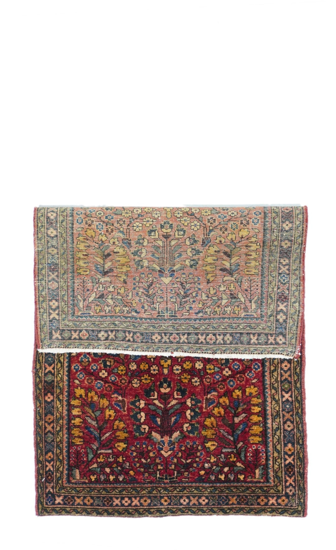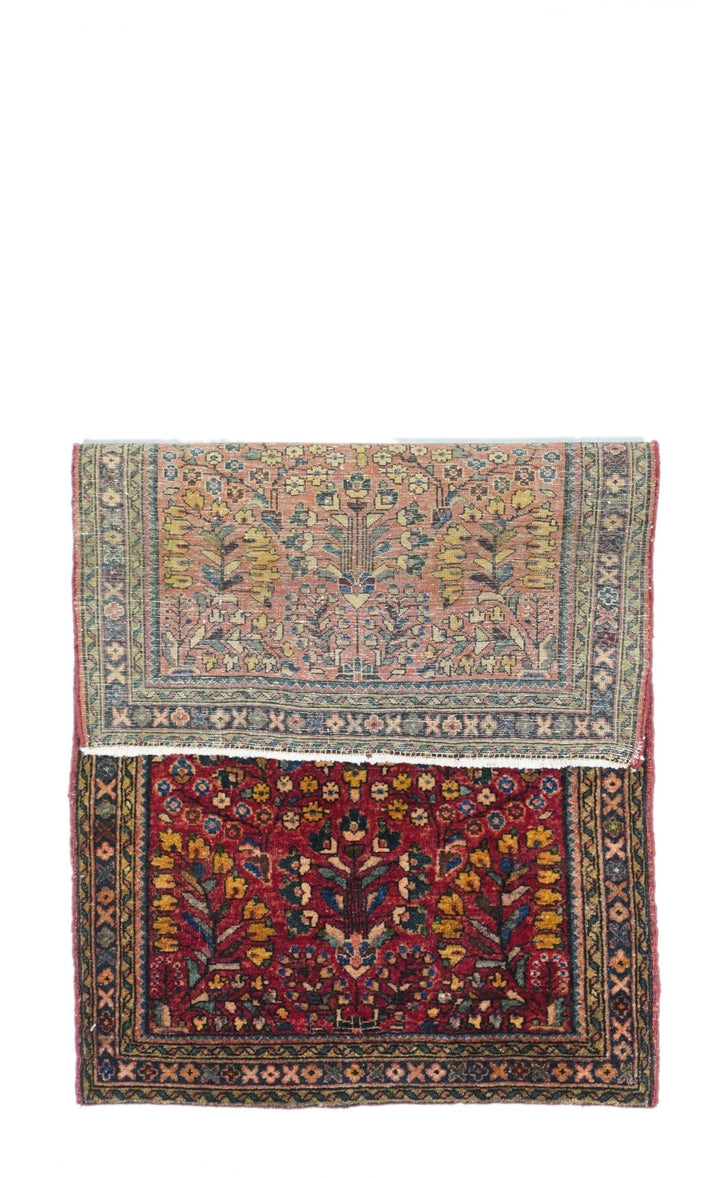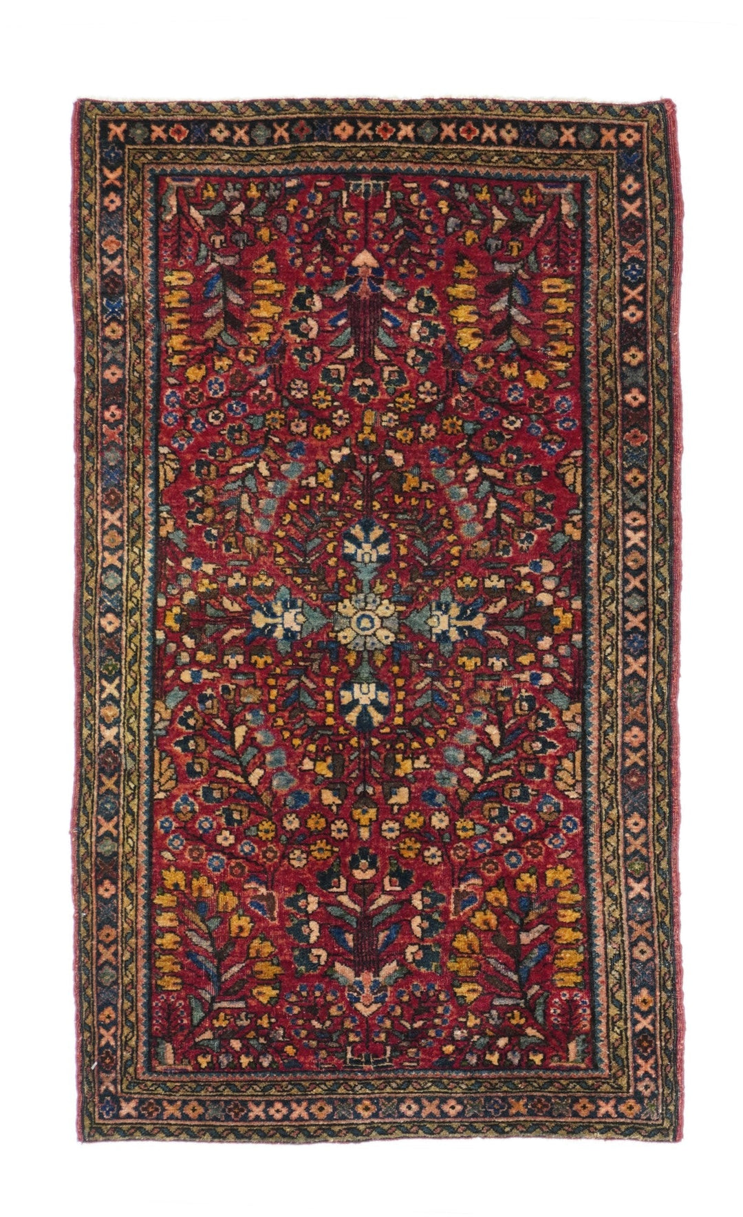 This well-woven Interwar ruglet shows the characteristic "American Sarouk" pattern of detached floral sprays arranged around a central rosette on a red ground, accented in light blue, sky blue, gold and navy. Narrowest navy border of X's and O's. Cotton foundation. Robust, leathery handle. Big carpet in a small package.