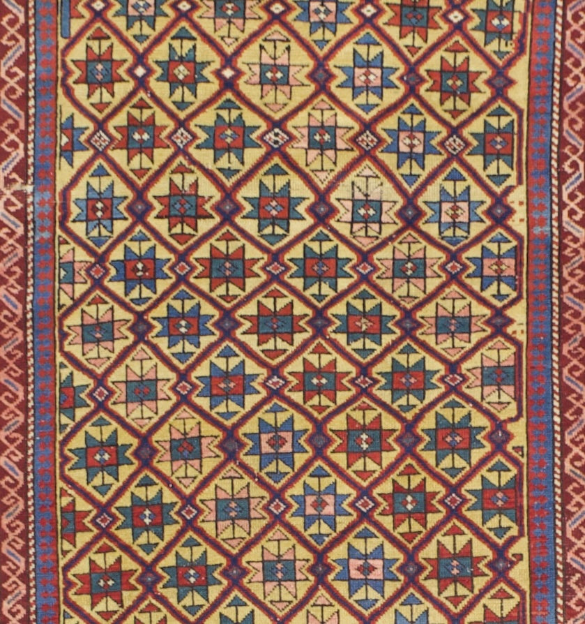 Azeri Turks inhabit the Kuba area of the central west Caspian Caucasus and weave a wide variety of geometric scatters, runners, long rugs and niche (prayer) pieces, in geometric allover and medallion designs. Some flat-weaves in kilim/tapestry and sumak (weft-wrapping) techniques are also woven. Numerous identified types/villages: Zeychur, Alpan, Chi-chi, etc. Generally all-wool, moderate to medium weave. Colorful.
