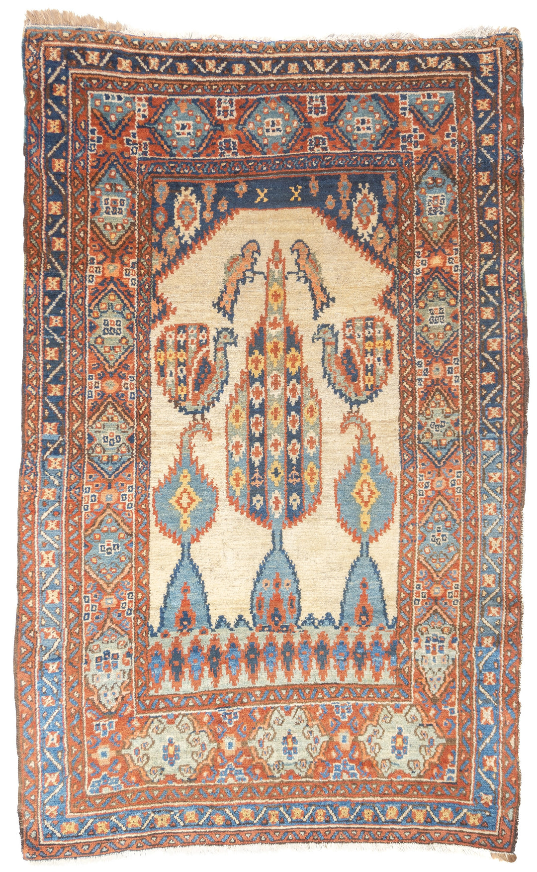 Generally in squarish sizes, allover patterns and coarse to moderate weaves, wool or mixed constructions; woven before 1900. Term is often extended to early medallion, later 19th century. Earlier pieces often have slightly more muted palettes employing rust, straw and lighter blues. Generally in carpet sizes, some scatters.