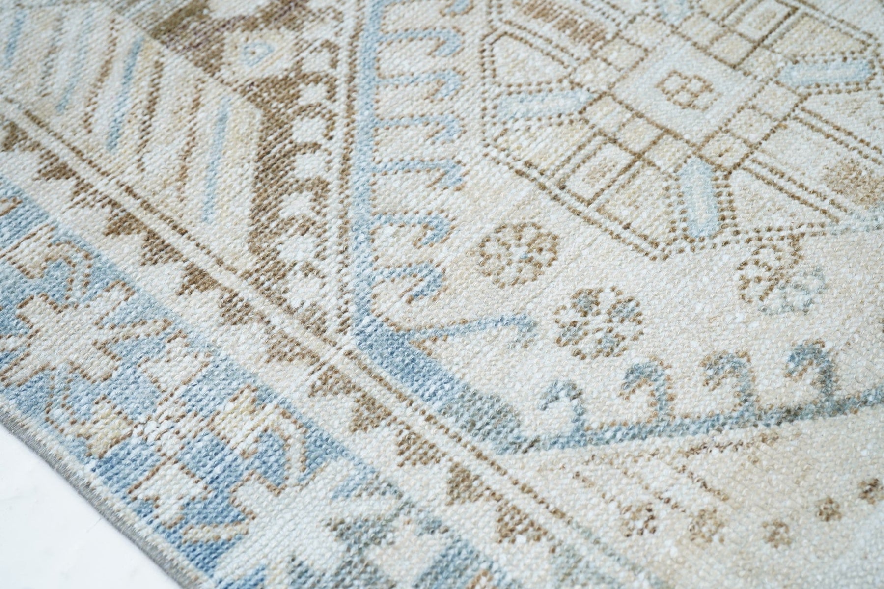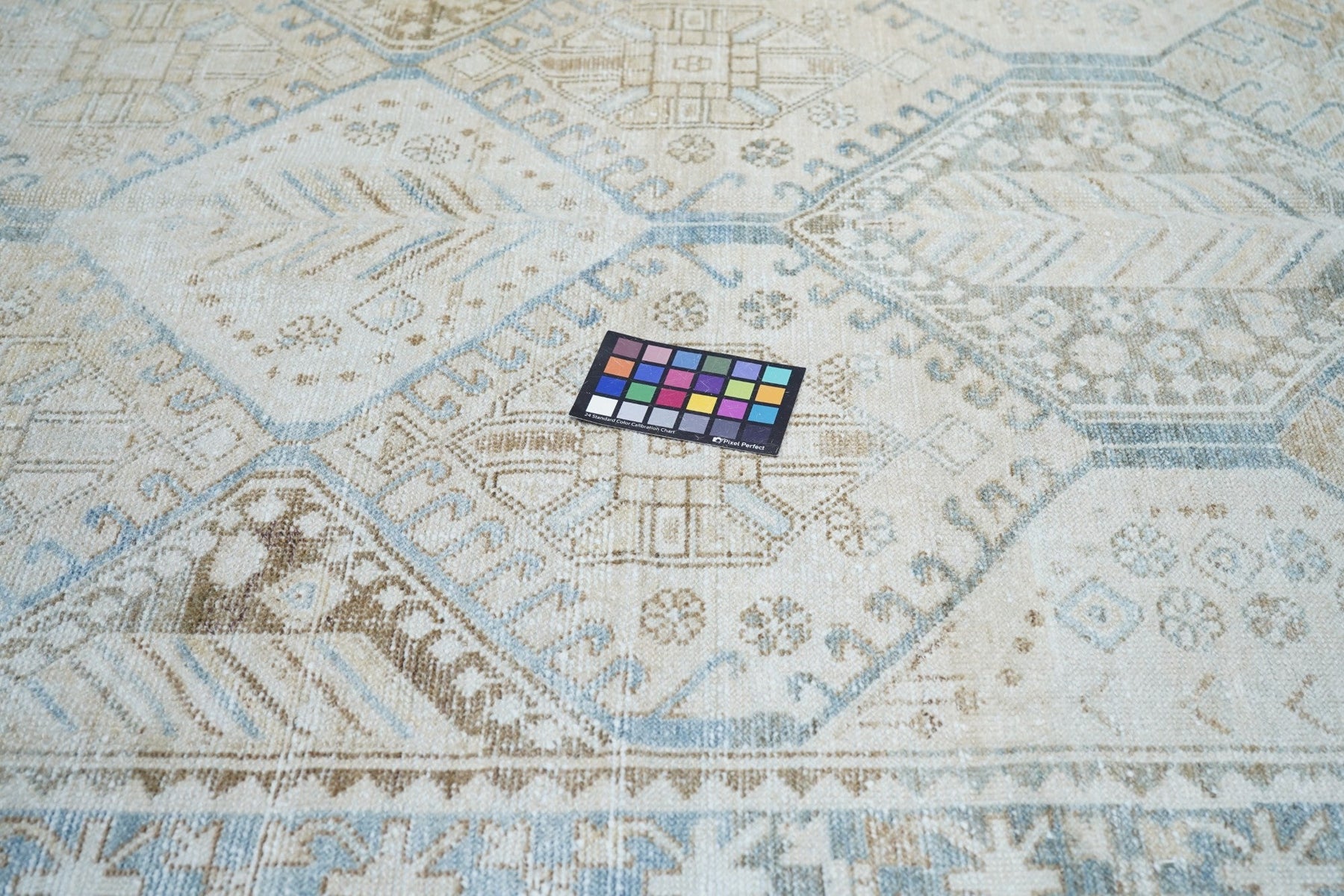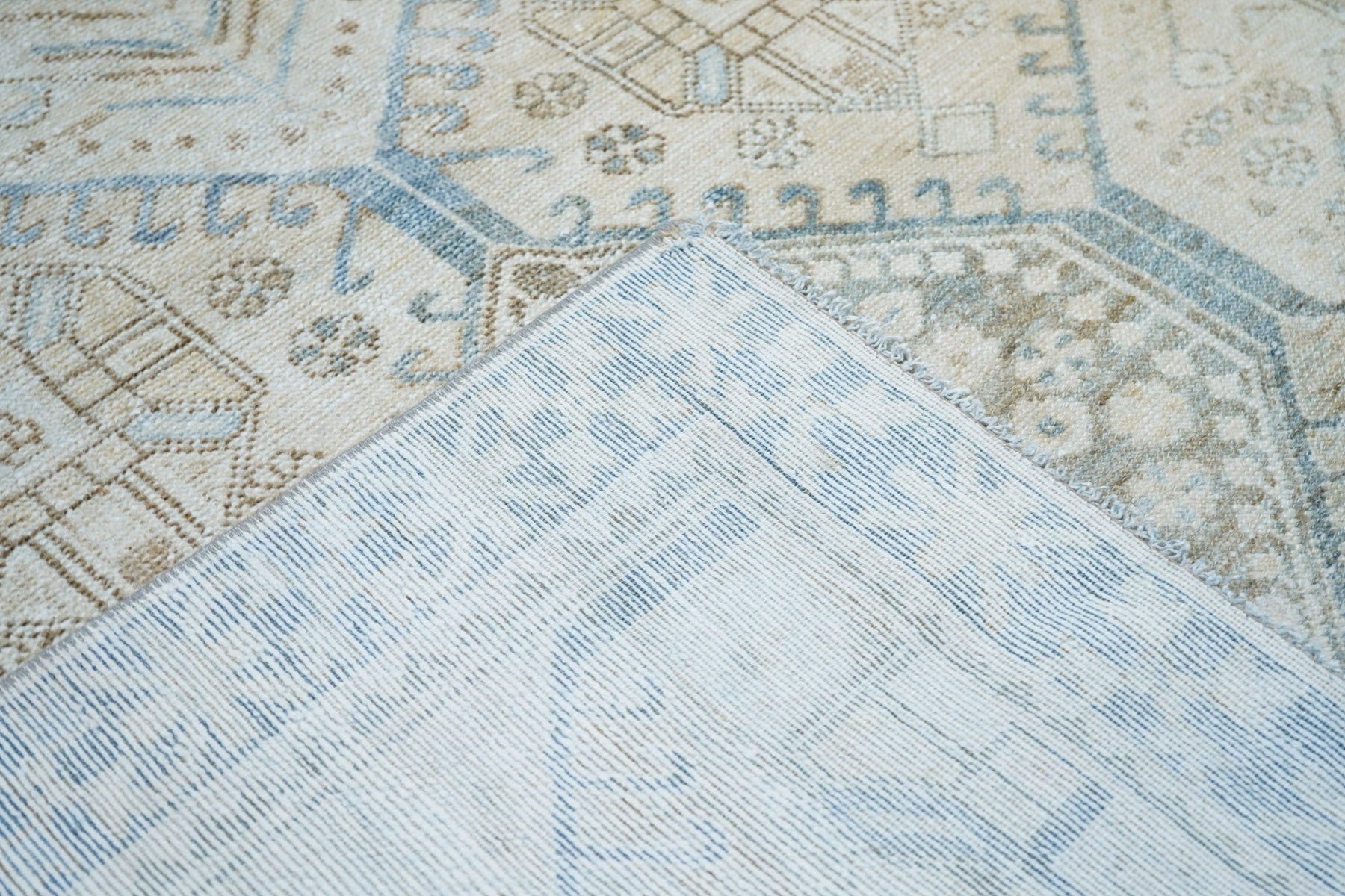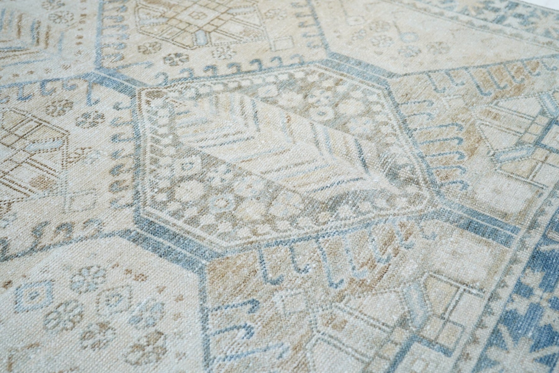 In a much reduced palette instead of the usual saturated one, this Chahar Mahal district village scatter presents a large, allover hooked hexagon design in cream, rust and straw, with feathers or abstract four palmette crosses within. Abrashed light blue border with "Union Jack" modules. Moderate weave. Good condition.