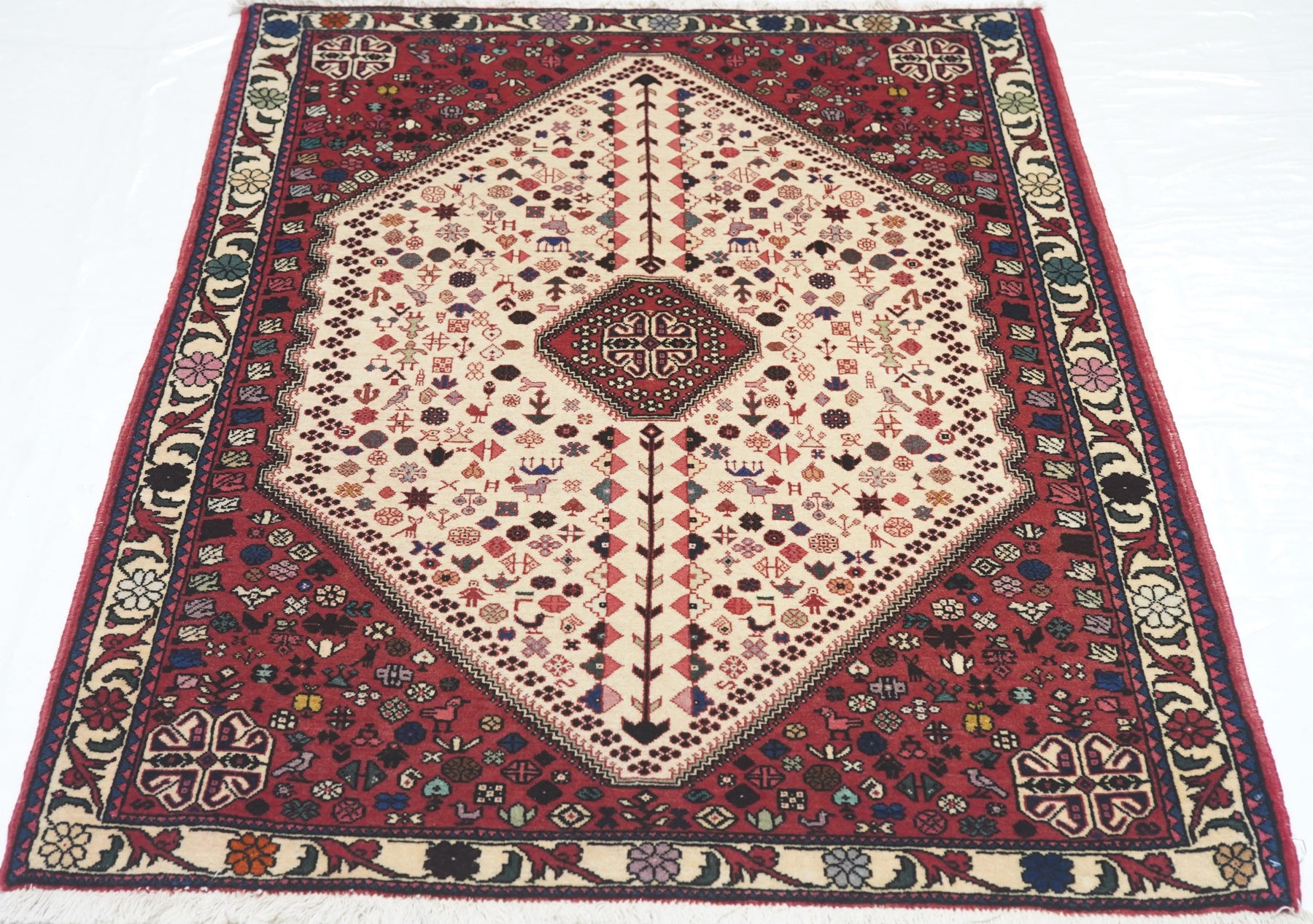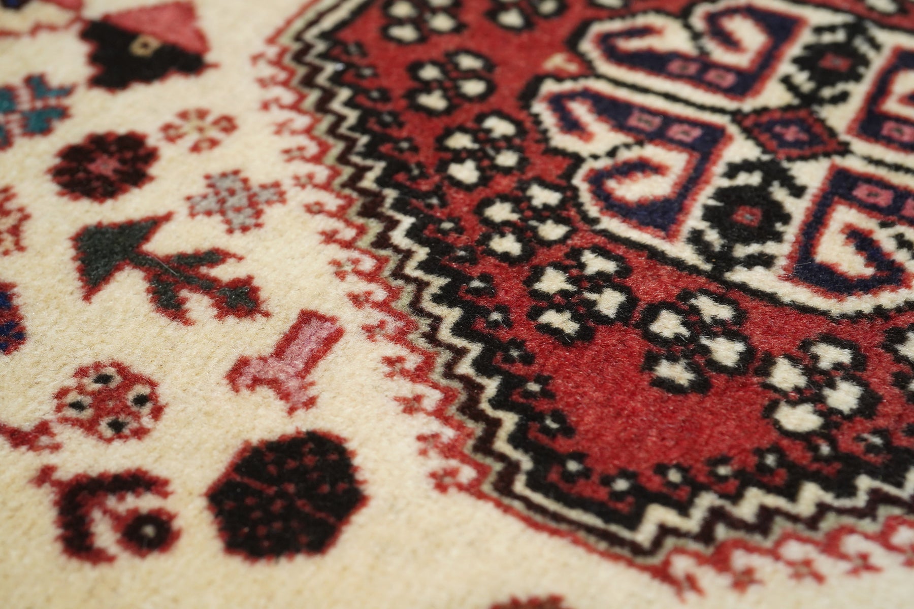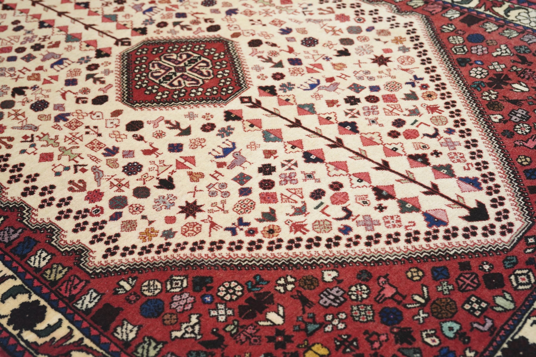 The red field shows a myriad of small rosettes, all moving around the laterally notched, lozenge-shaped ecru sub-field with a bird, flower, octagon and two stick figure pattern. Ivory corner volute knots mimic the central motif on red. Sand main border with petal rosettes and a barbed acanthus meander. As new condition.