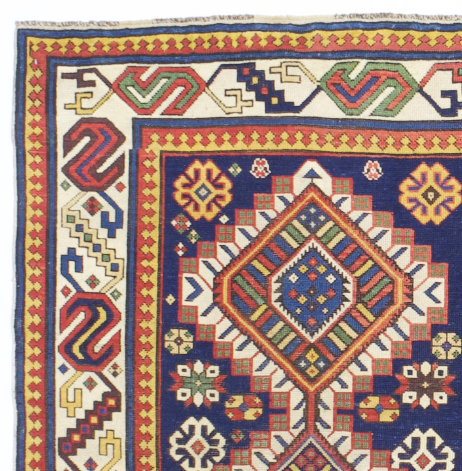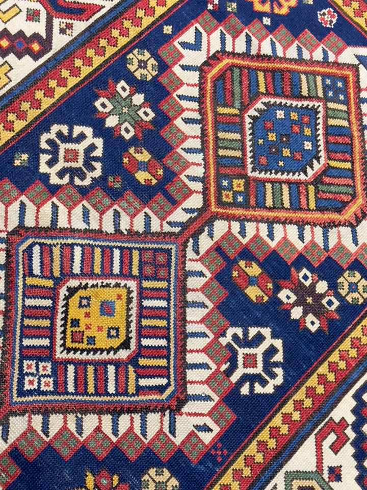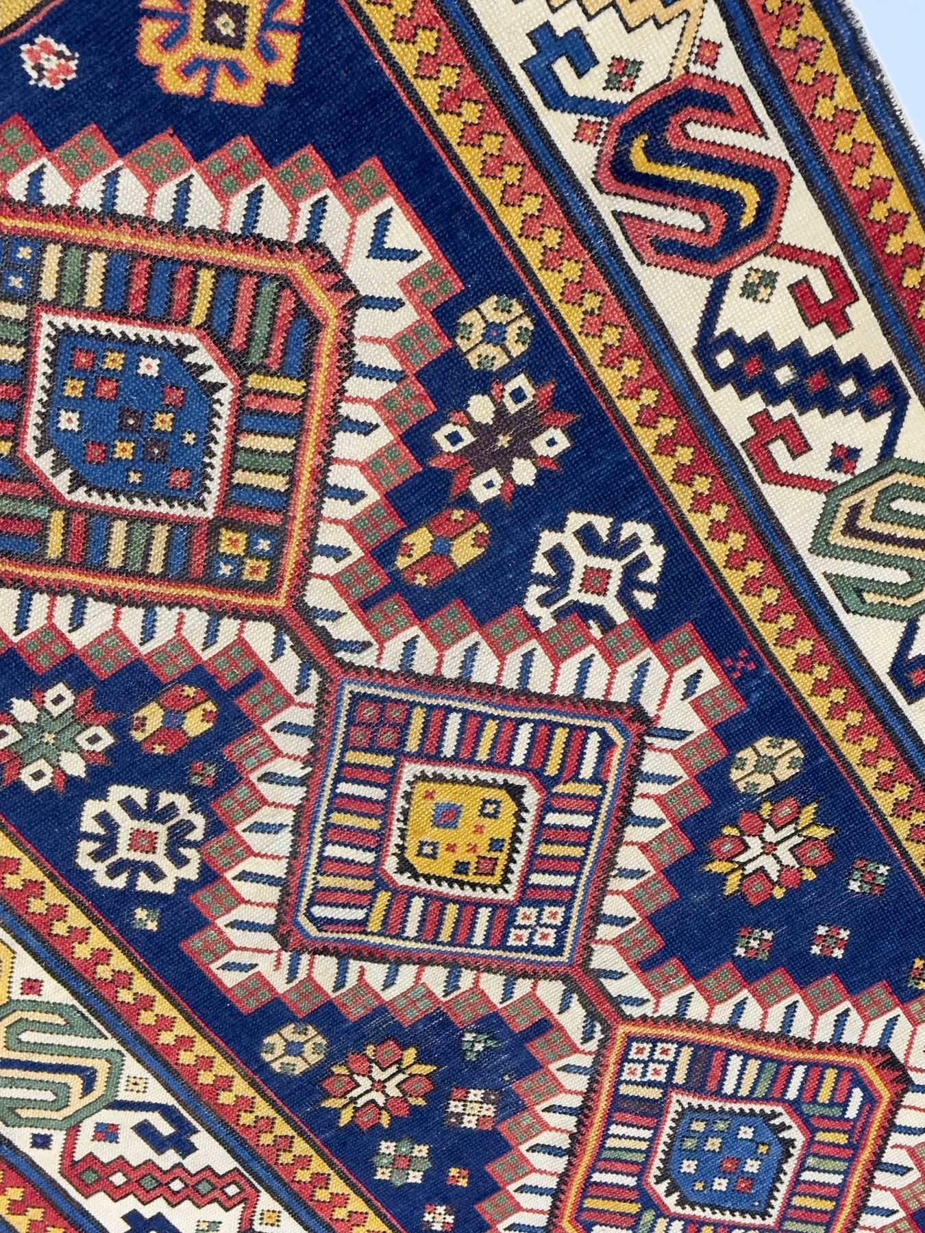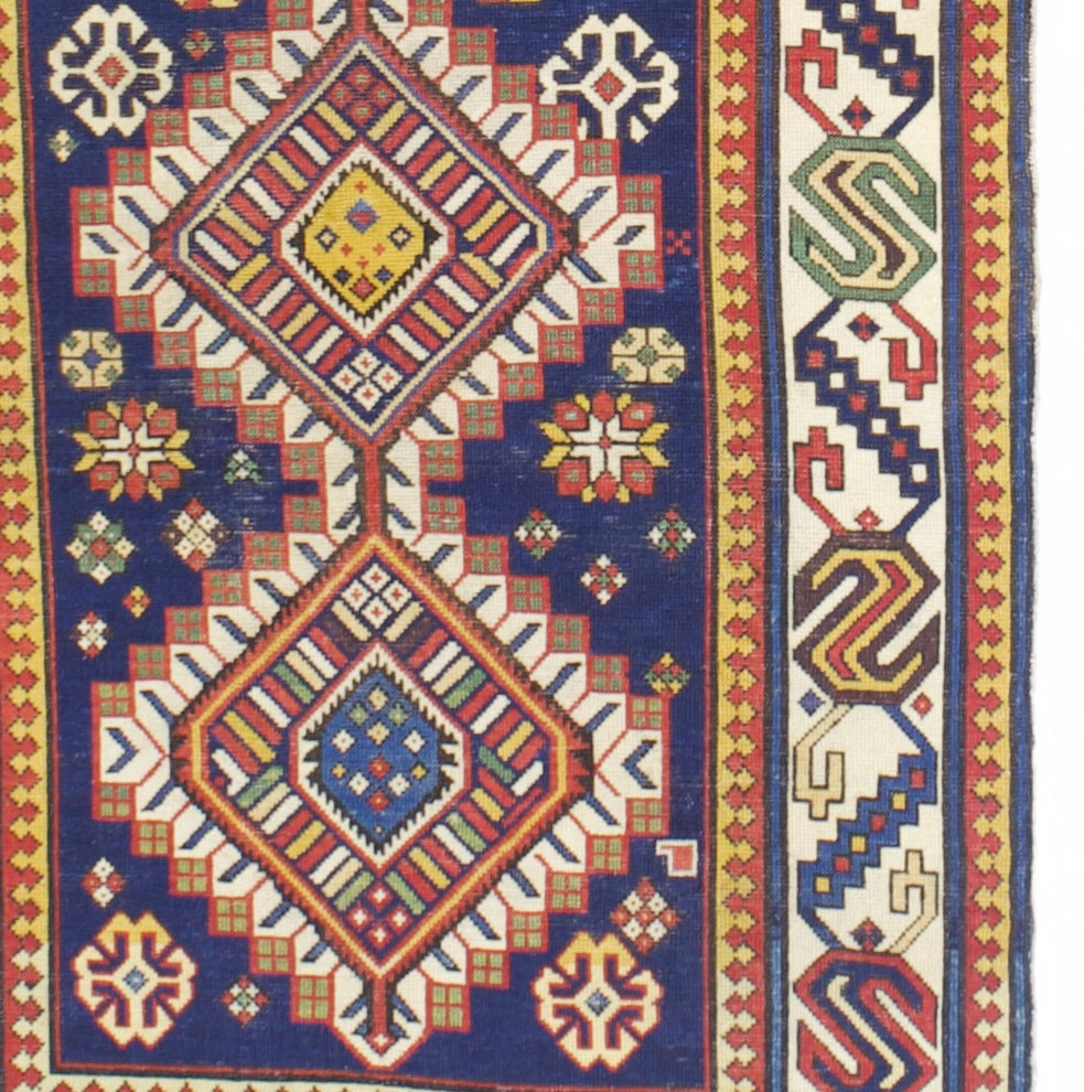 Eastern Caucasian, west Caspian Caucasian rugs, primarily scatters, in geometric layouts, some prayer, from a wide range of local villages. Marasali prayer rugs are considered as the best.. Some pictorials. Wool warps, often cotton wefts. Lowish pile, moderate to fine weaves. Natural dyes exclusively until 1890’s, then synthetics appear.