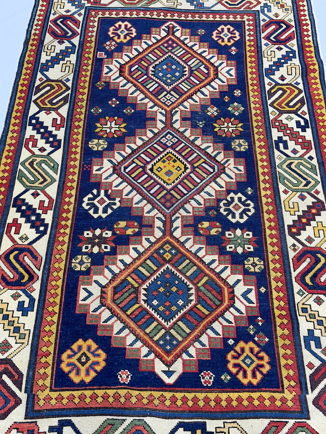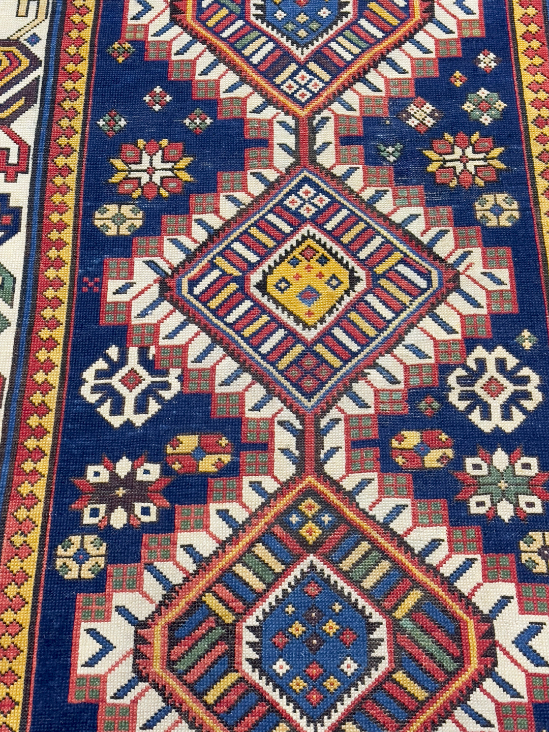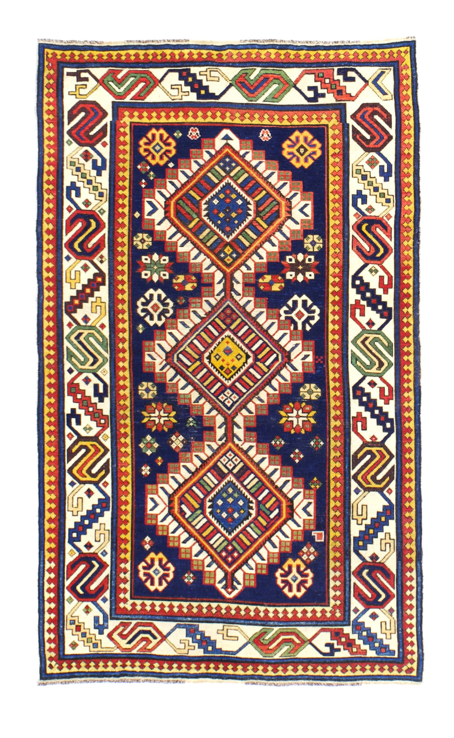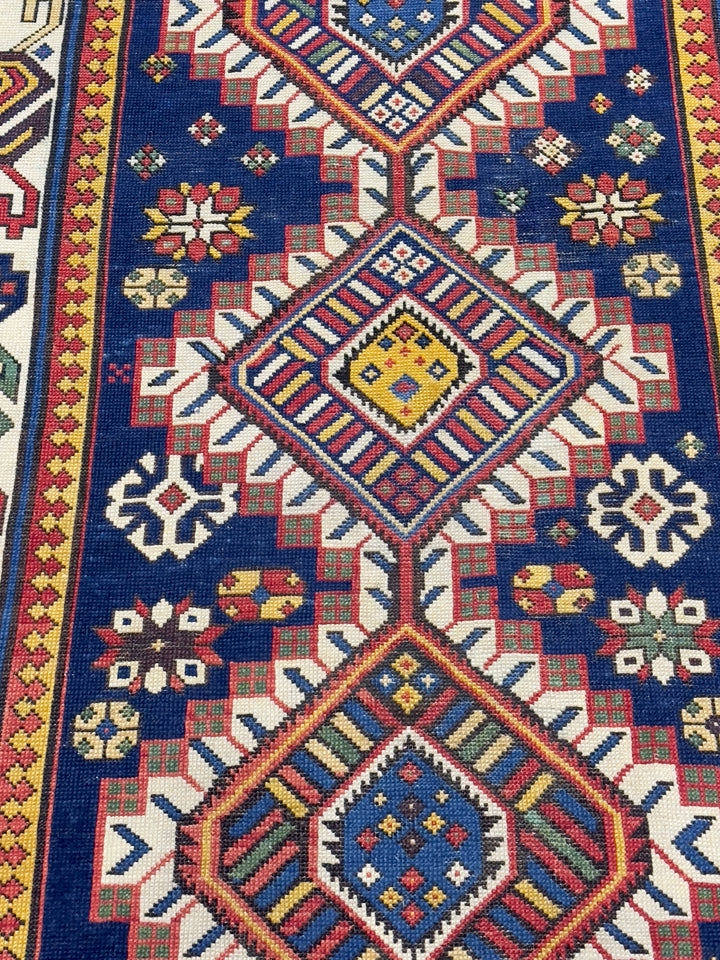 Eastern Caucasian, west Caspian Caucasian rugs, primarily scatters, in geometric layouts, some prayer, from a wide range of local villages. Marasali prayer rugs are considered as the best.. Some pictorials. Wool warps, often cotton wefts. Lowish pile, moderate to fine weaves. Natural dyes exclusively until 1890’s, then synthetics appear.