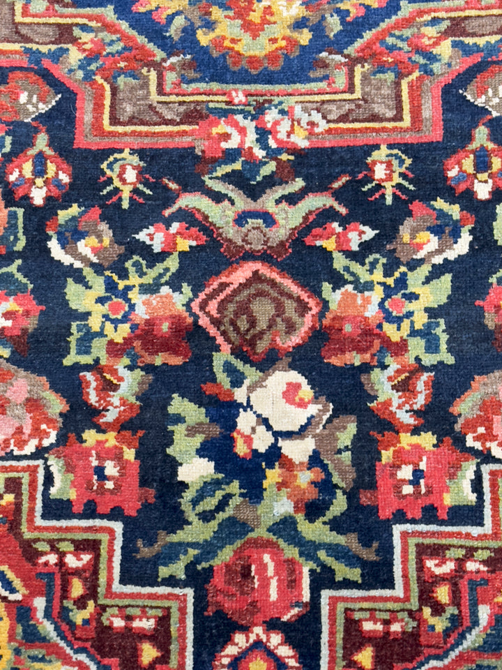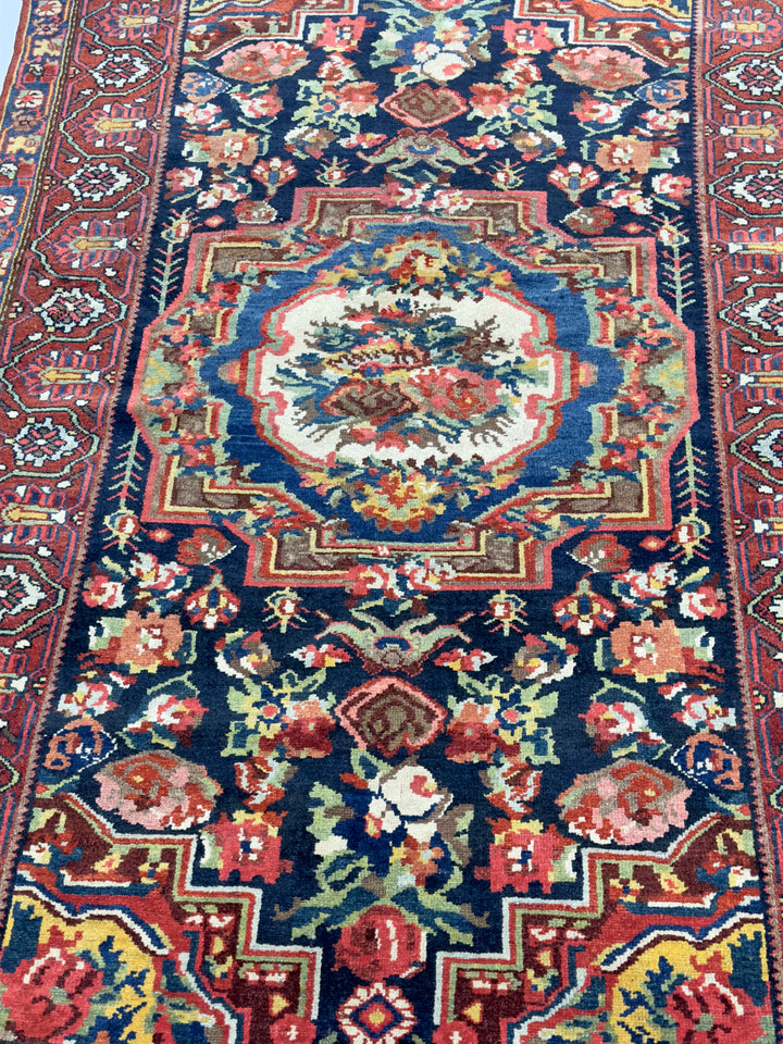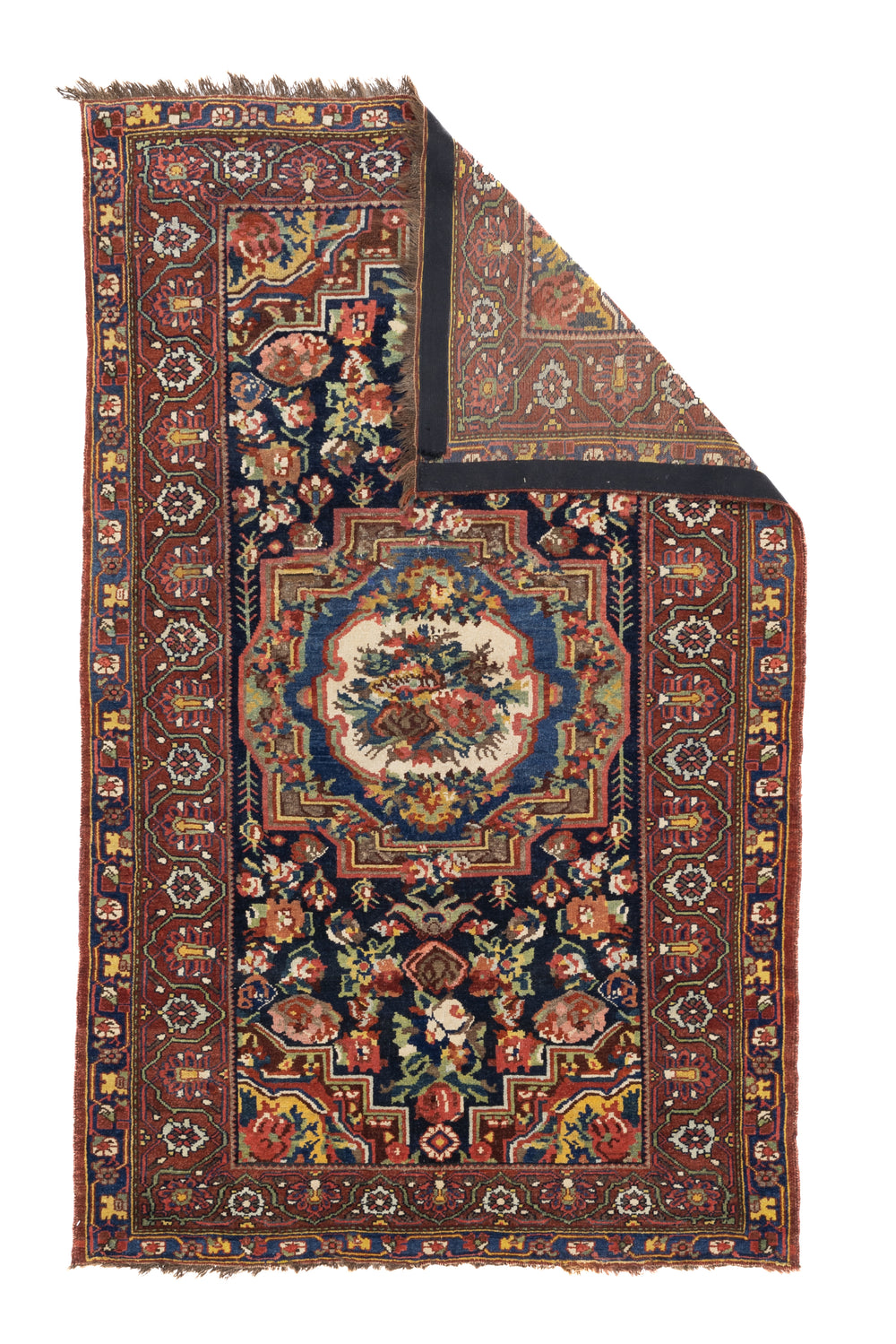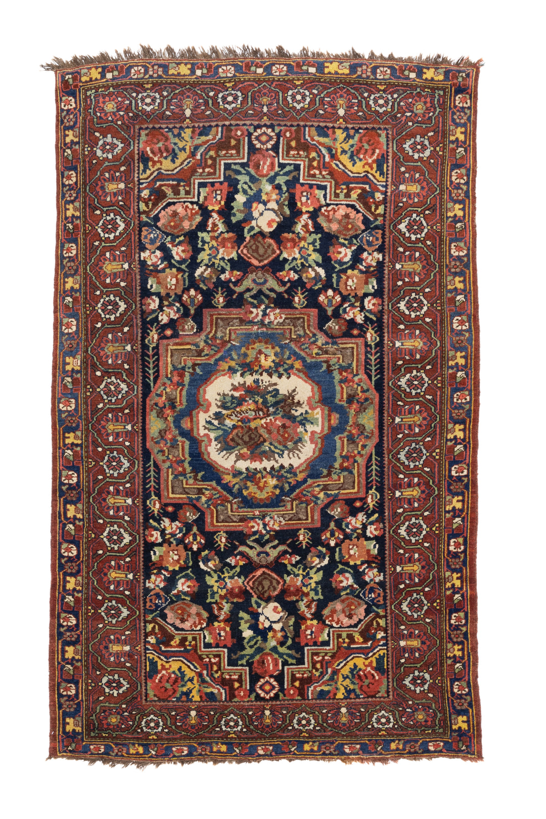 The generic name for the village rugs of the Chahar Mahal district in west-central Persia. On cotton, frequently single-wefted, often room size, with medallions. “garden” panel patterns, allovers, in semi-geometric drawing and with saturated palettes. Also refers to the local migratory nomads famous for their pile and sumak mixed technique large bags. Moderate weave.