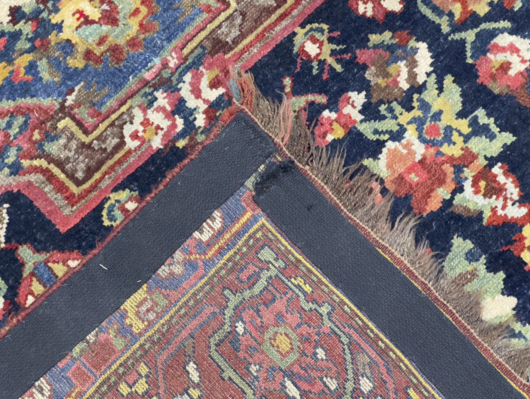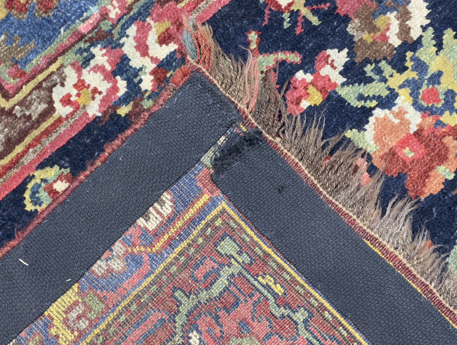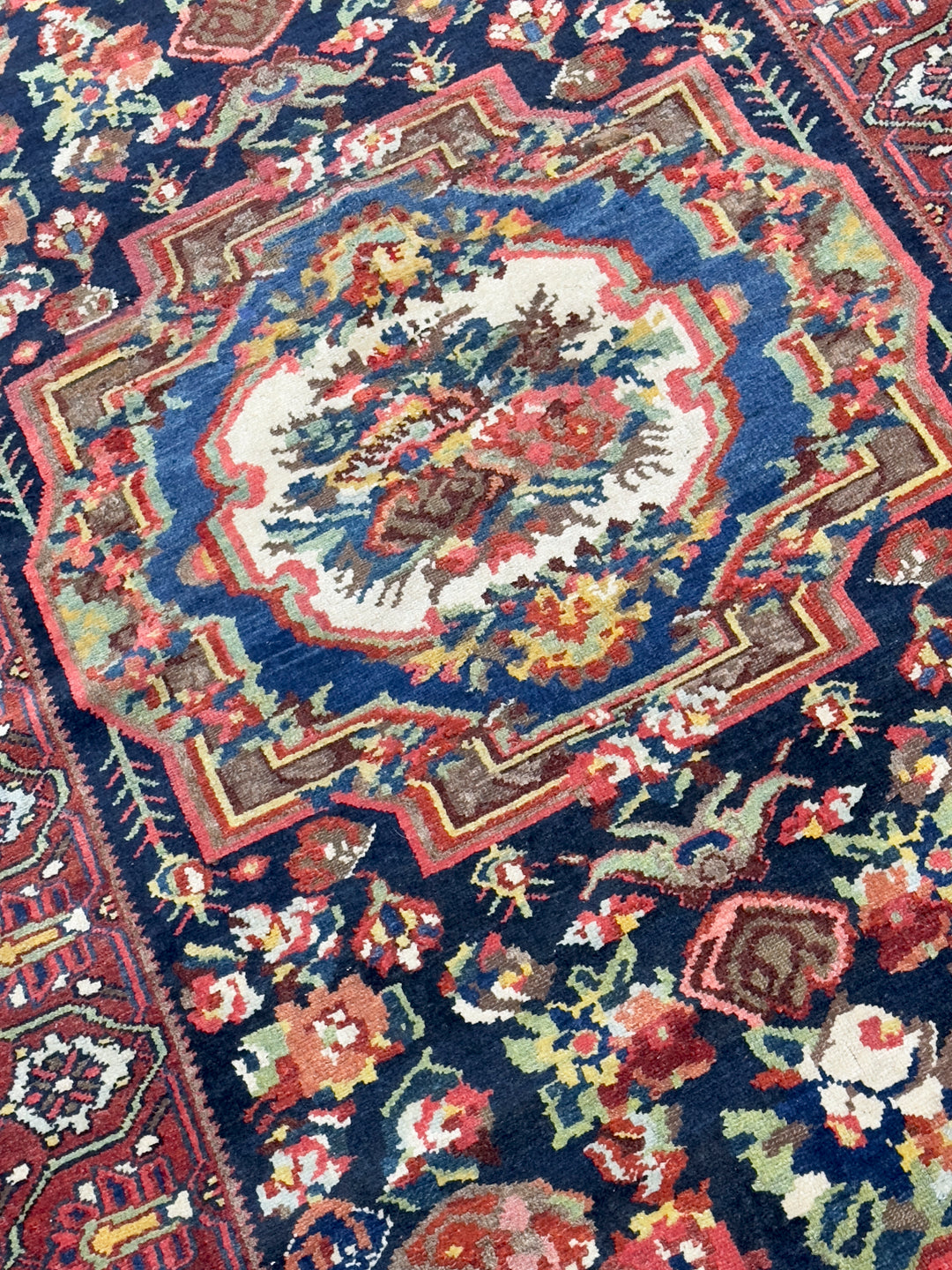The generic name for the village rugs of the Chahar Mahal district in west-central Persia. On cotton, frequently single-wefted, often room size, with medallions. “garden” panel patterns, allovers, in semi-geometric drawing and with saturated palettes. Also refers to the local migratory nomads famous for their pile and sumak mixed technique large bags. Moderate weave.