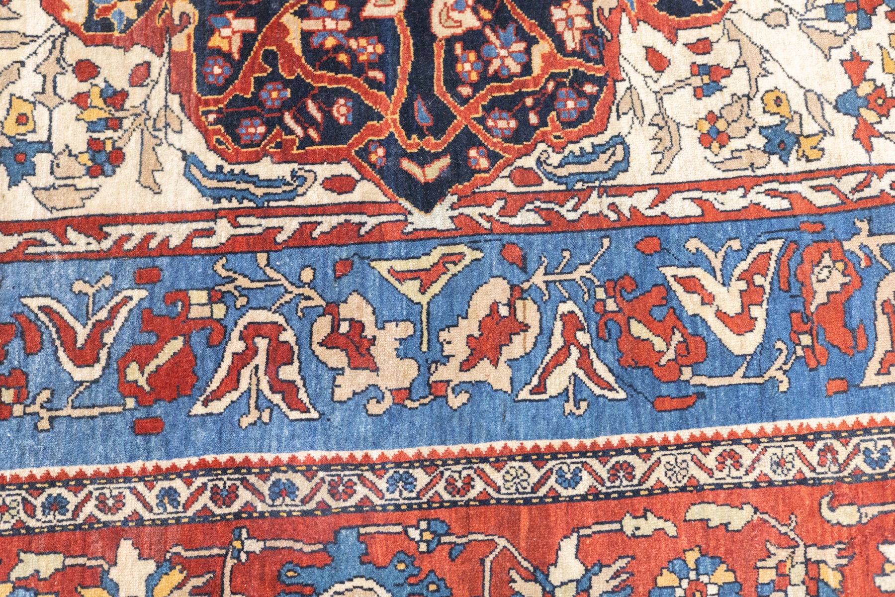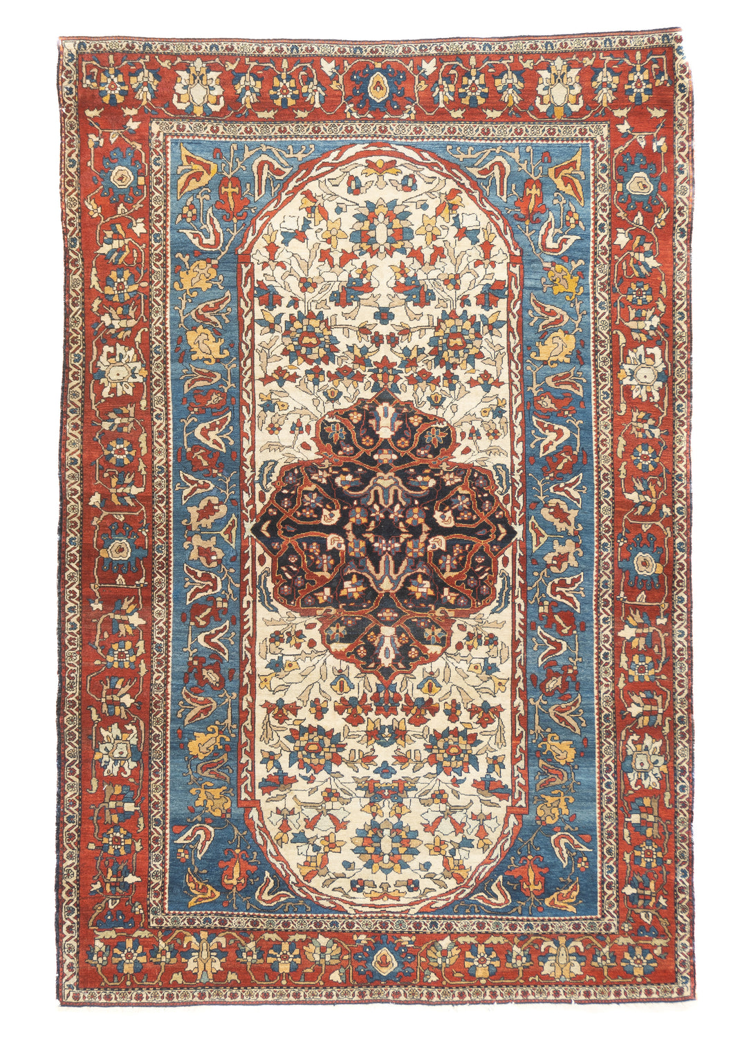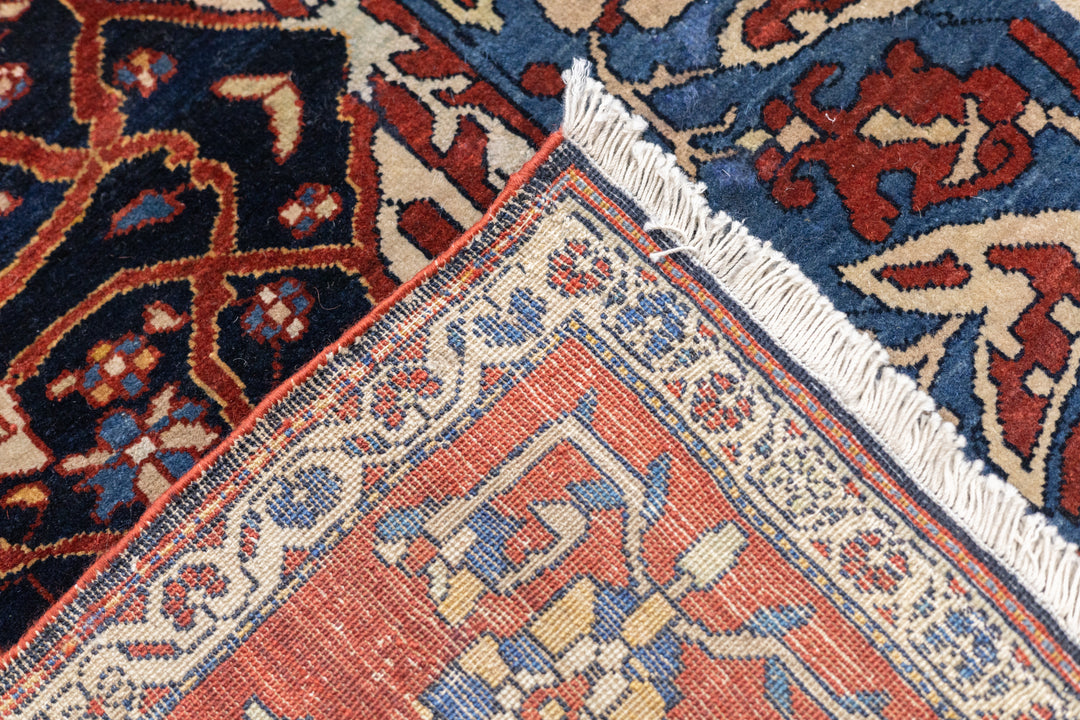 The scatter and room size pieces made in the Arak/Sultanabad area, between 1880 and 1910, with firm and leathery well-woven textures, and strong in red, navy and ecru tones, usually in medallion formats. A transition group between the earlier 19th century Farahans and the post-WWI Sarouks. Drawing is between curvilinear and angular.