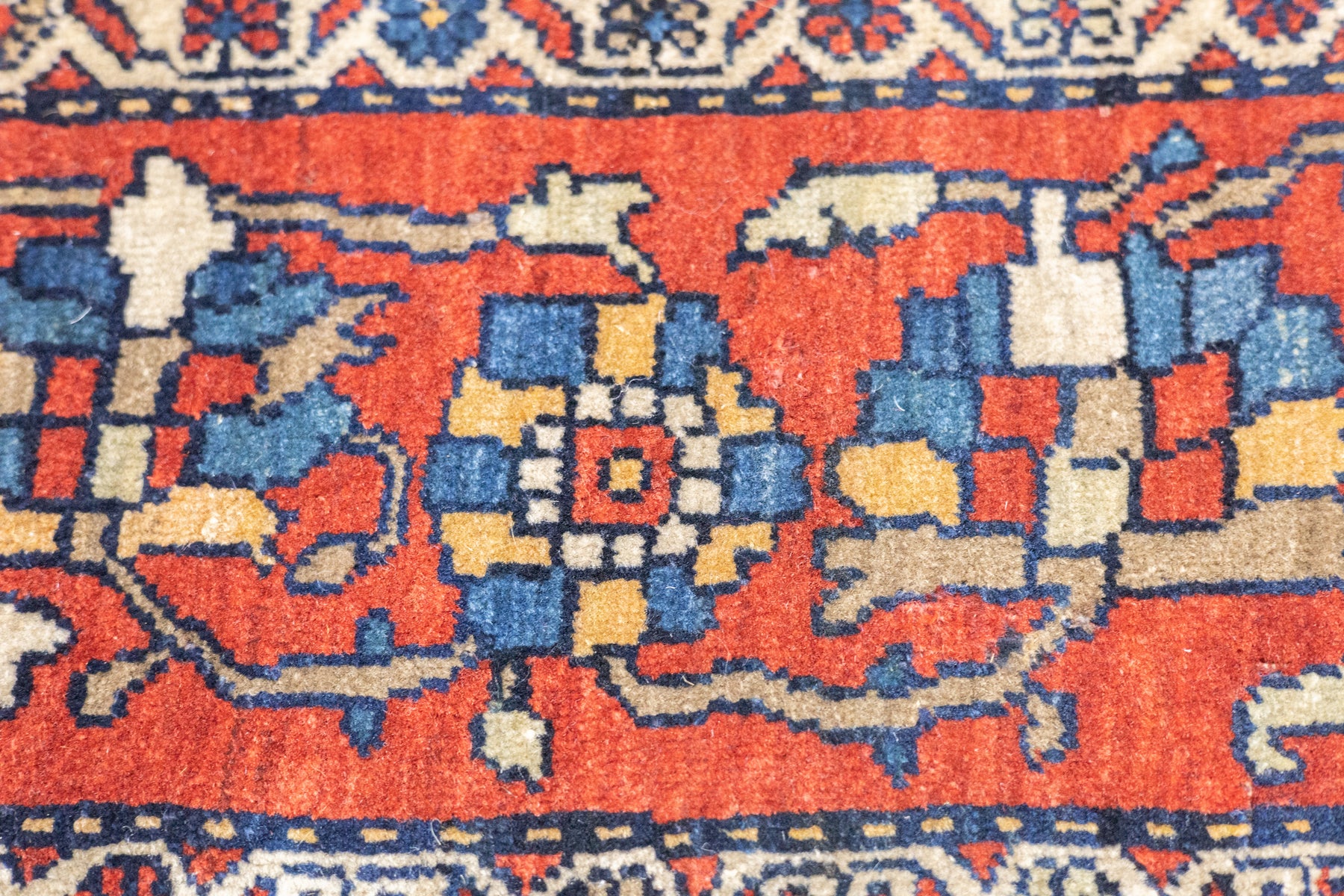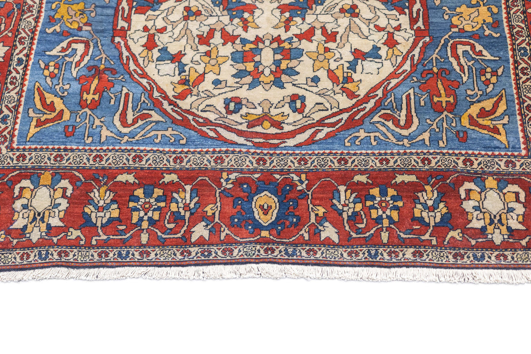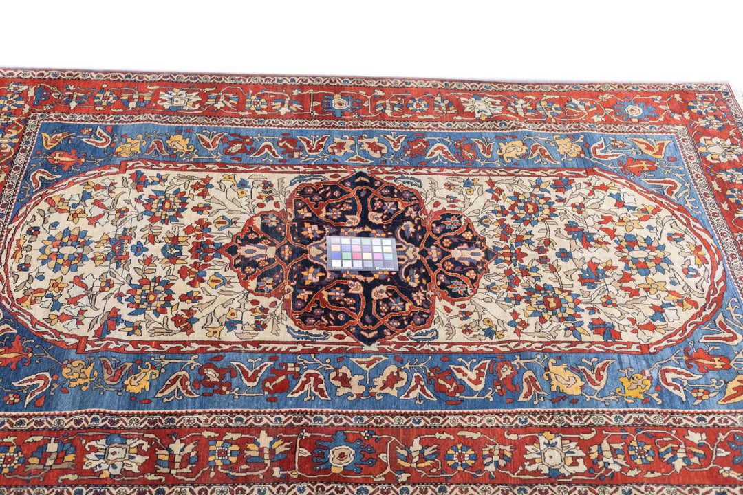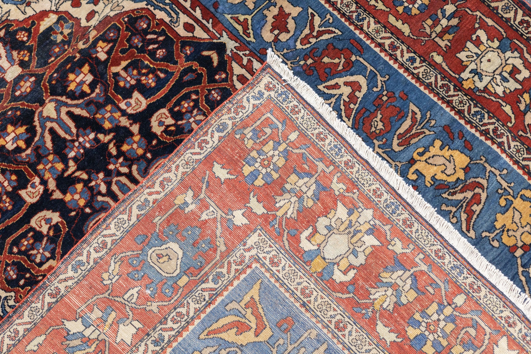 The scatter and room size pieces made in the Arak/Sultanabad area, between 1880 and 1910, with firm and leathery well-woven textures, and strong in red, navy and ecru tones, usually in medallion formats. A transition group between the earlier 19th century Farahans and the post-WWI Sarouks. Drawing is between curvilinear and angular.