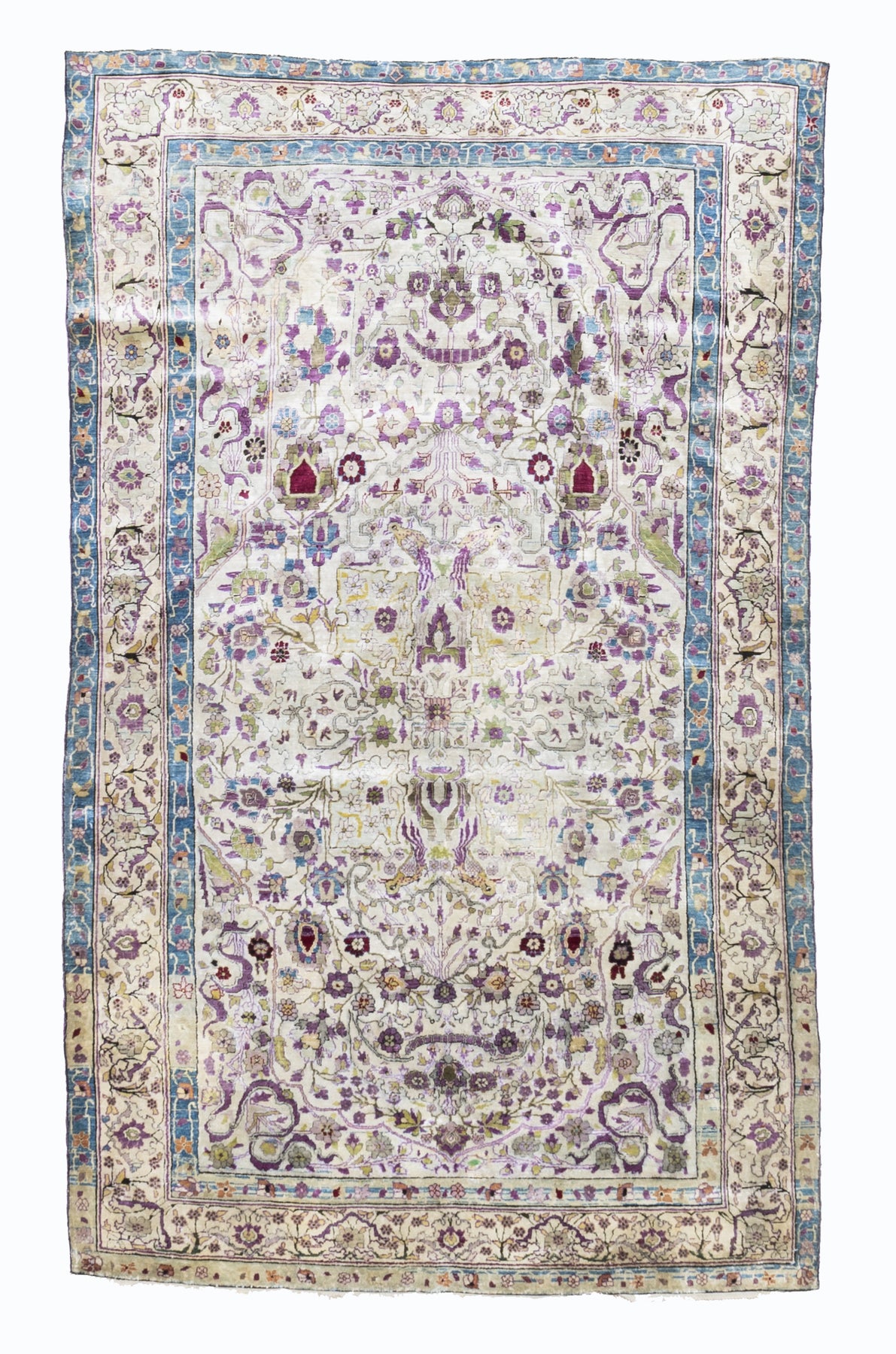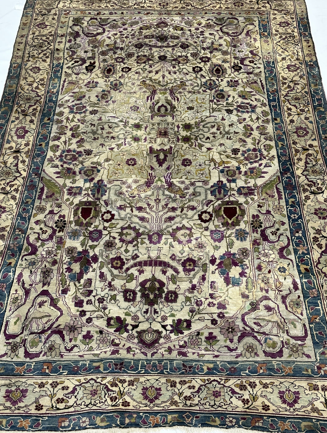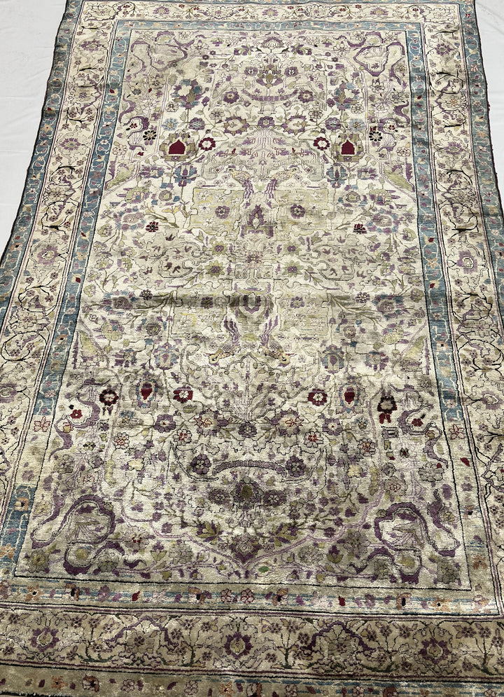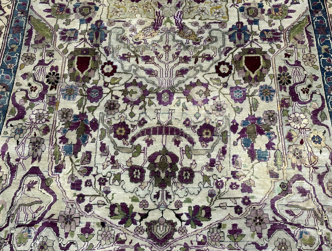 Antique Silk Persian Farahan Rug 3’11" x 6’11". The scatter and room size pieces made in the Arak/Sultanabad area, between 1880 and 1910, with firm and leathery well-woven textures, and strong in red, navy and ecru tones, usually in medallion formats. A transition group between the earlier 19th century Farahans and the post-WWI Sarouks. Drawing is between curvilinear and angular.
