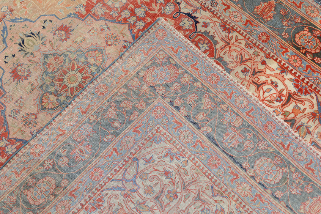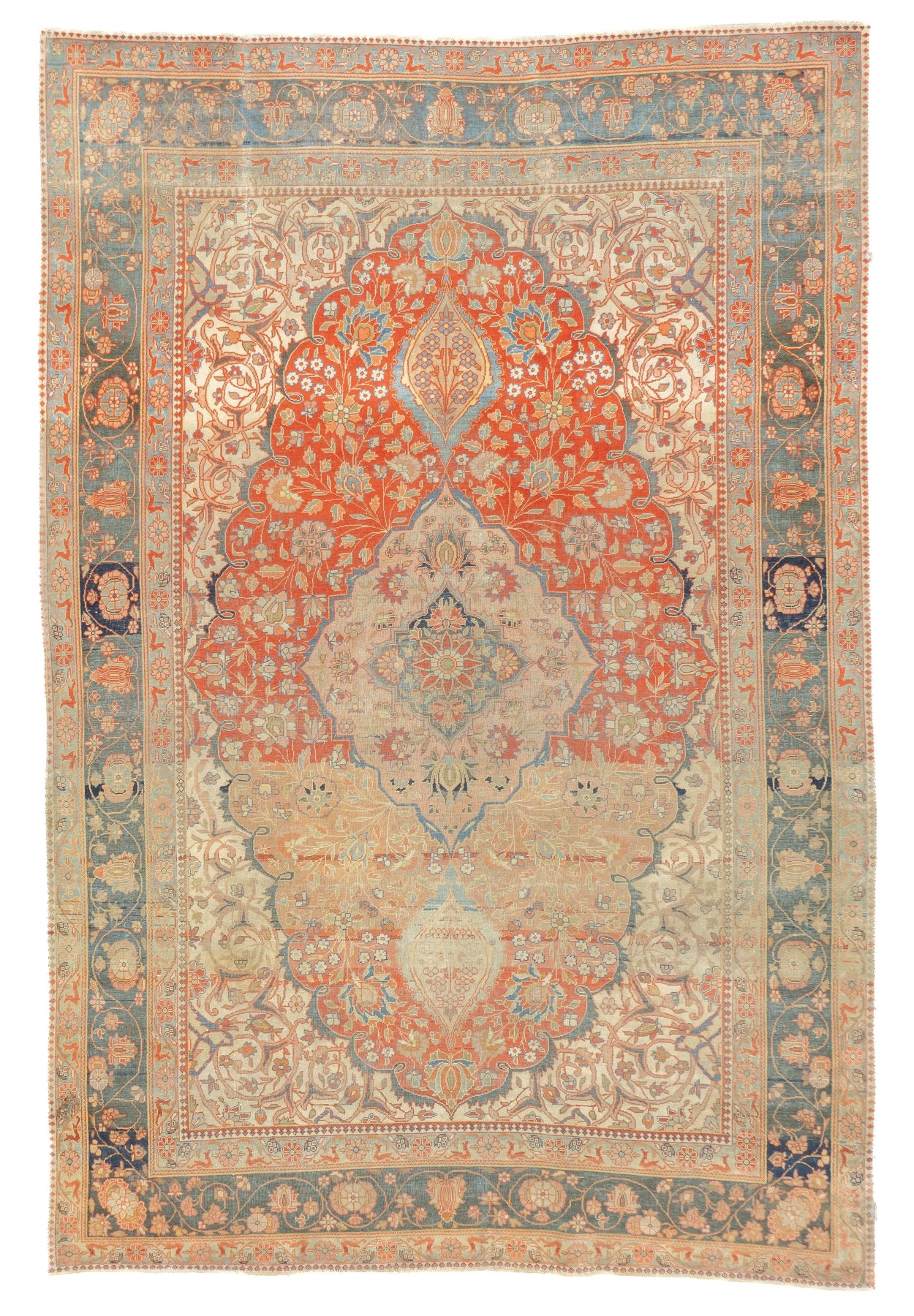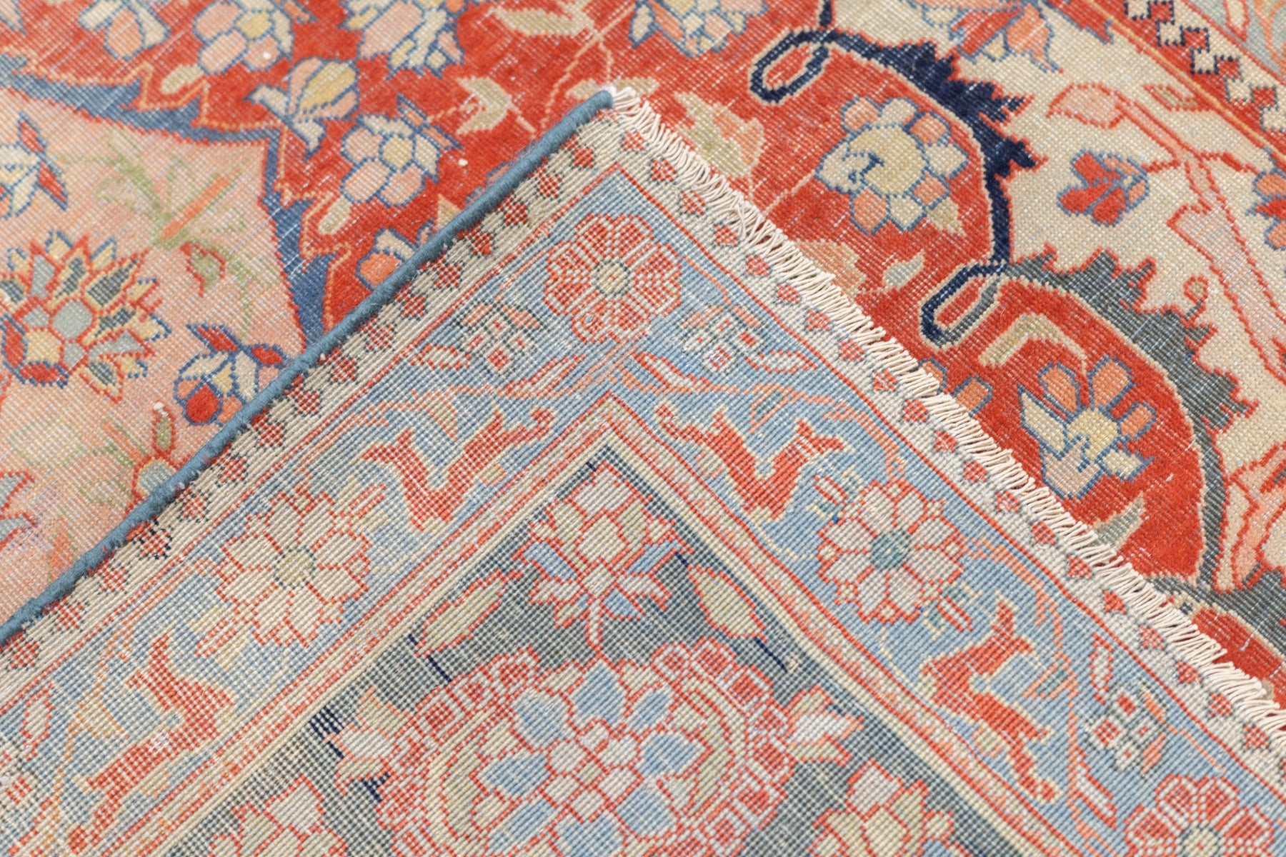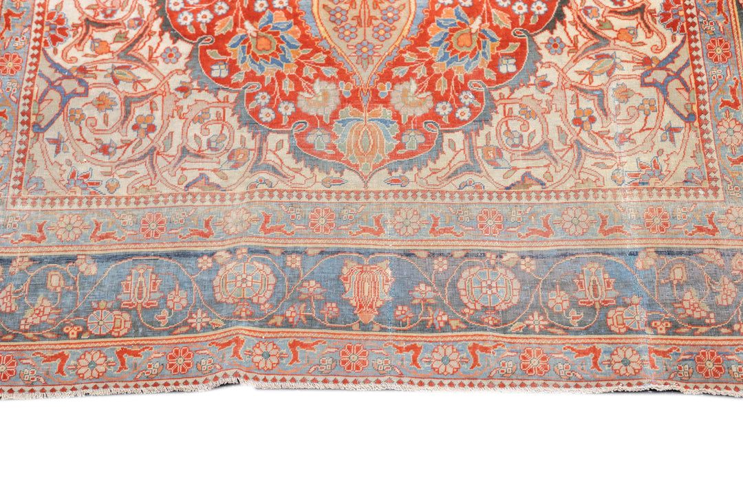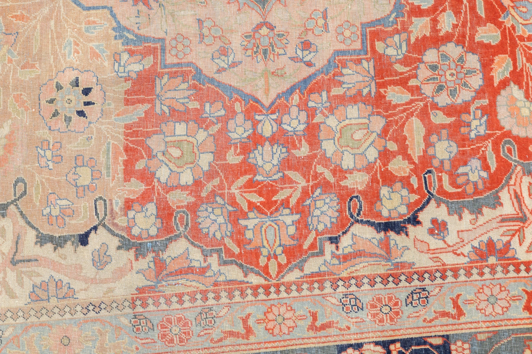 The rust red sub-field of this finely woven, central Persian workshop scatter panel abrashes to a light rusty coral. The sub-medallion abrashes in slate tones. The ogival pendants have palmette mini-pendants. Cream field with blue spiral arabesques at the corners. Strongly abrashed navy to light slate border. Cotton foundation. Short pile. Shows some wear.
