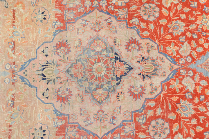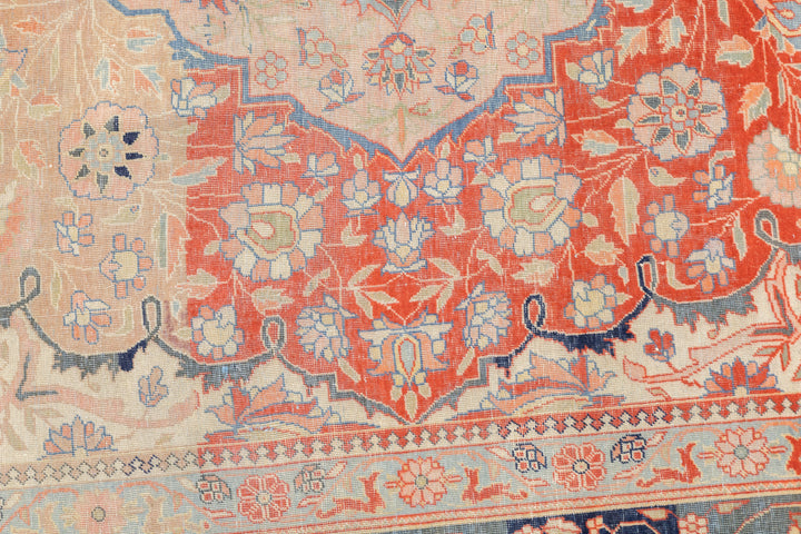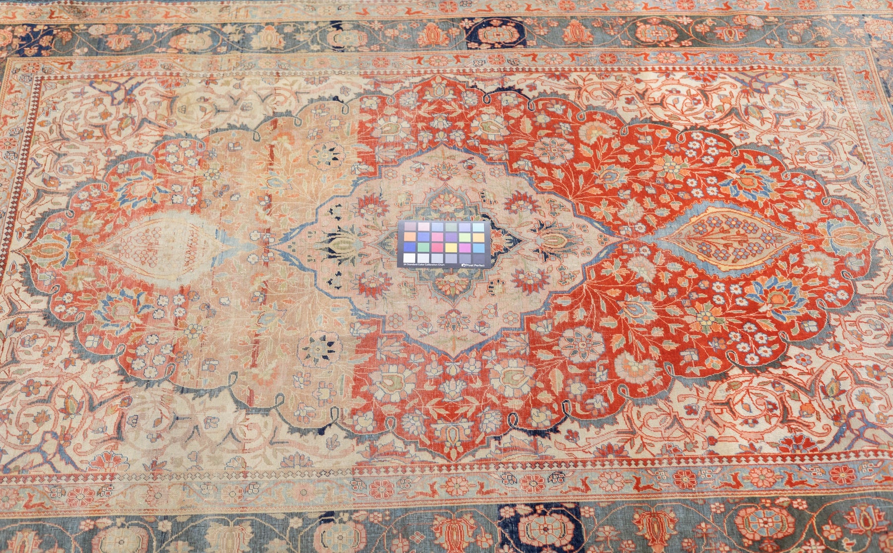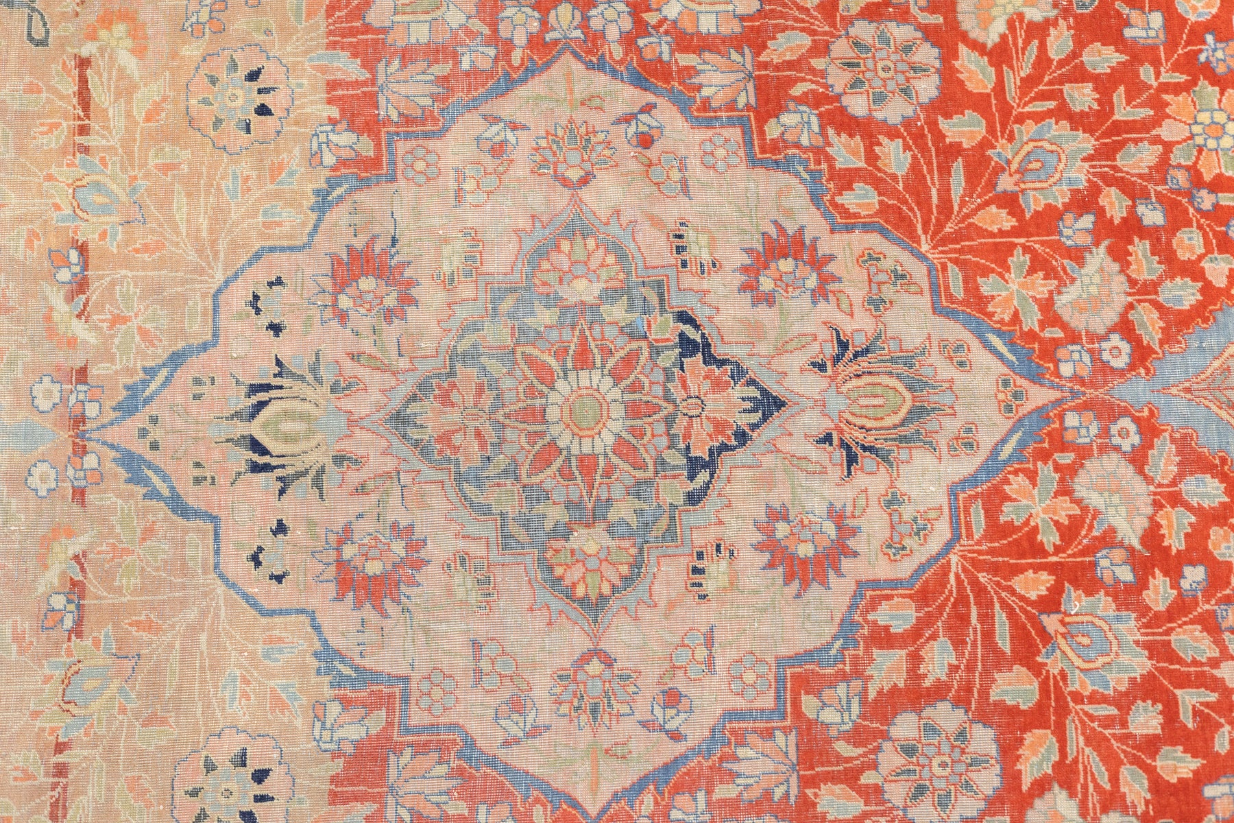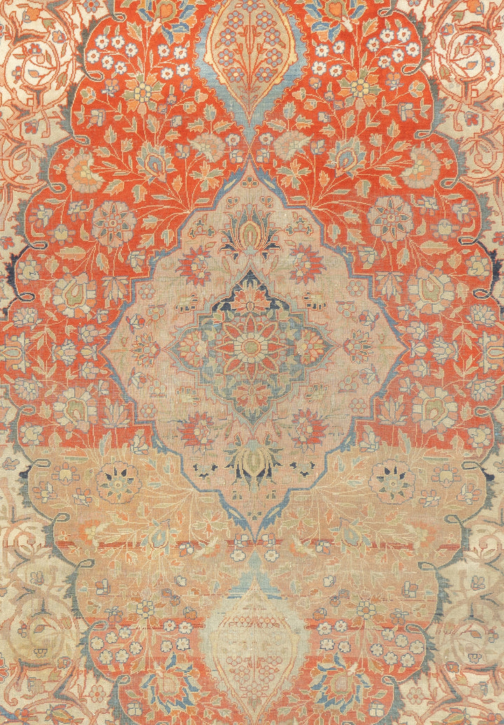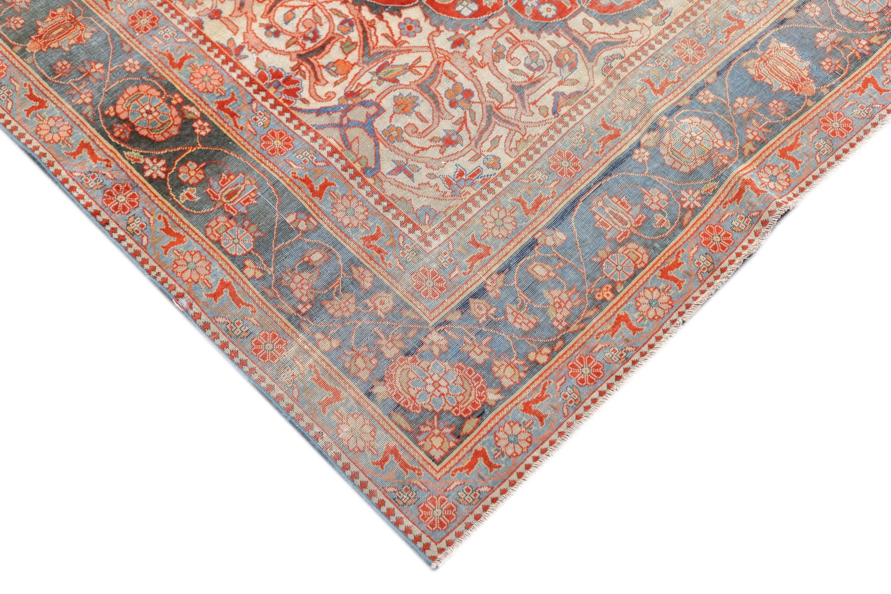 The rust red sub-field of this finely woven, central Persian workshop scatter panel abrashes to a light rusty coral. The sub-medallion abrashes in slate tones. The ogival pendants have palmette mini-pendants. Cream field with blue spiral arabesques at the corners. Strongly abrashed navy to light slate border. Cotton foundation. Short pile. Shows some wear.