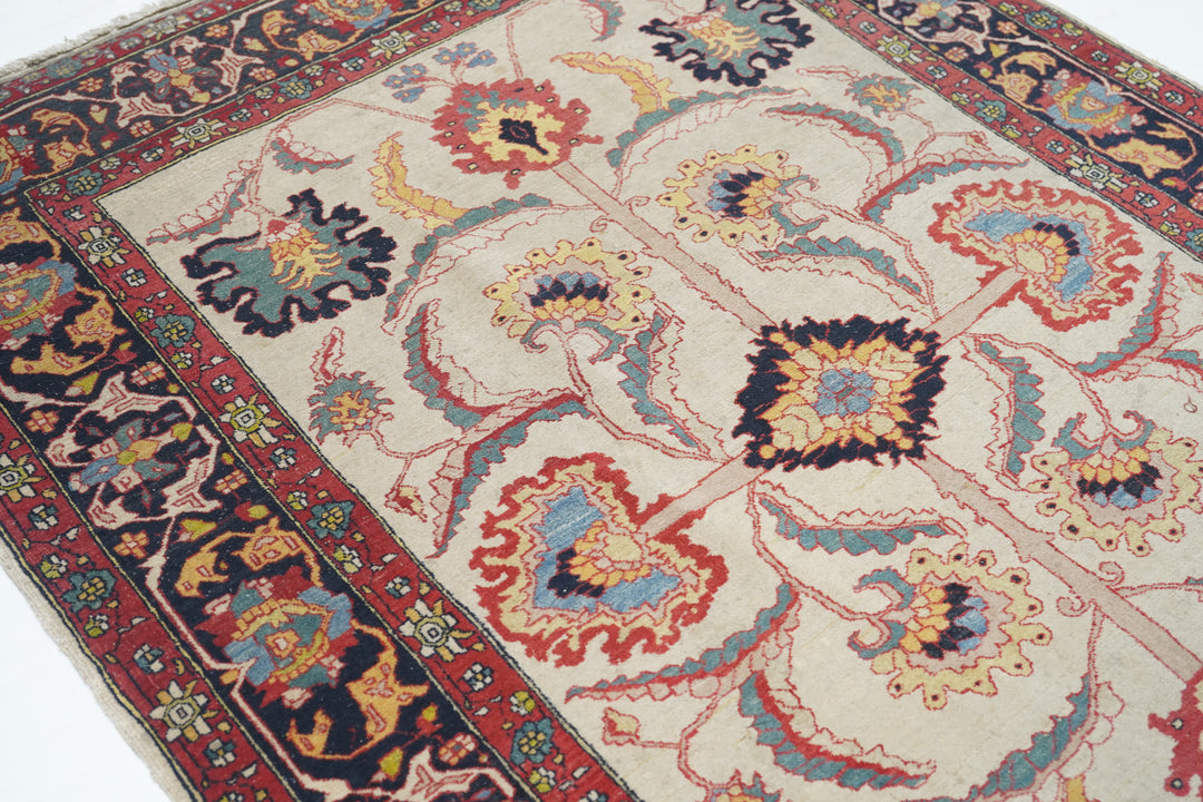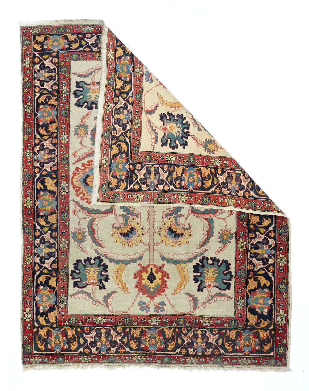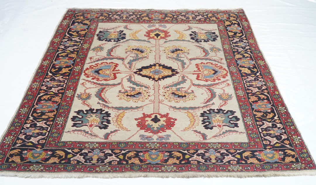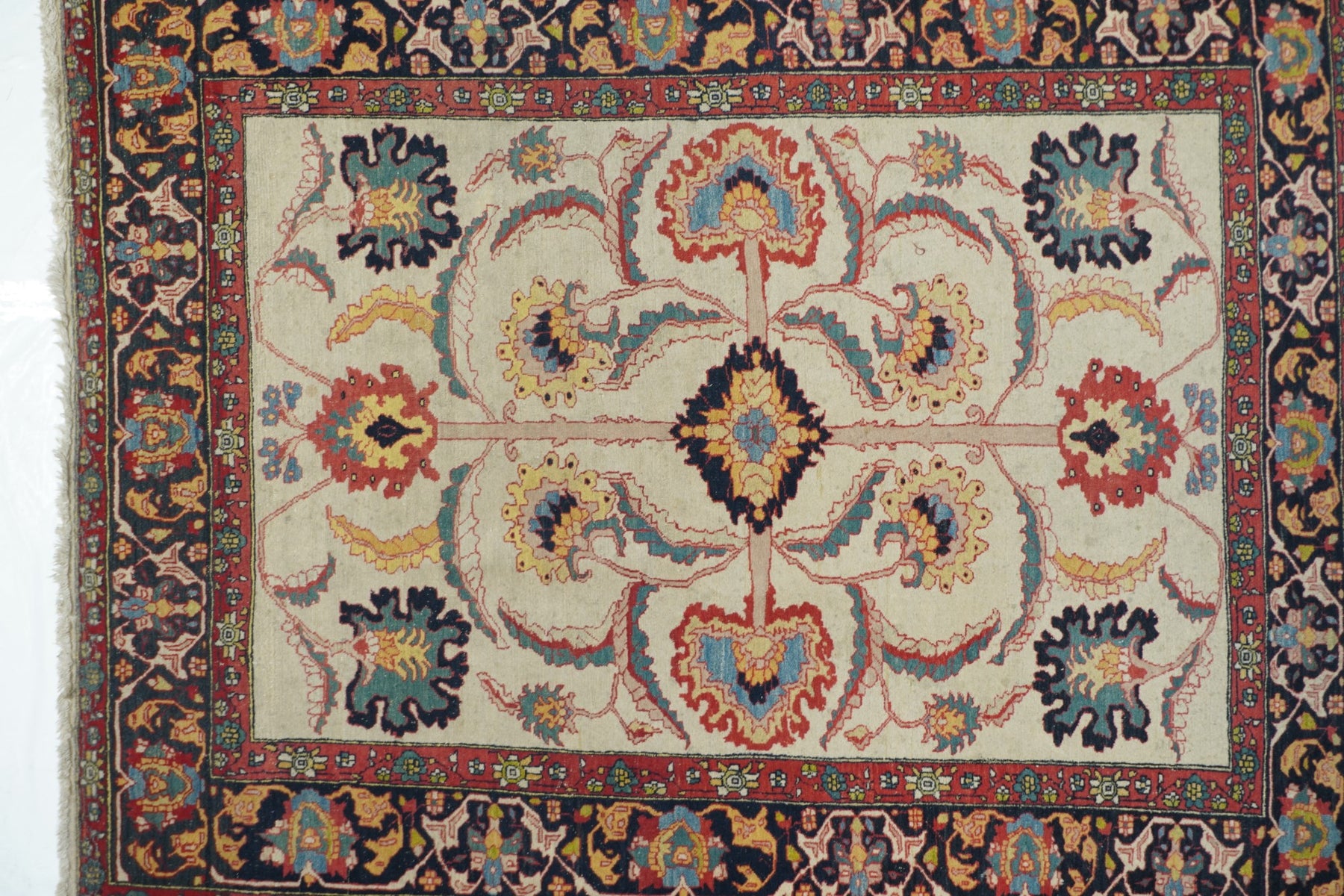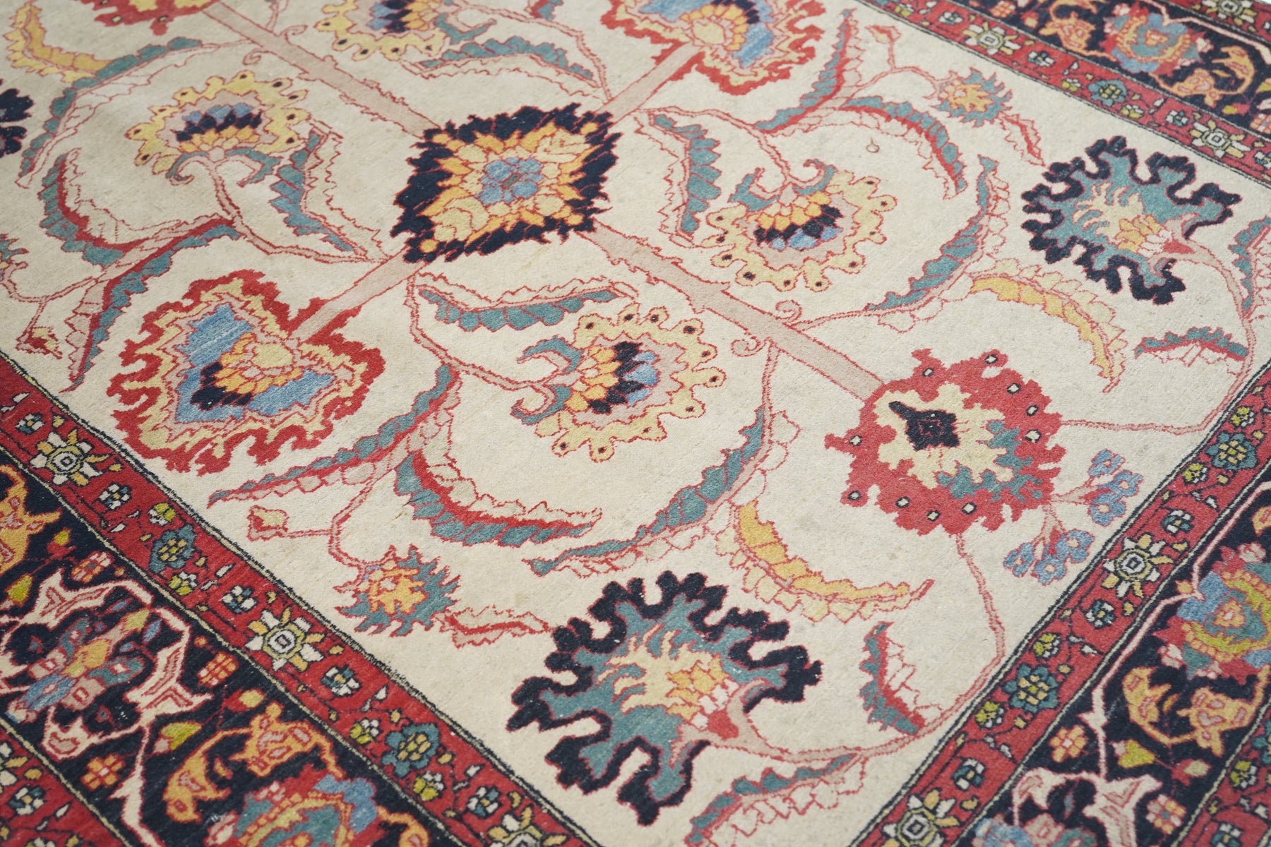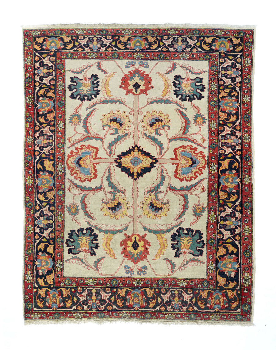 The straw-cream field presents a bold, long-armed organizing cross pattern with a black ragged lozenge centre and equally torn large palmette finials. More ragged palmettes and bitonal leaves, single and fork-paired continue the pattern dynamism. Navy border with inward palmettes and a barbed, leafy angular meander. More likely from the leathery weave and medium-fine knotting, a Ferahan-Sarouk from western Persia. Good condition.