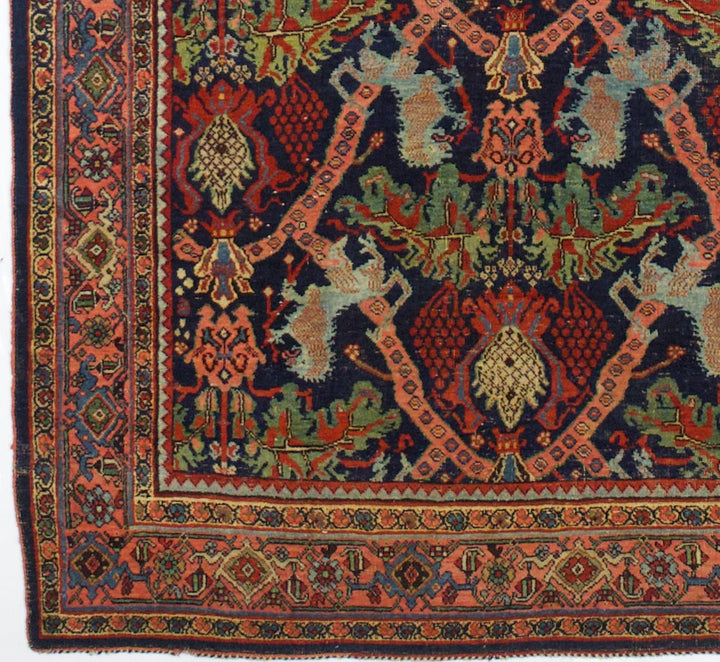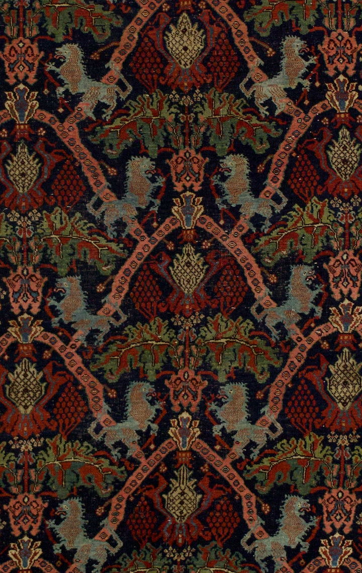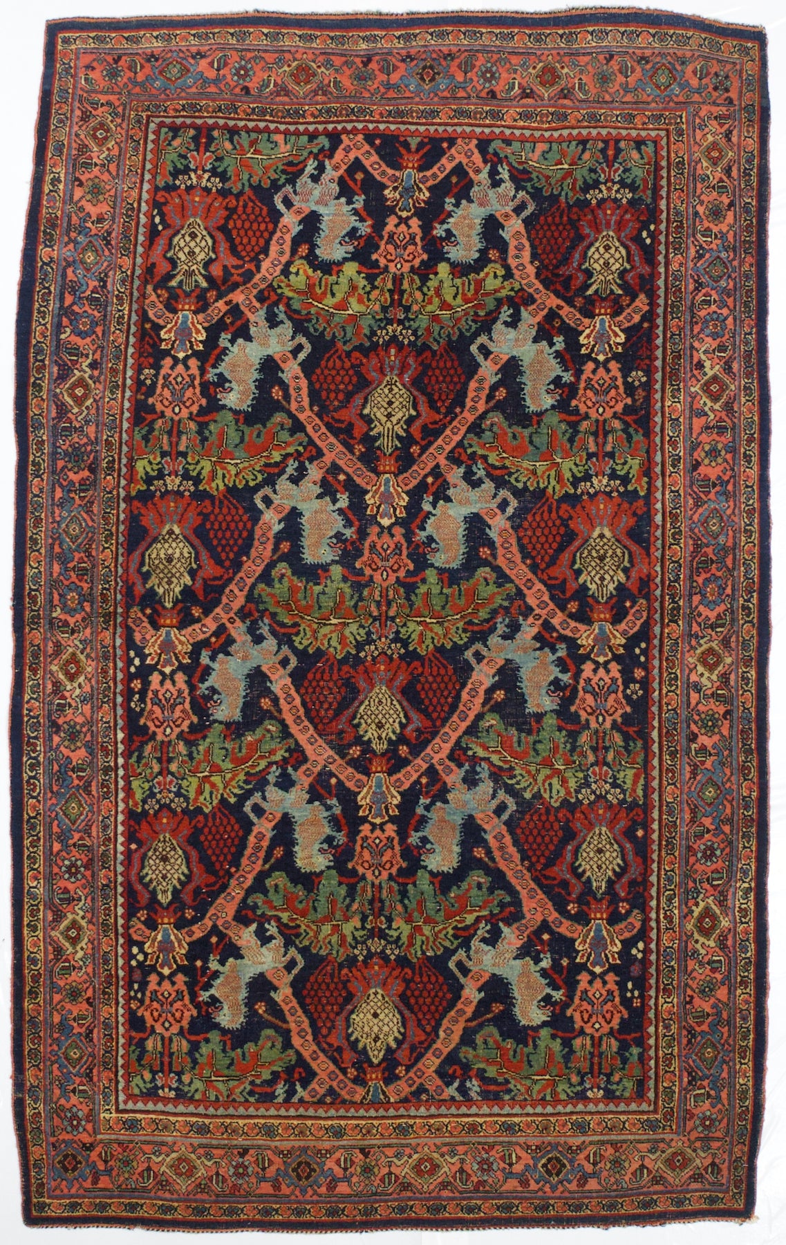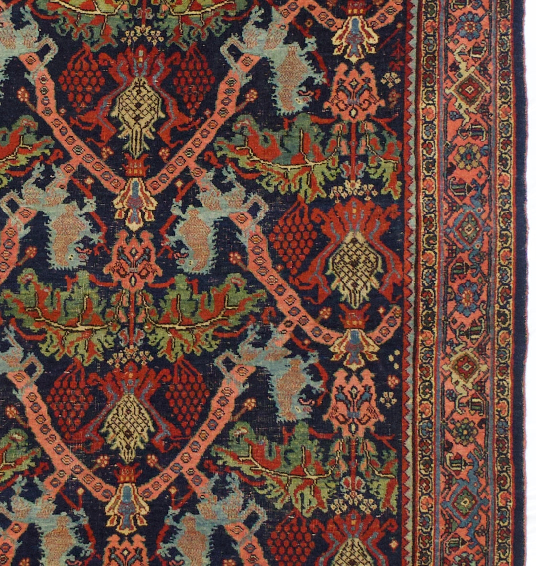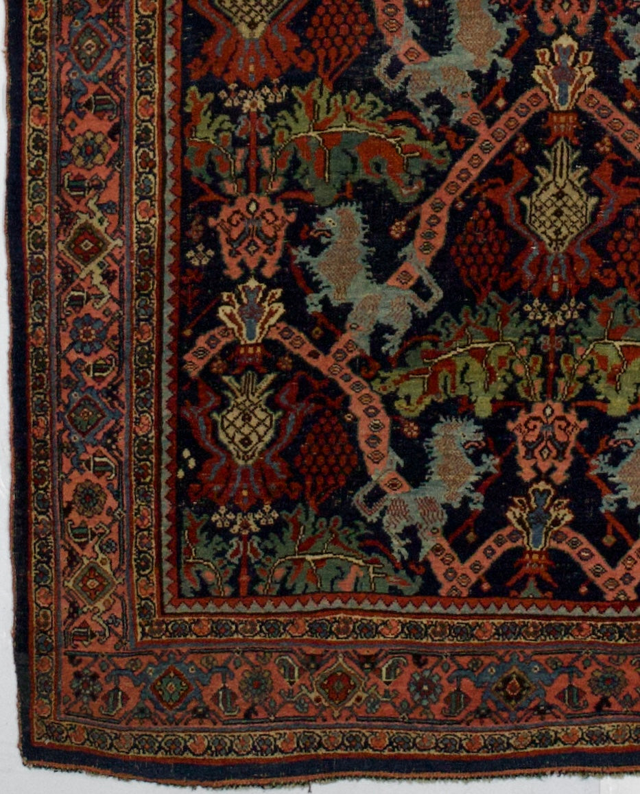 The town and surrounding Kurdish carpets of the eponym city, often in room or larger sizes. All wool before 1920, cotton warp afterward. Medallion and allover patterns. Heavy and compact. City weavers work from samplers (wagirehs). Village Bidjars are in scatter sizes, with more geometric patterns. Bidjar weaves range from moderate to very fine. Scatters yes, runners very few. Expensive, but incredibly long-wearing.