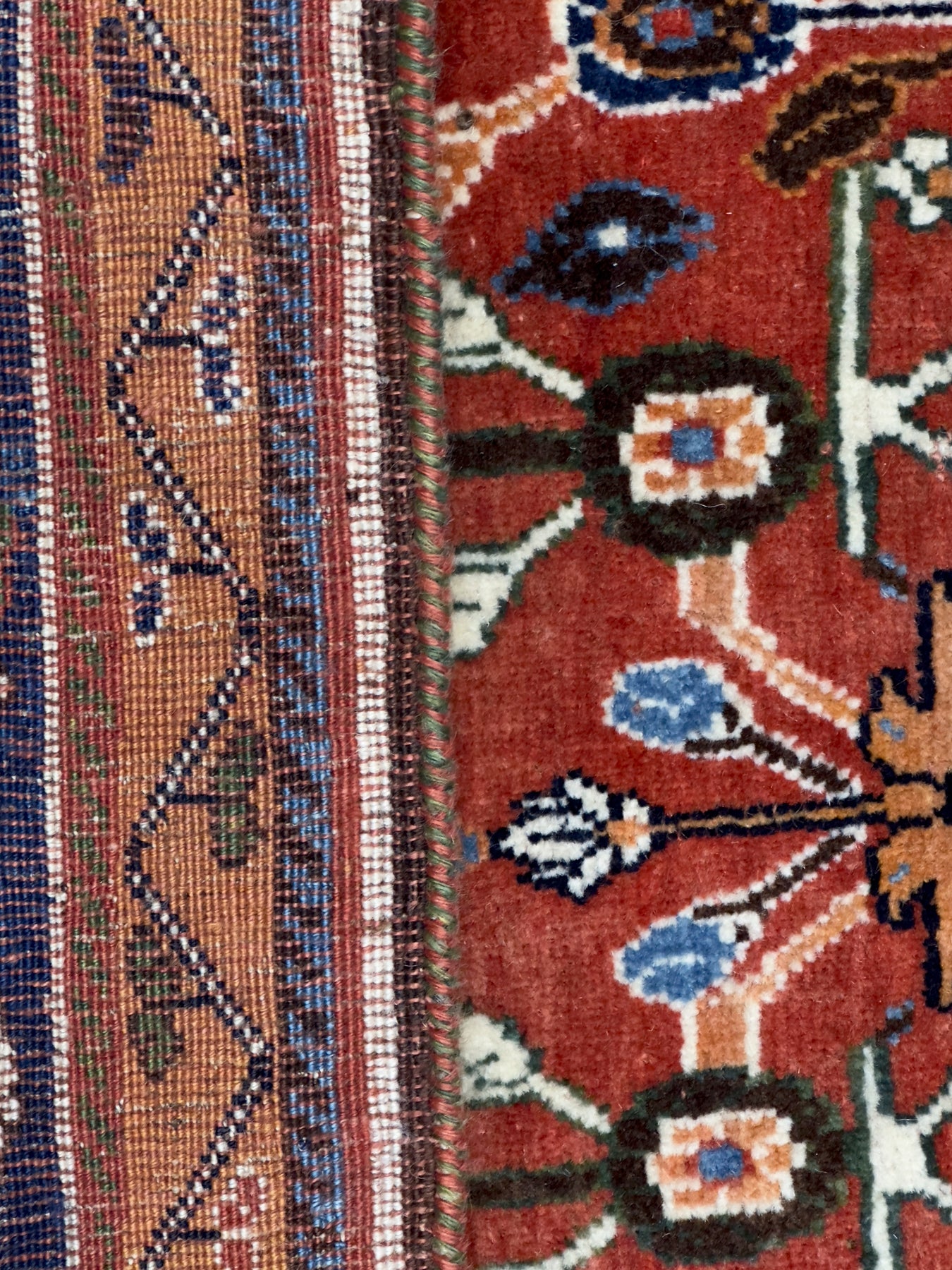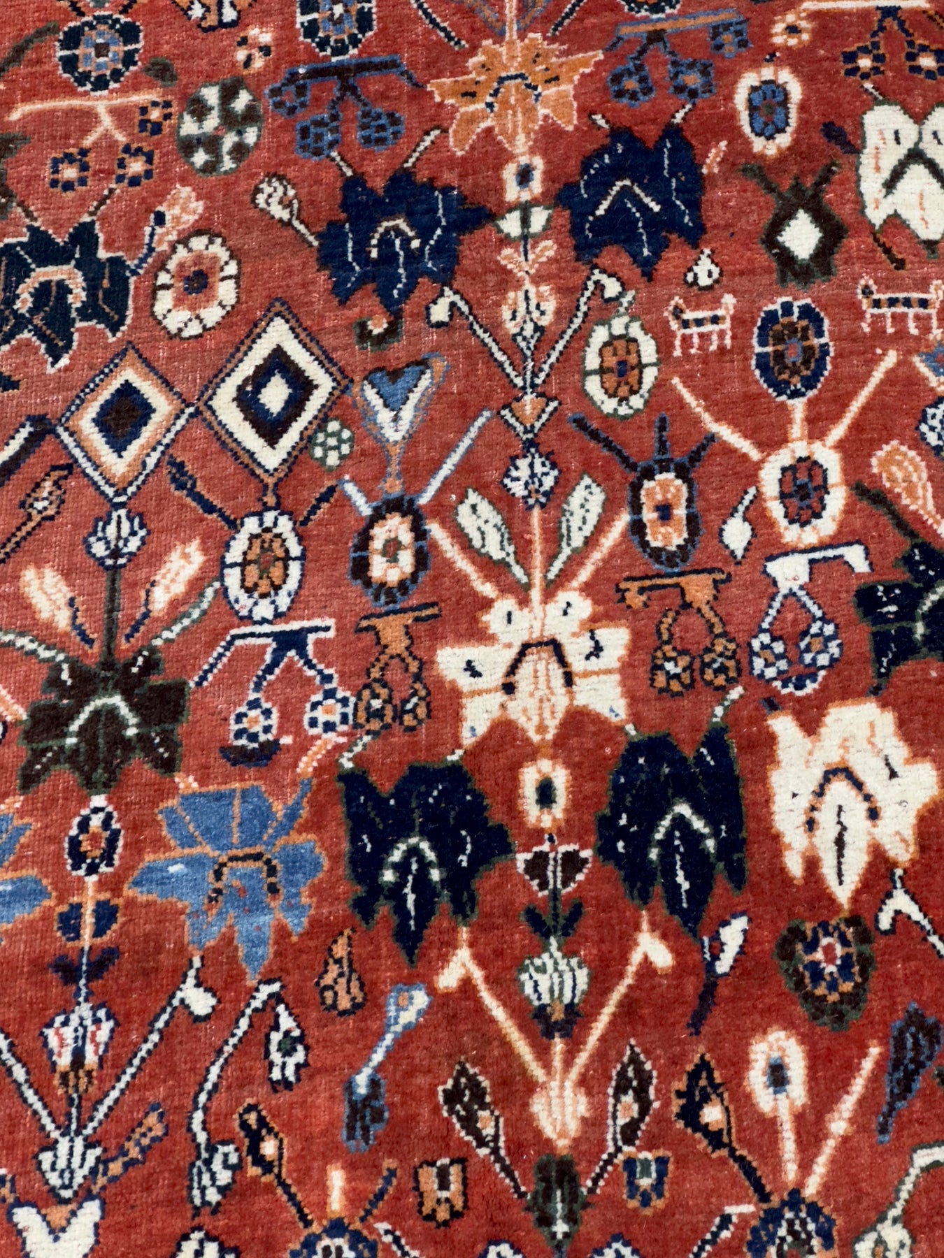 The non-Qashghai tribes in SW Persia weaving a wide variety of geometric and abstract scatters and bag faces.  The best weavers are the Baharlu of Turkic descent, Both symmetric and asymmetric knots; wool foundations predominate. Chickens are a popular secondary motif. Also called ‘Shiraz’. Moderate to medium weave. Bright palettes. Moderate to medium price.