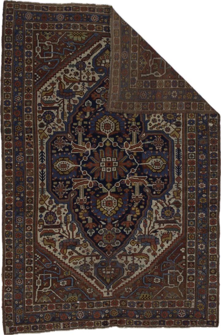 The best SW Persian, Fars Province nomadic rugs, mostly in scatter formats. Lion rugs, adapted Persian curvilinear styles. Some well-woven prayer rugs. All-wool constructions. Finely woven saddlebags. Pictorial rugs. Weaving goes back to at least the mid-19th century. Excellent wool quality. Medium to expensive.