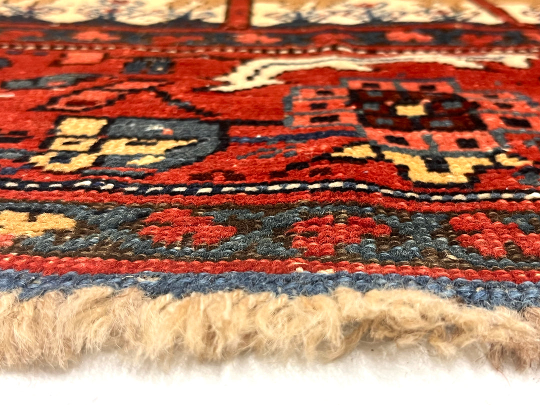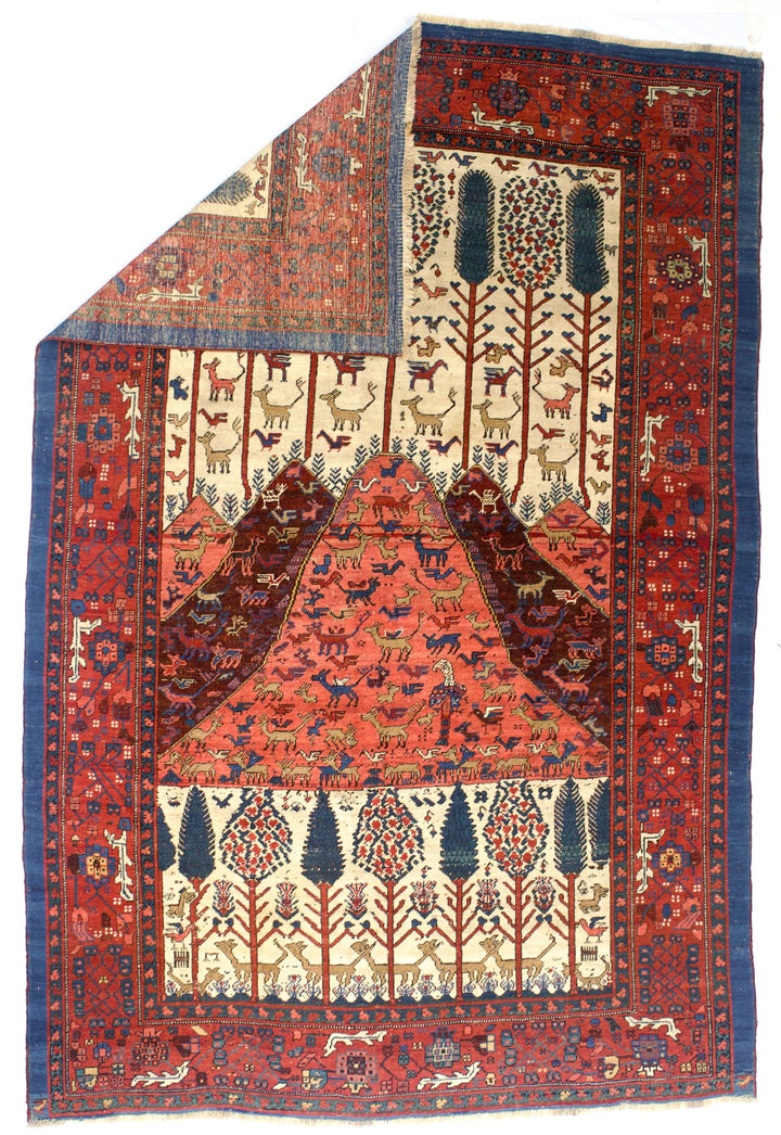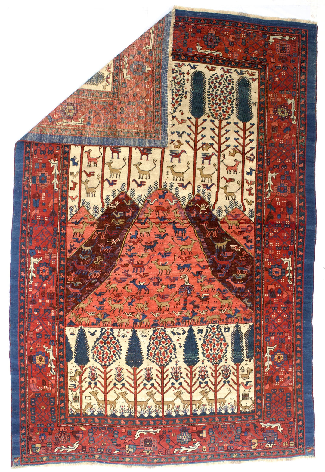Generally in squarish sizes, allover patterns and coarse to moderate weaves, wool or mixed constructions; woven before 1900. Term is often extended to early medallion, later 19th century. Earlier pieces often have slightly more muted palettes employing rust, straw and lighter blues. Generally in carpet sizes, some scatters. Expensive
