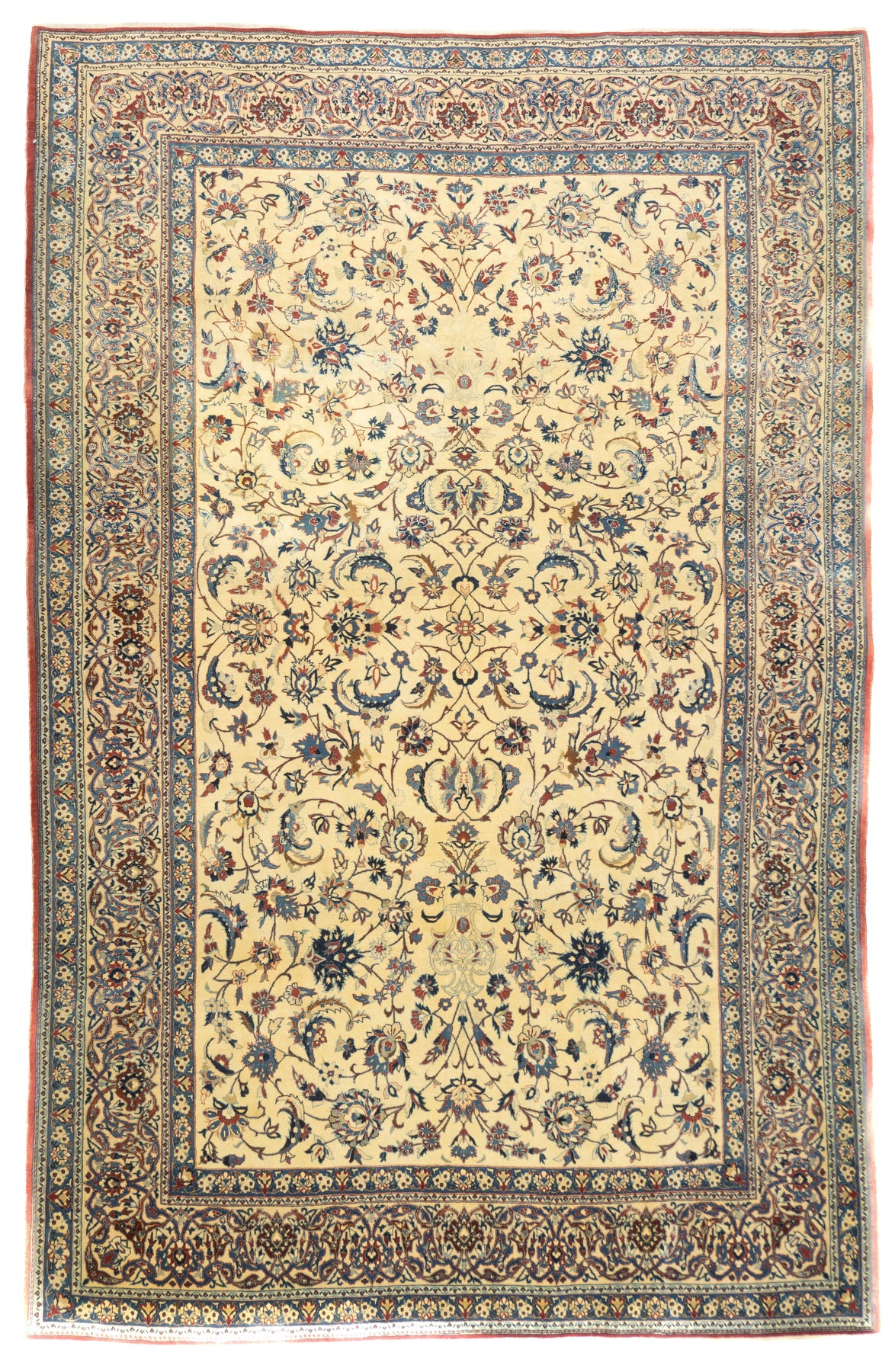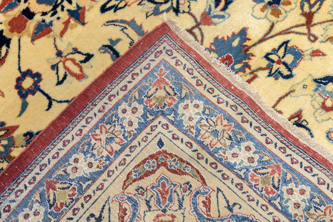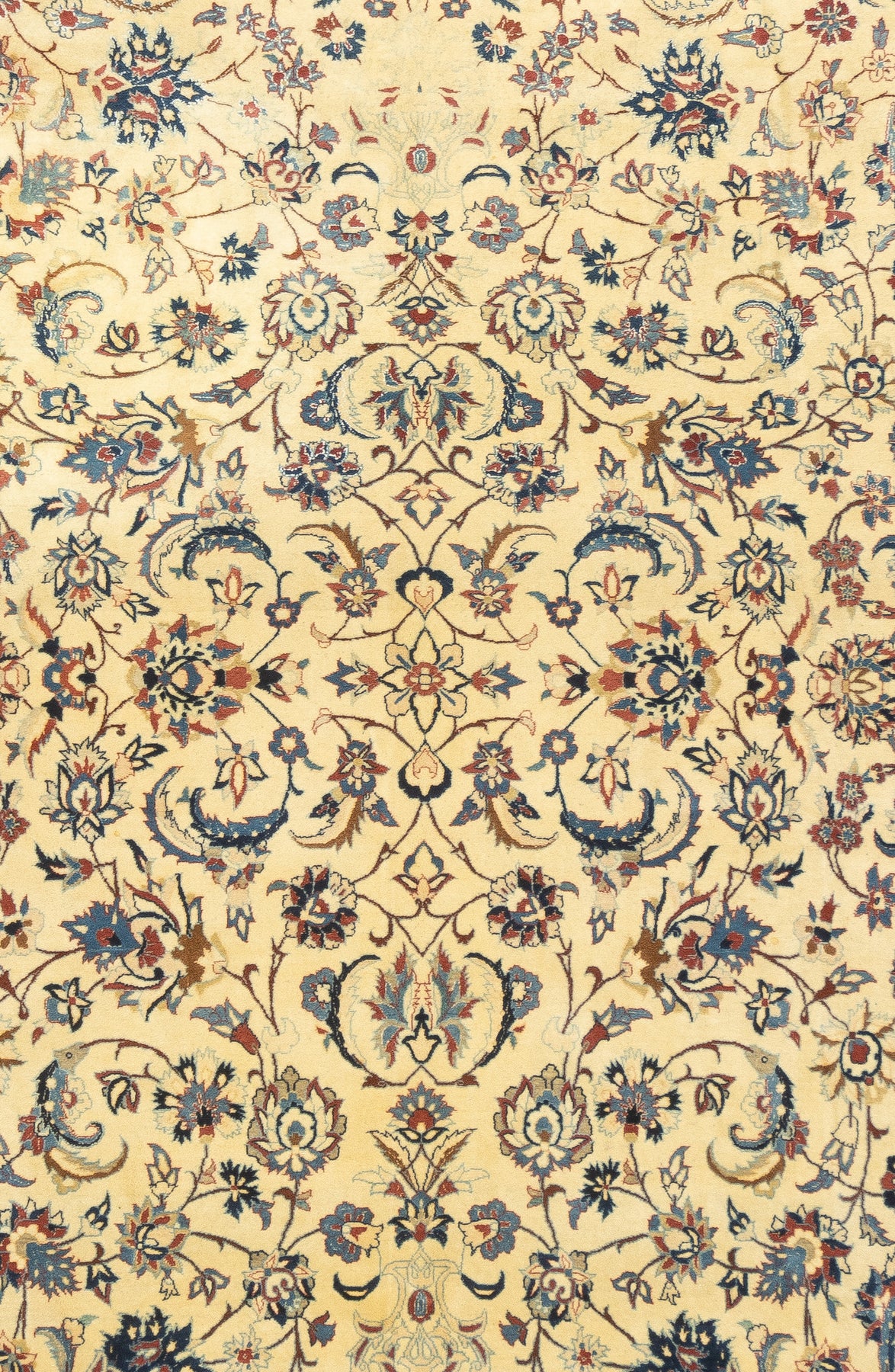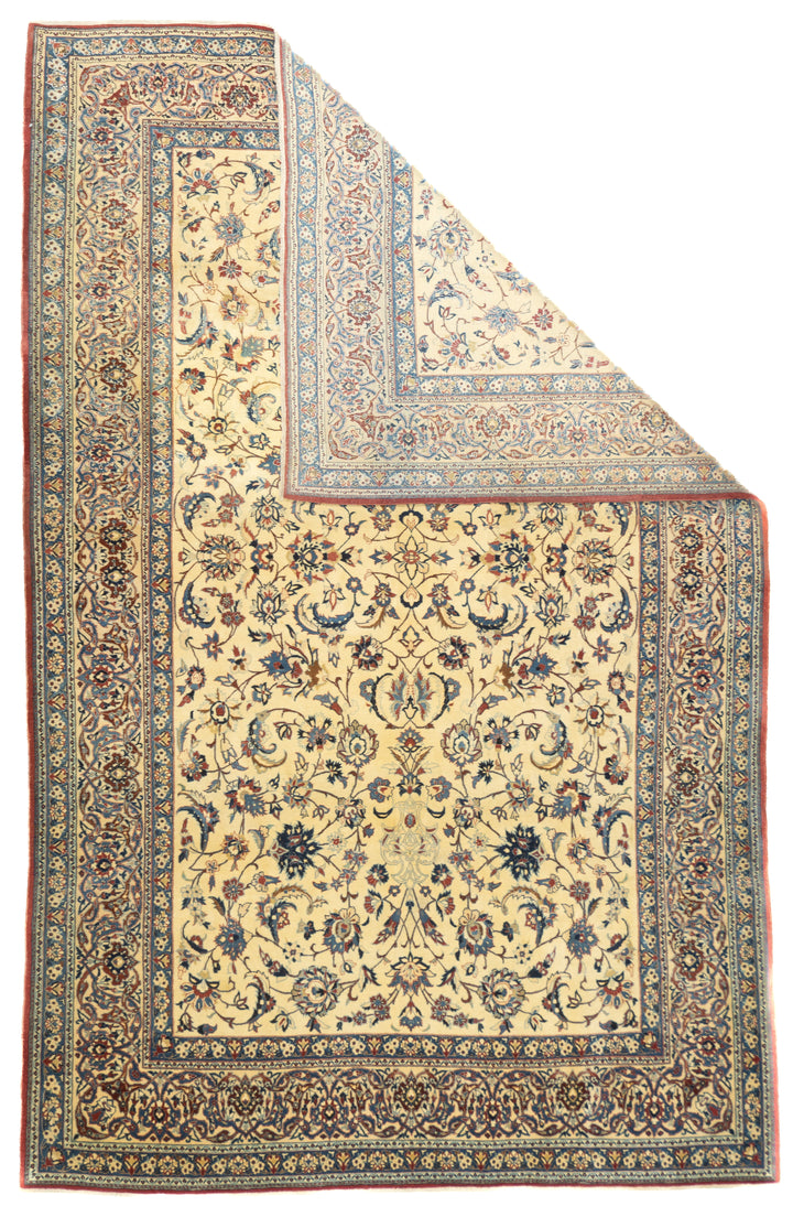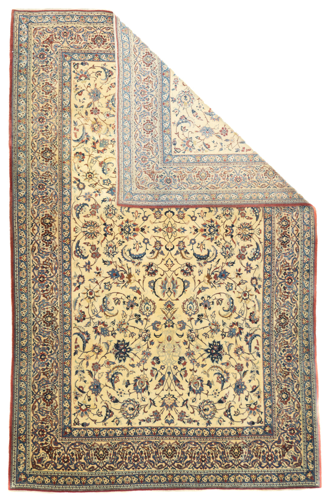 The rugs of this central Persian town, from the 1930’s onward; very fine to extremely fine. Generally in light colours on medallion designs. Best examples with silk accents. Scatters to large carpets, no runners or prayer rugs. Short, velvety pile, precise execution, cotton foundations.