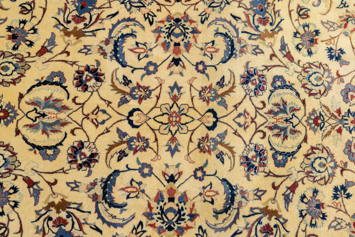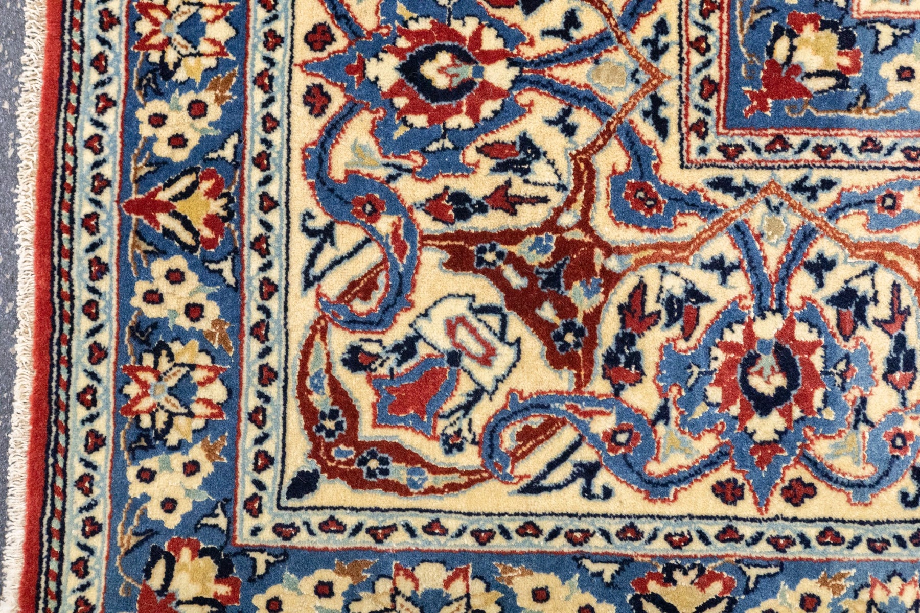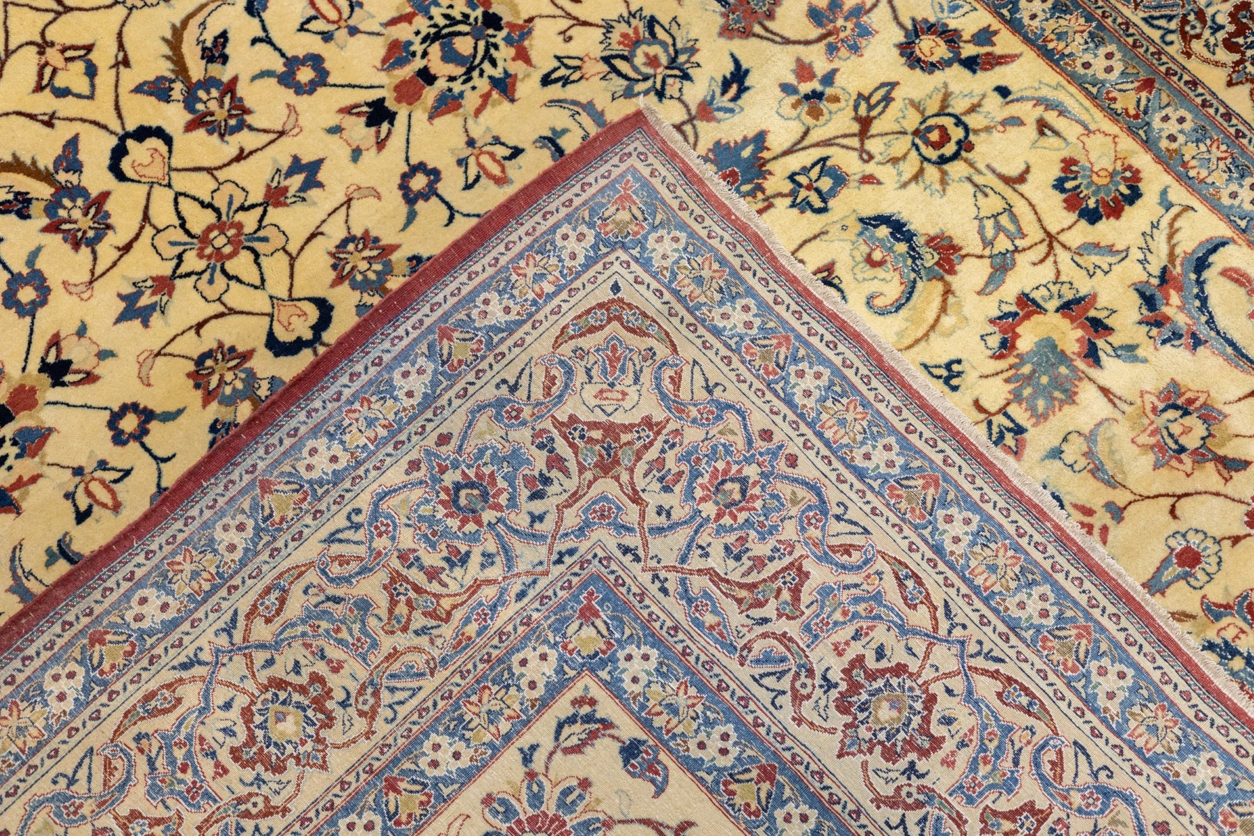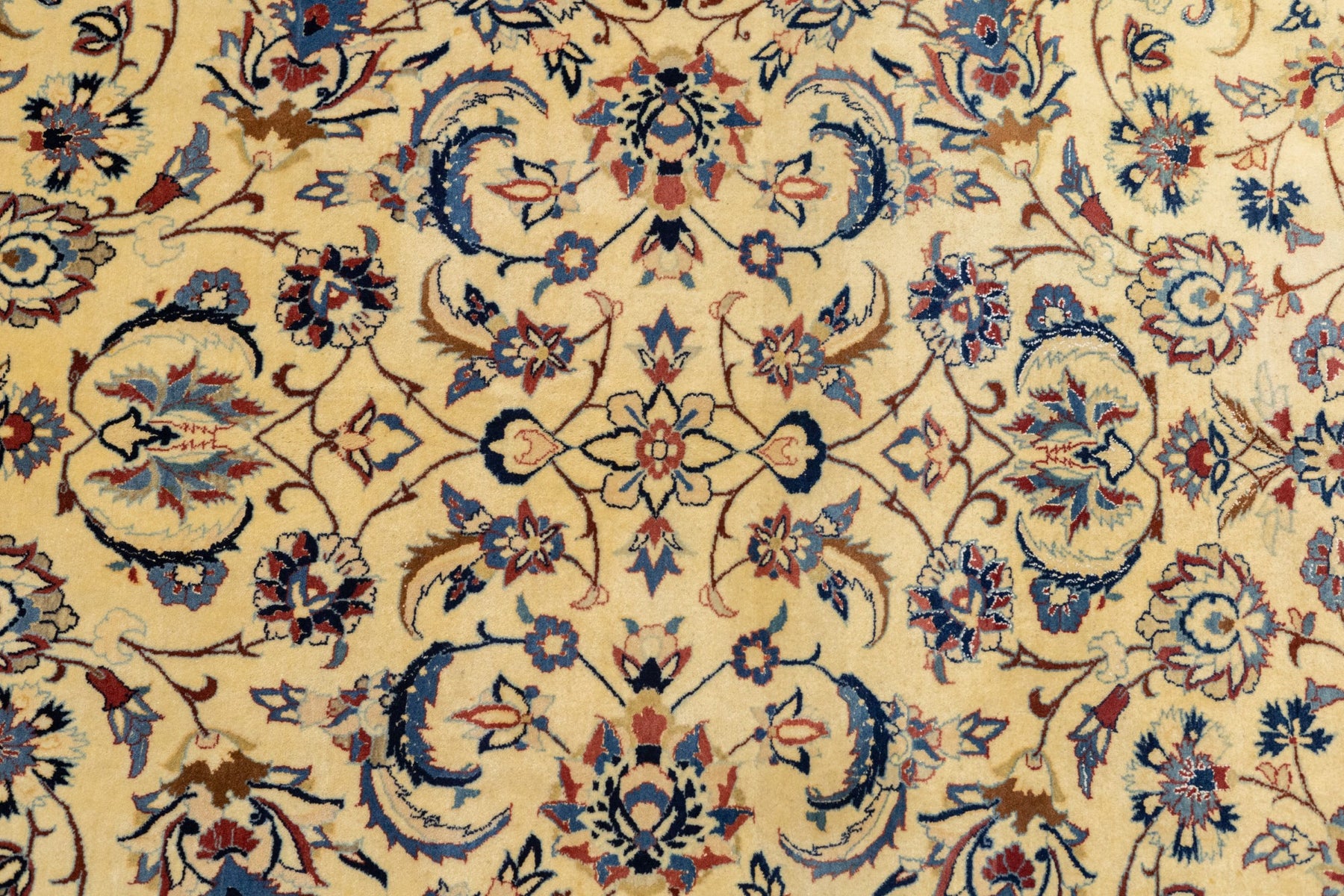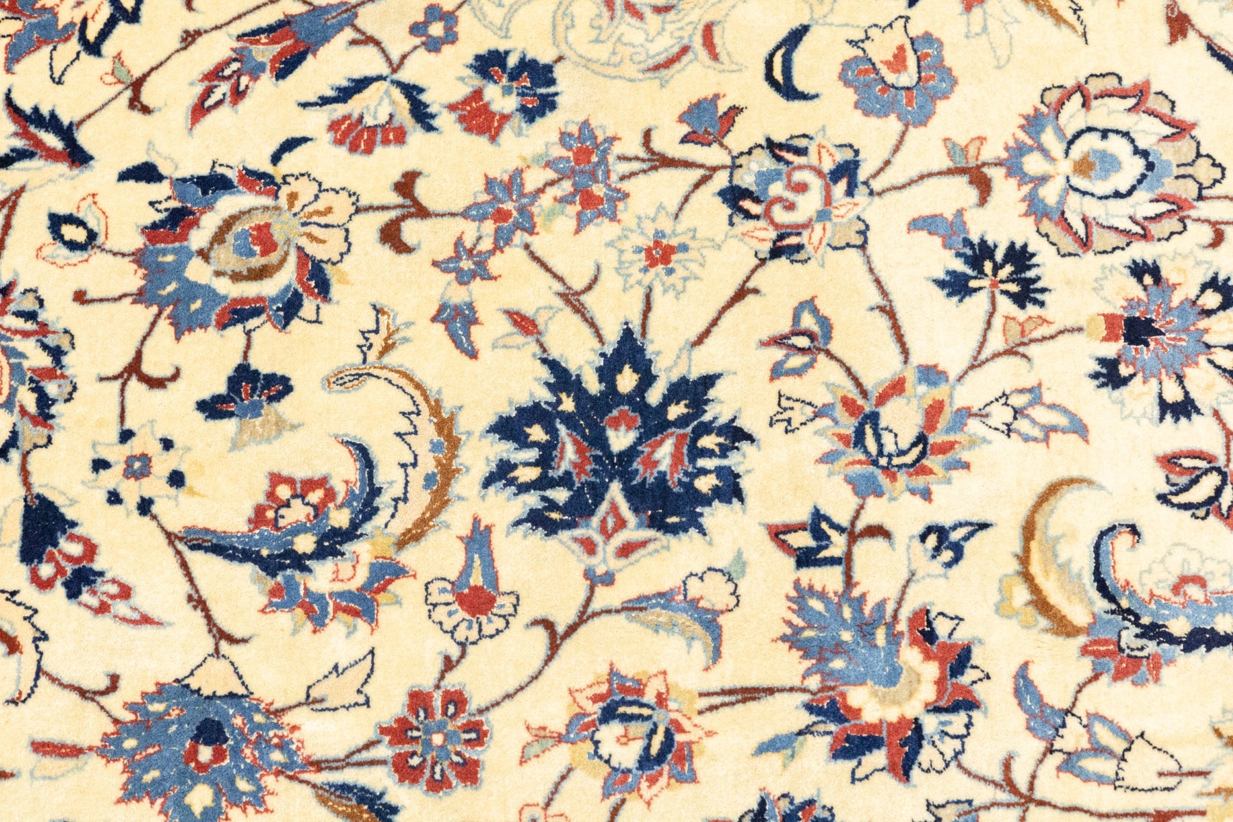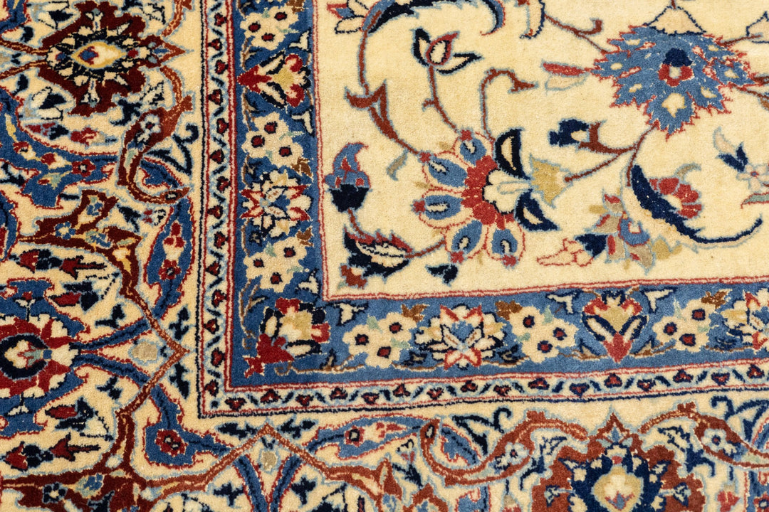 The rugs of this central Persian town, from the 1930’s onward; very fine to extremely fine. Generally in light colours on medallion designs. Best examples with silk accents. Scatters to large carpets, no runners or prayer rugs. Short, velvety pile, precise execution, cotton foundations.