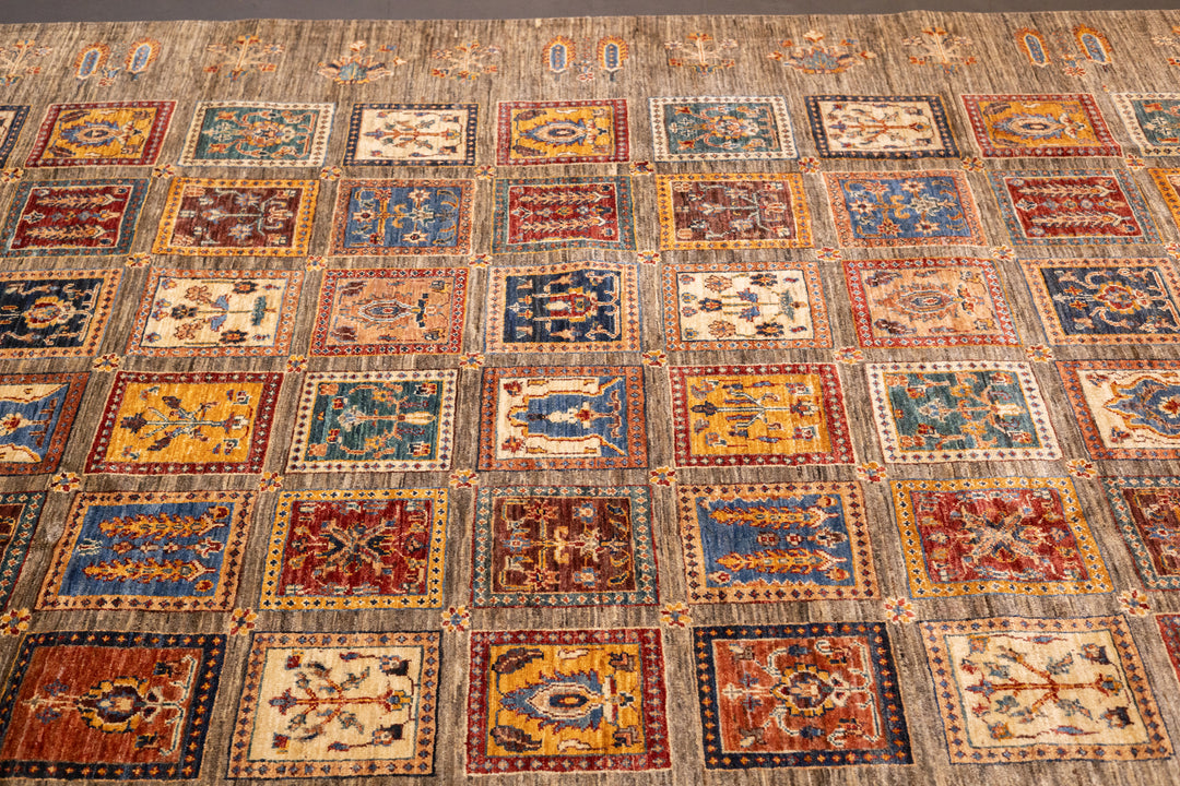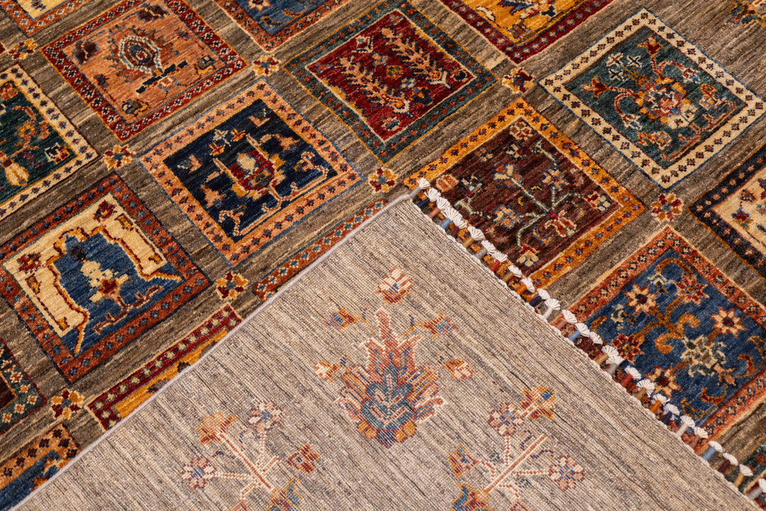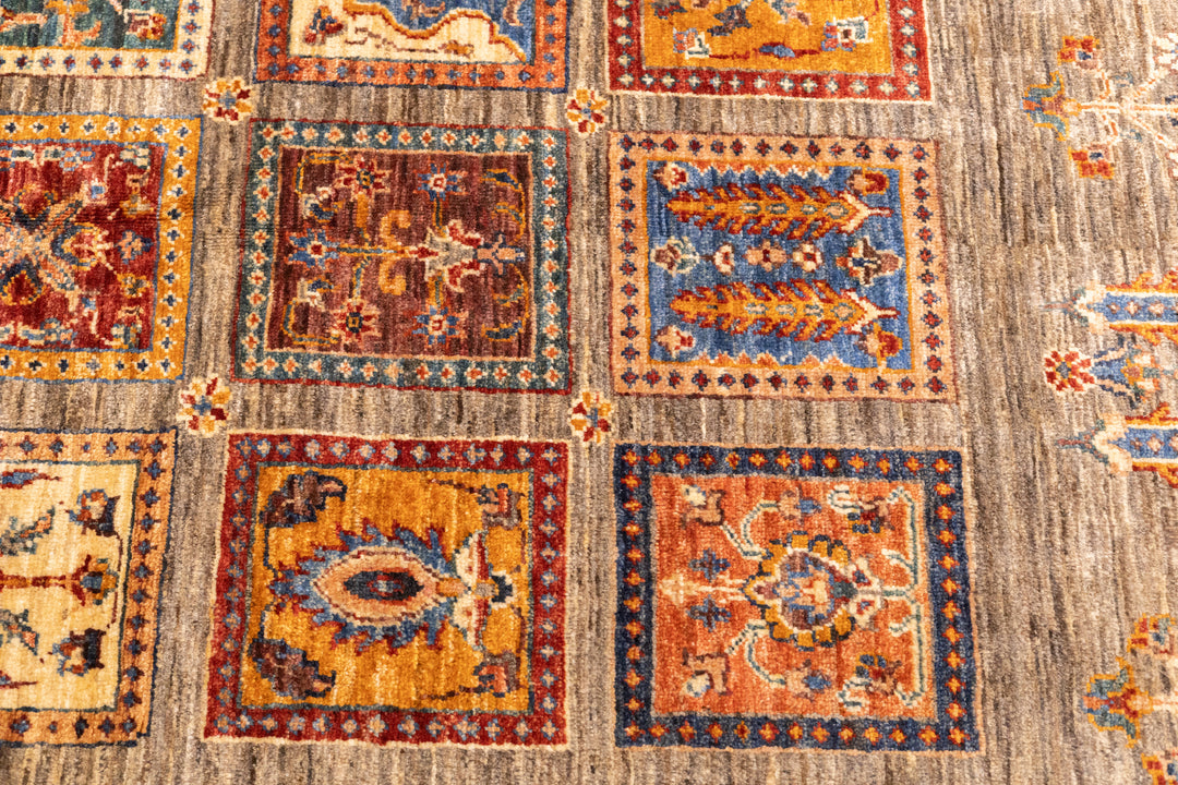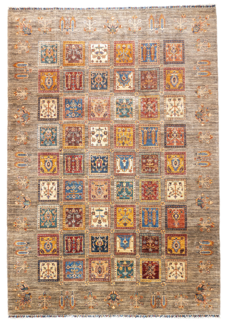 Wool pile rugs, usually scatter formats, woven by the Qashghai tribes of SW Persia (Fars Province), in moderate weave, uncluttered geometries and unshaded colours. From about 1900 onwards. Now copied by other weavers while retaining informal tribal character.