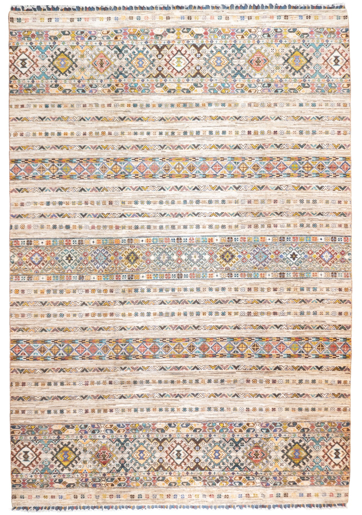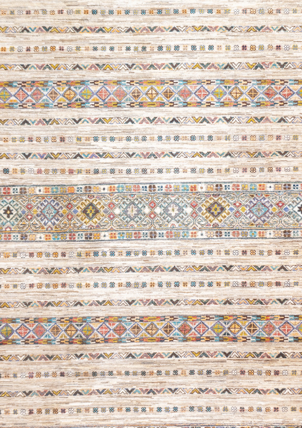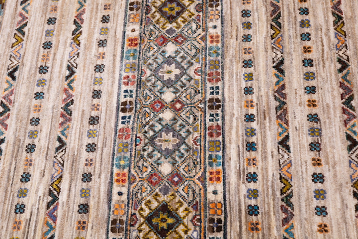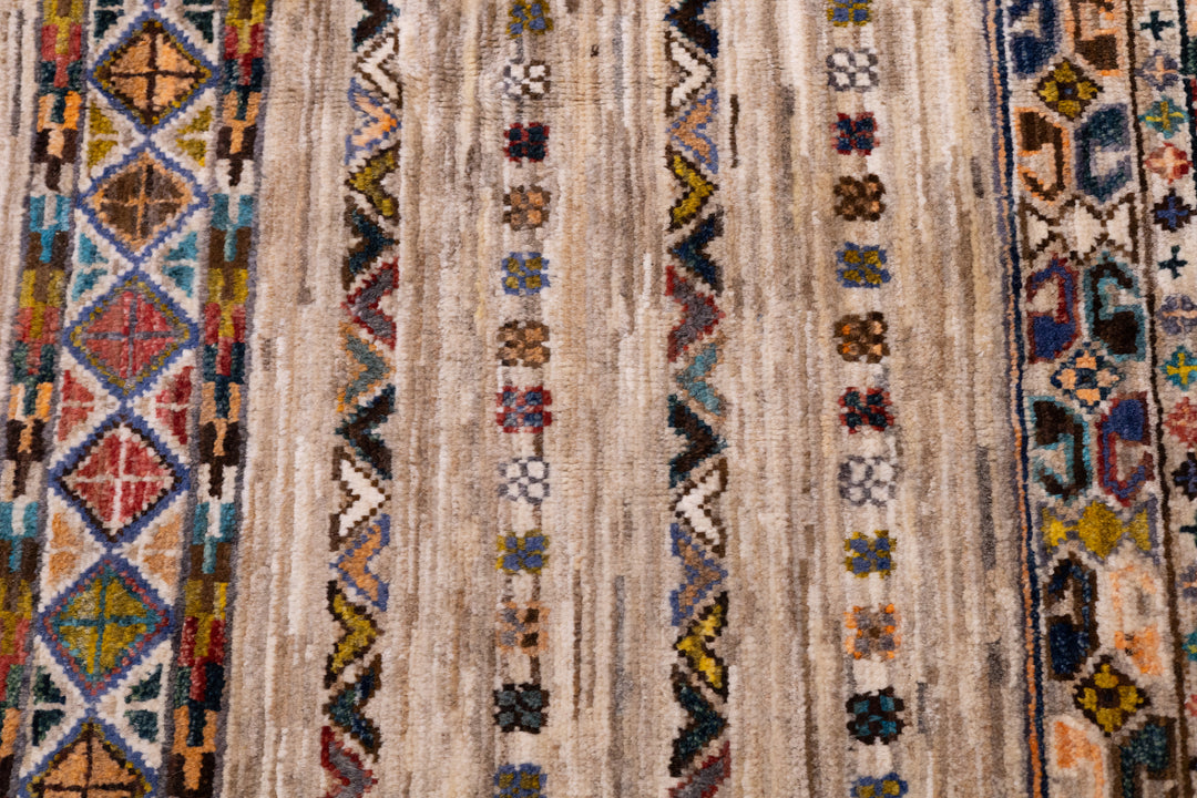 Wool pile rugs, usually scatter formats, woven by the Qashghai tribes of SW Persia (Fars Province), in moderate weave, uncluttered geometries and unshaded colours. From about 1900 onwards. Now copied by other weavers while retaining informal tribal character.