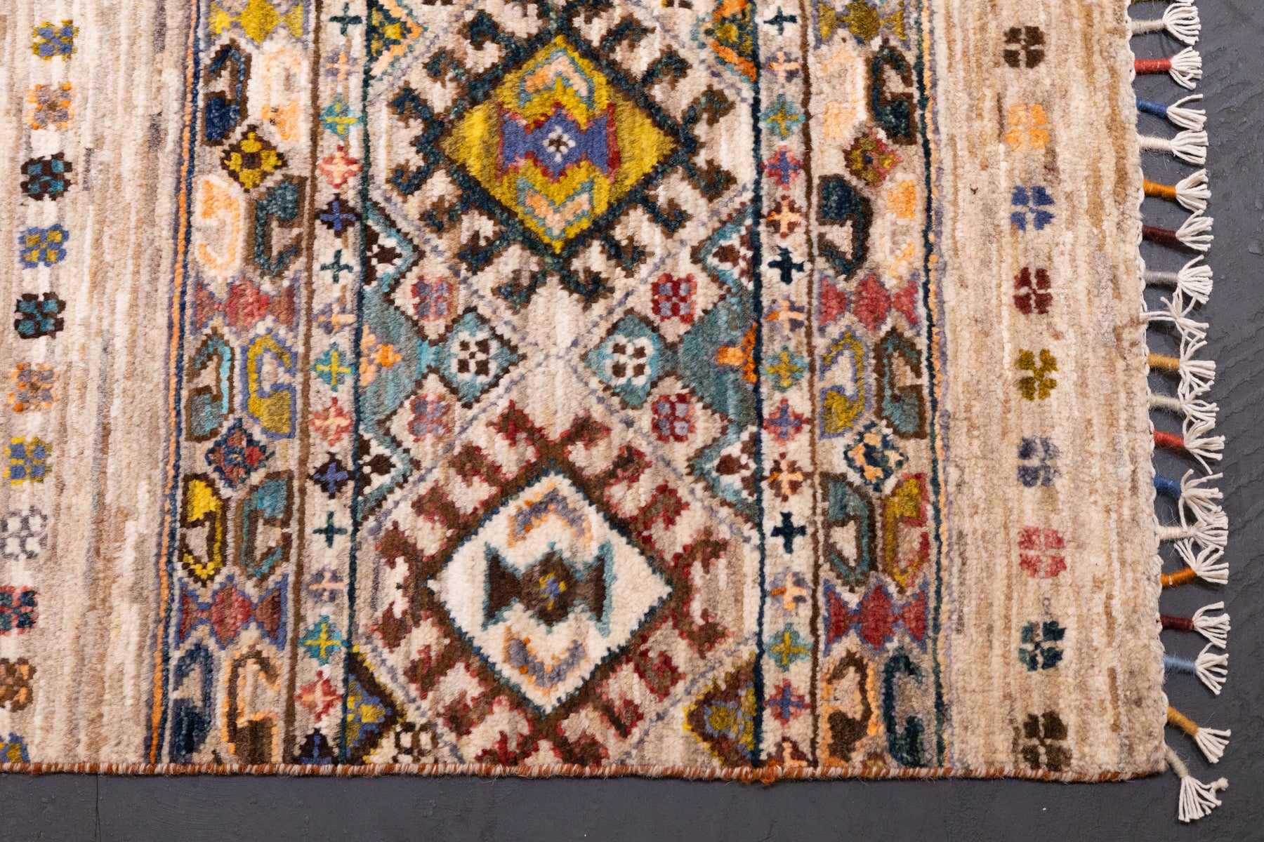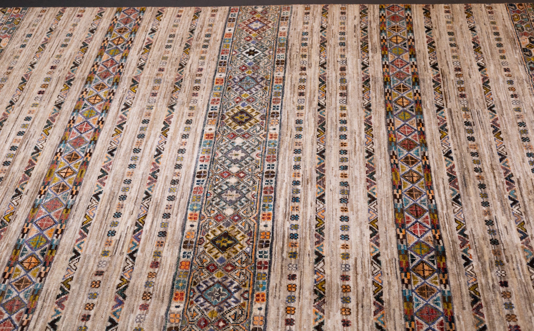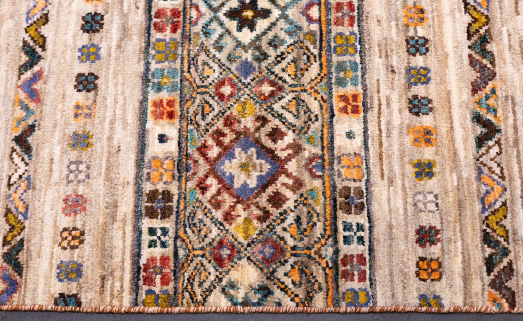 Wool pile rugs, usually scatter formats, woven by the Qashghai tribes of SW Persia (Fars Province), in moderate weave, uncluttered geometries and unshaded colours. From about 1900 onwards. Now copied by other weavers while retaining informal tribal character.