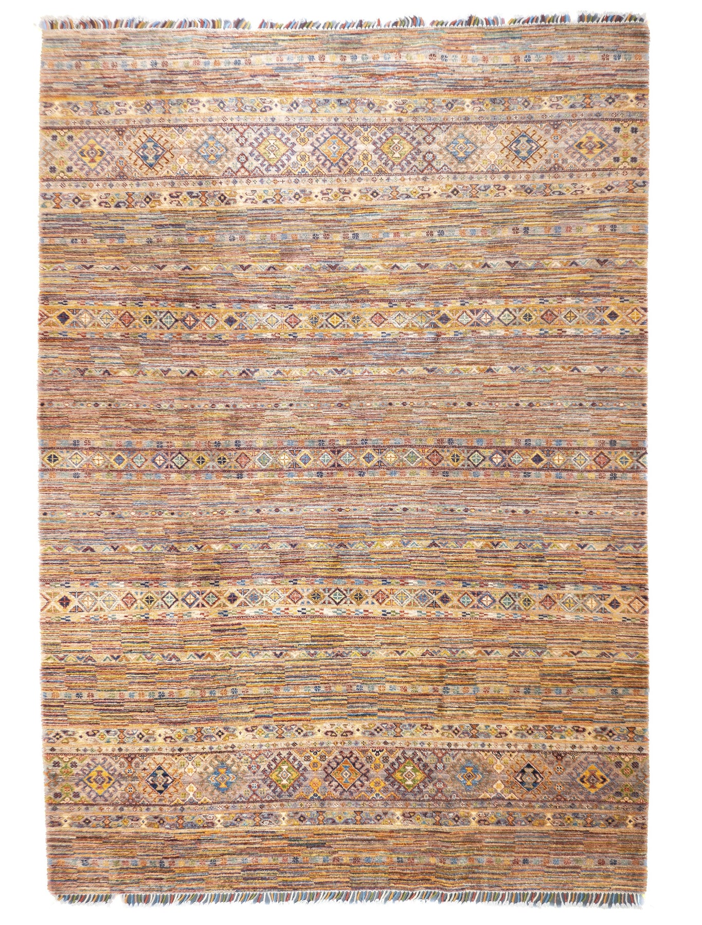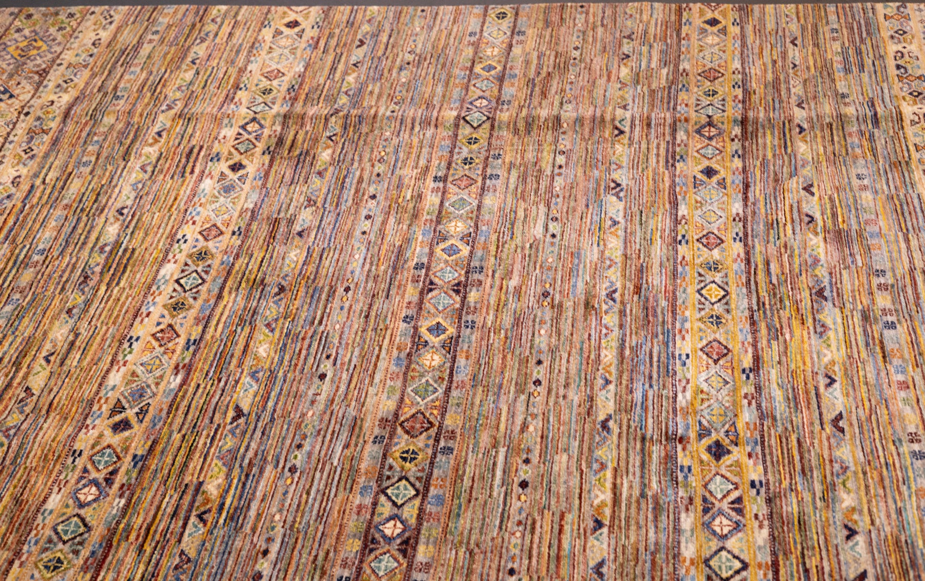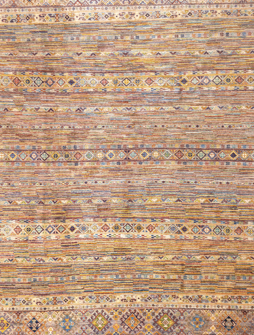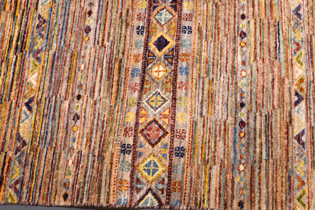 Wool pile rugs, usually scatter formats, woven by the Qashghai tribes of SW Persia (Fars Province), in moderate weave, uncluttered geometries and unshaded colours. From about 1900 onwards. Now copied by other weavers while retaining informal tribal character.