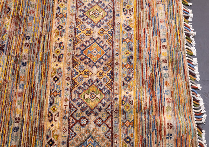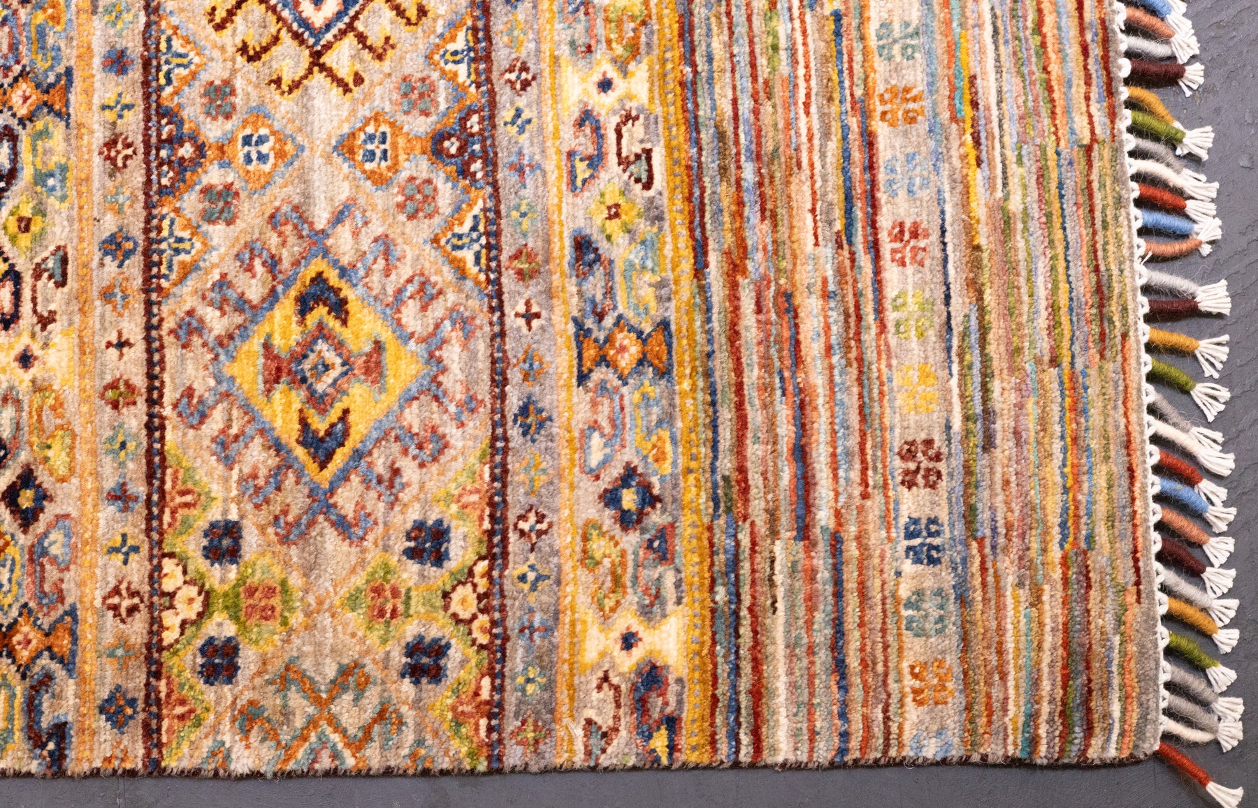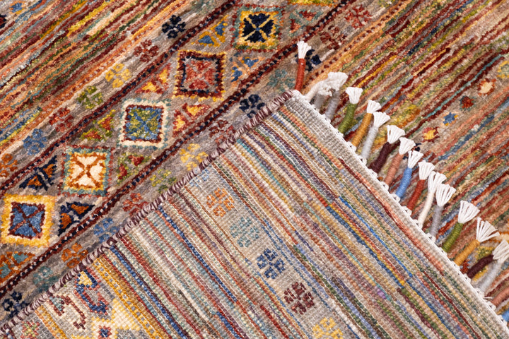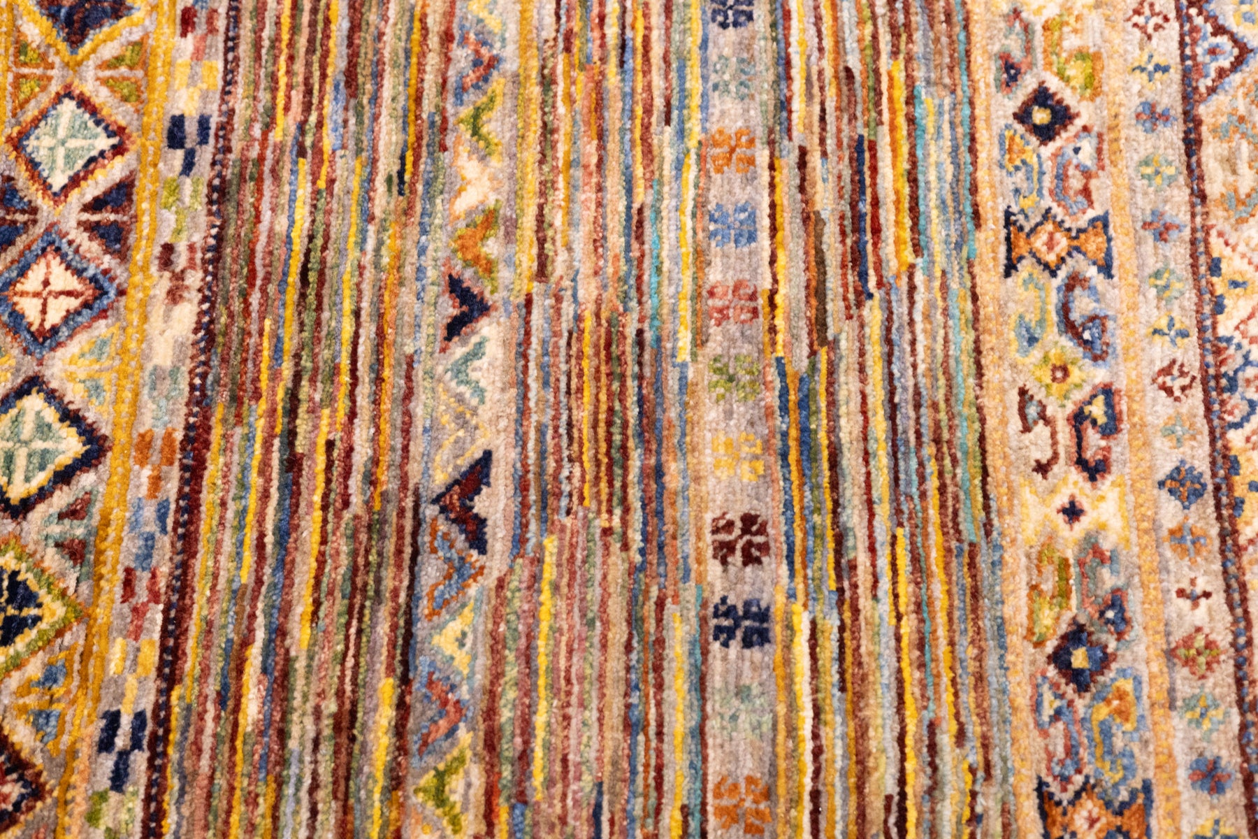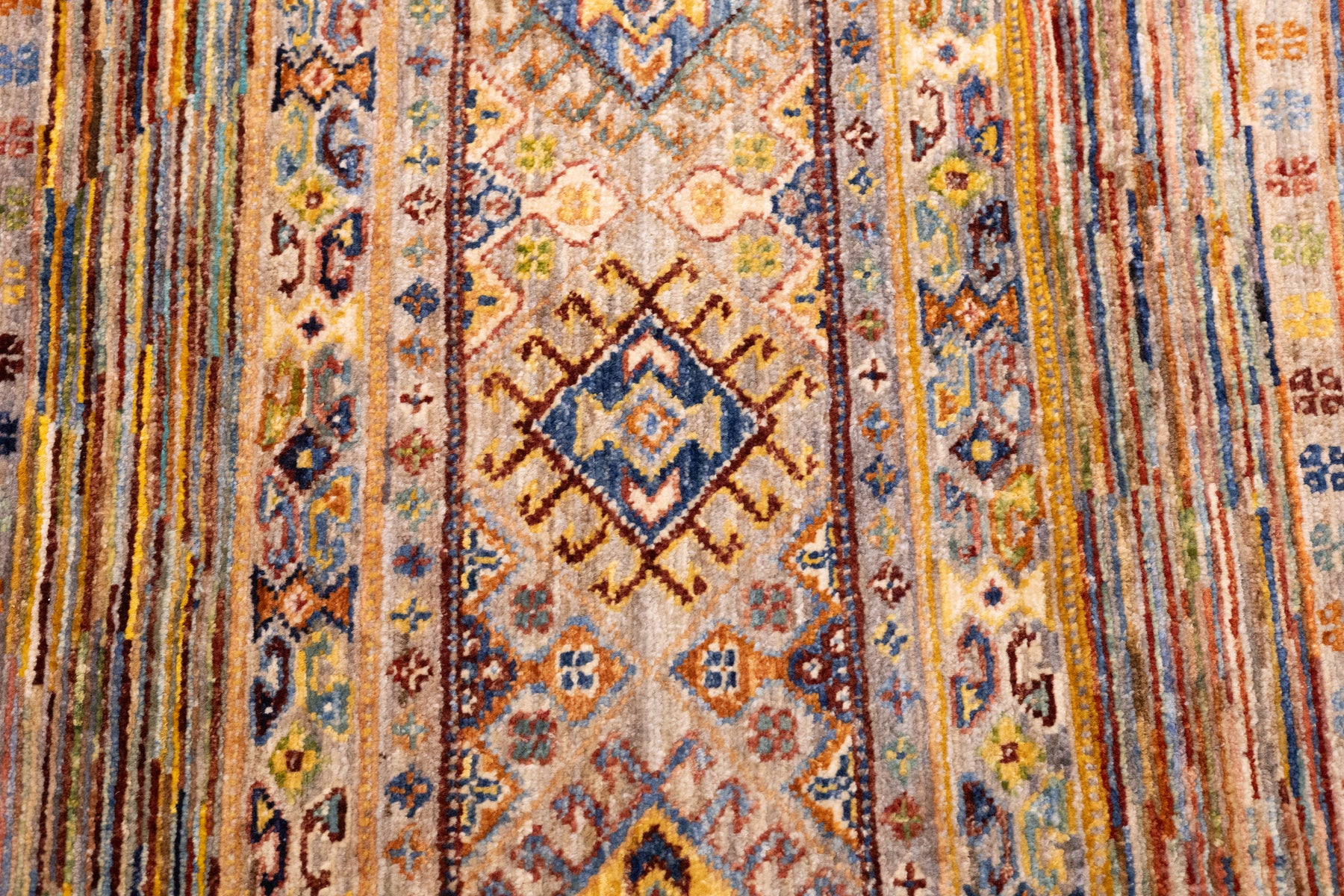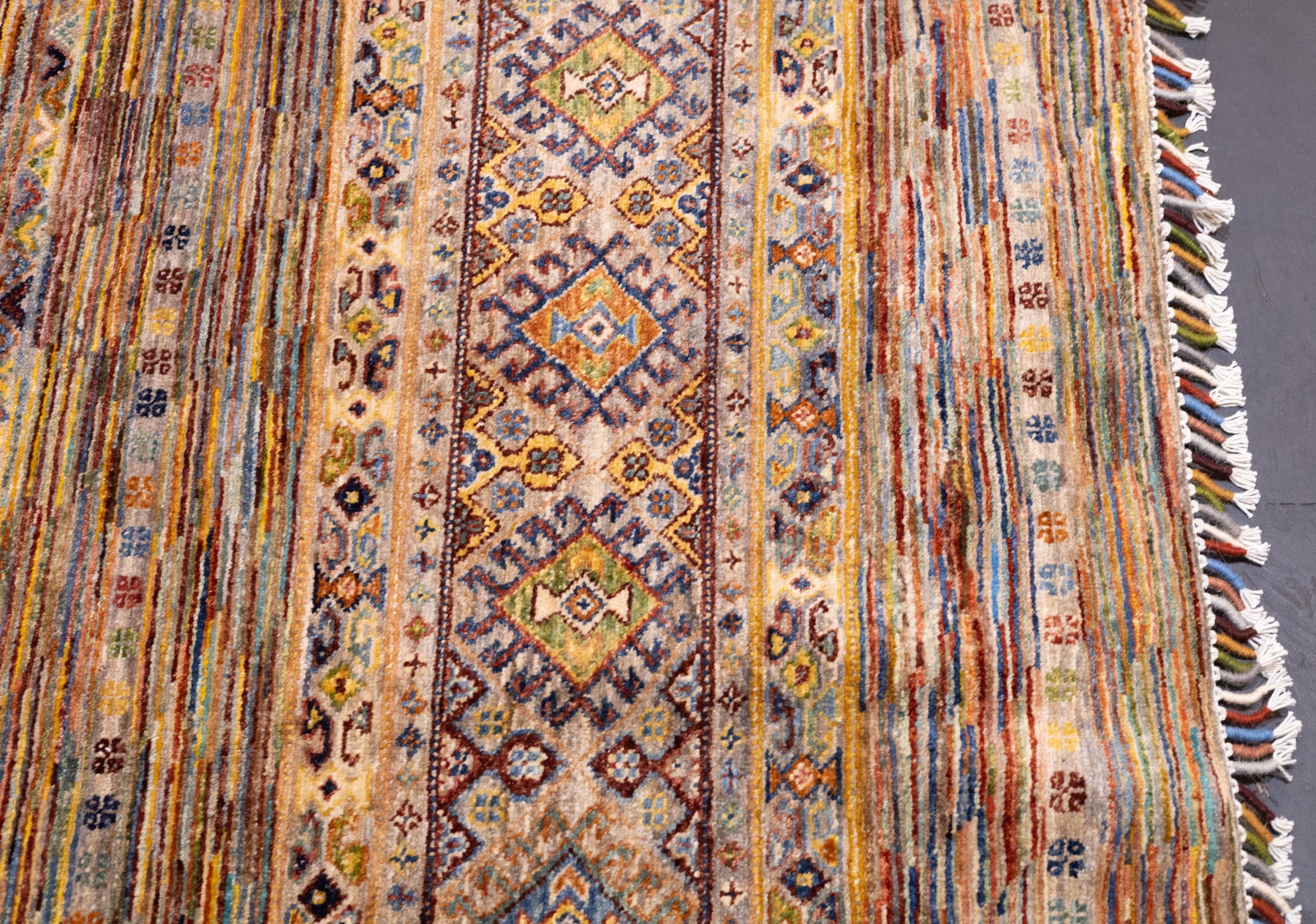 Wool pile rugs, usually scatter formats, woven by the Qashghai tribes of SW Persia (Fars Province), in moderate weave, uncluttered geometries and unshaded colours. From about 1900 onwards. Now copied by other weavers while retaining informal tribal character.