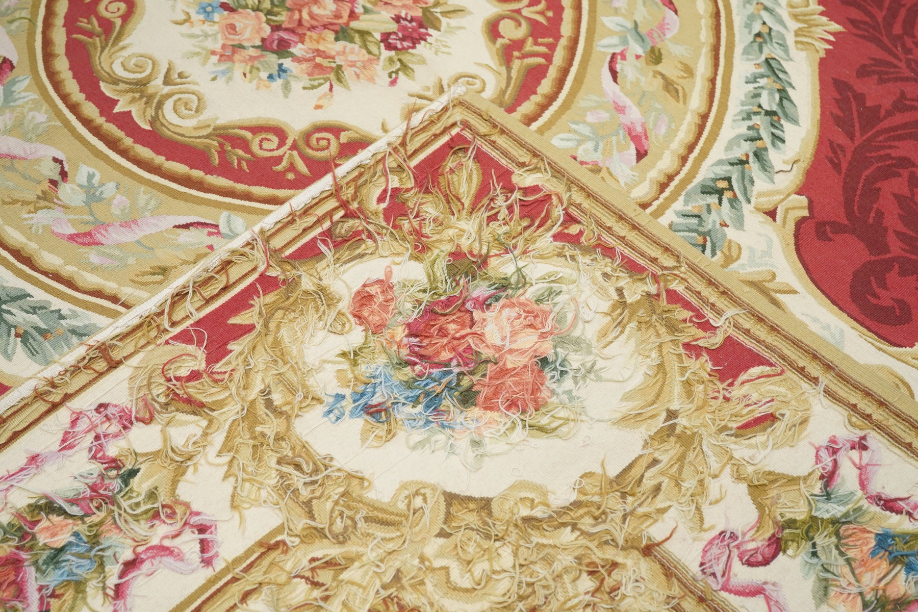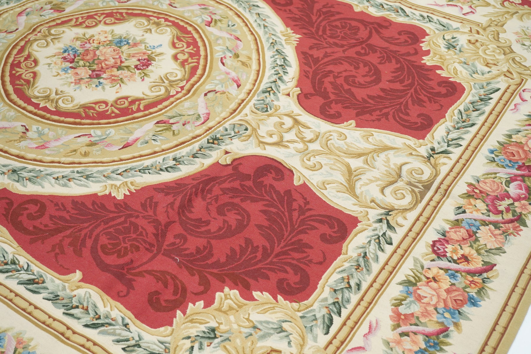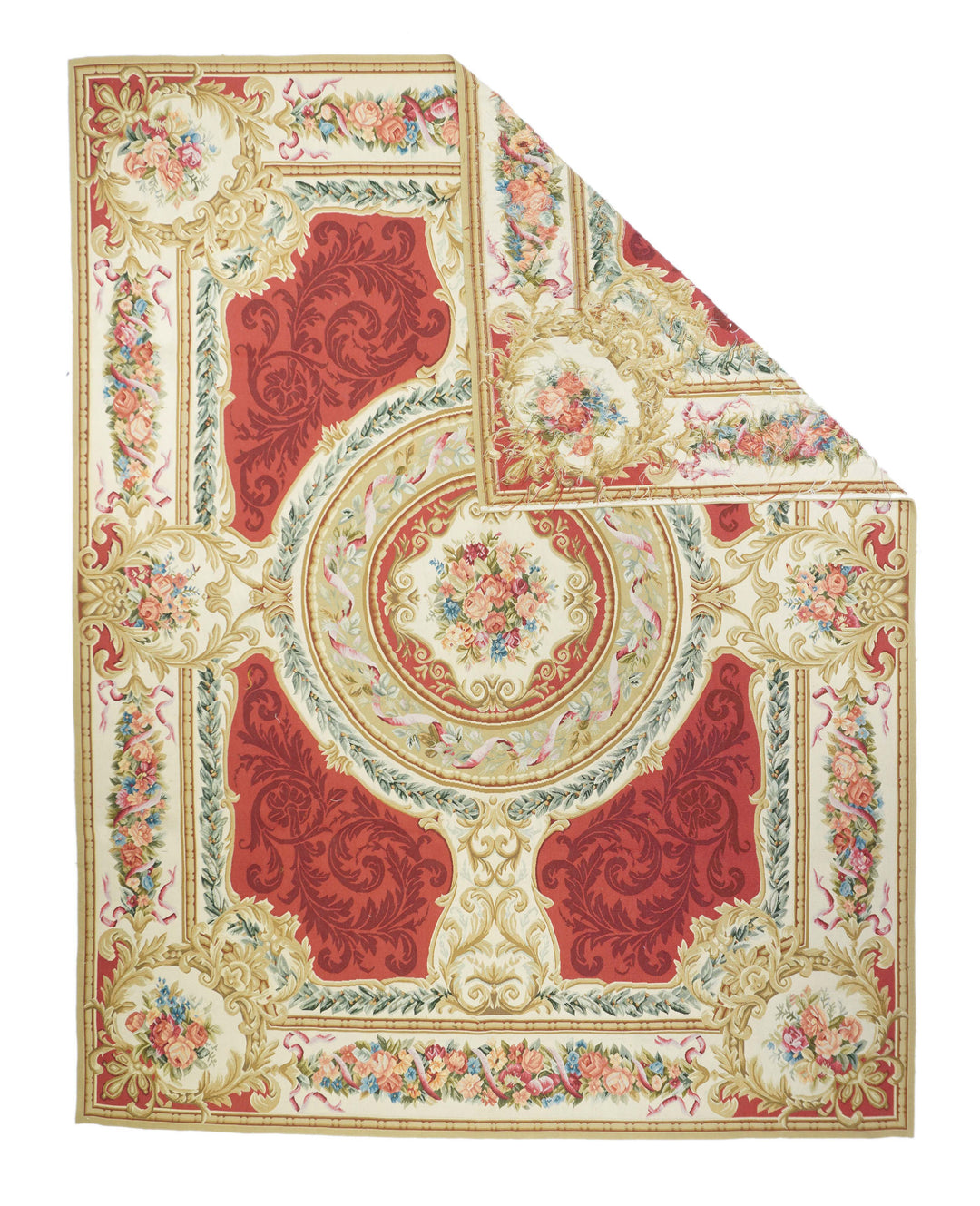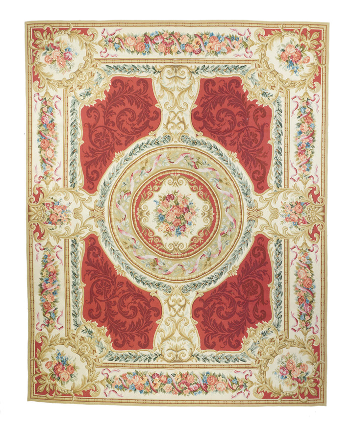 Refers generally to recent carpets in tapestry technique and inspired by French Aubusson designs of the 18th and later centuries. Geometric or semi-floral. Scatters to room sizes. Recent pieces are usually Indian. Wool pattern wefts. Inexpensive to moderate