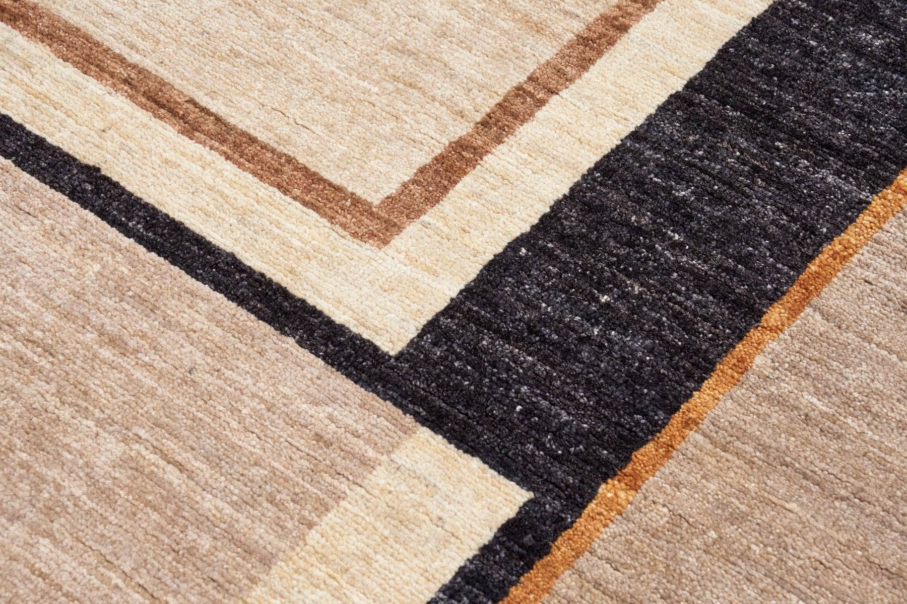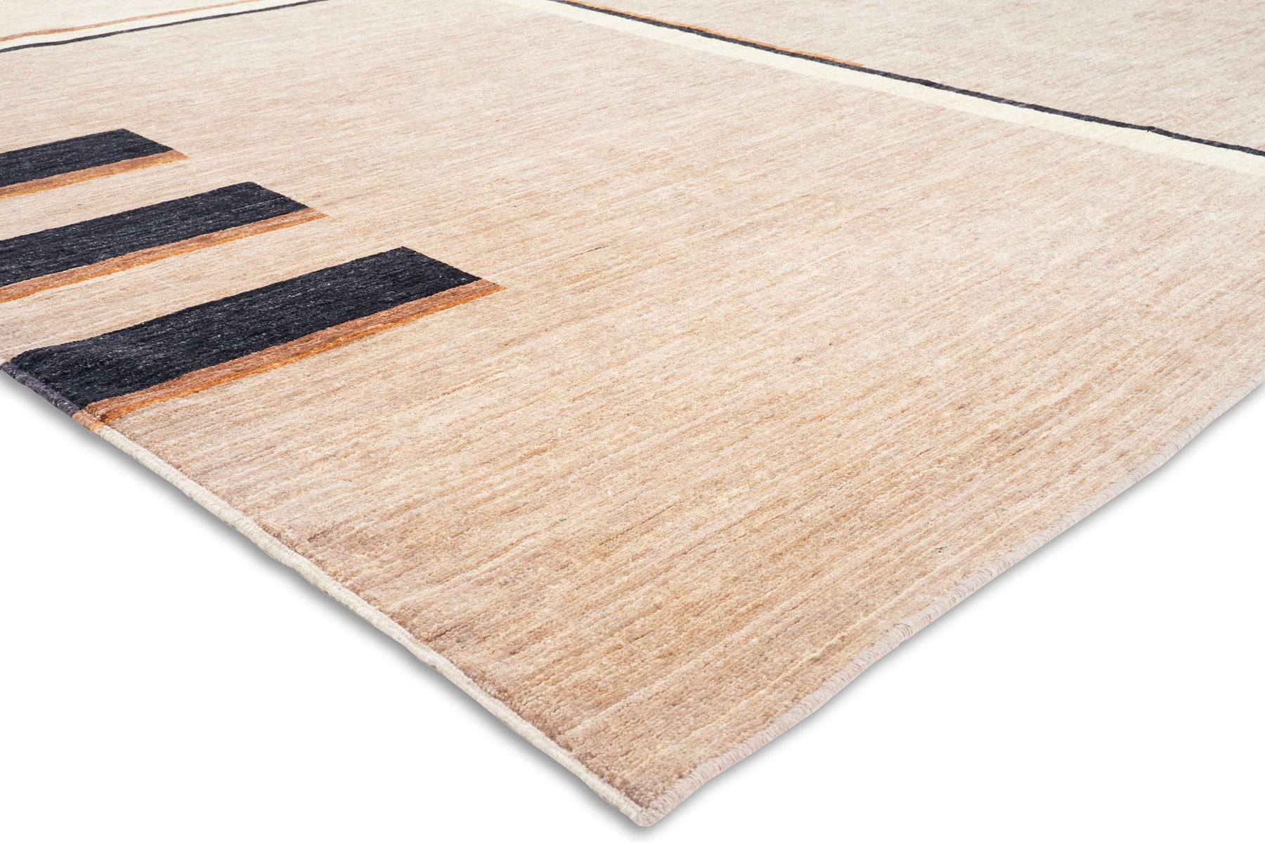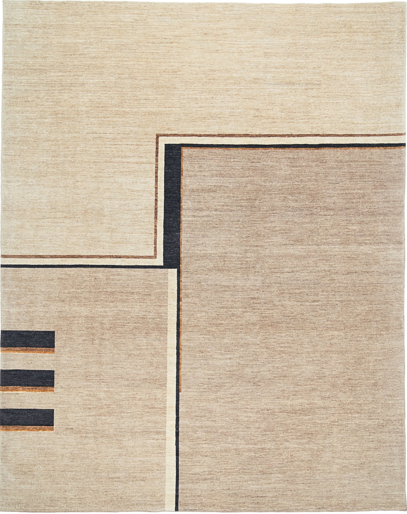 Avenue Onyx offers a striking, high-contrast finish, pairing rich concrete greys with stark black for a bold statement. The pared-back geometric design captures the satisfying language of maps. Handwoven using 100% Ghazni wool and knotted with Persian techniques, it offers a rustic yet refined finish, making a compelling artisanal rug that adds a touch of drama to a space.