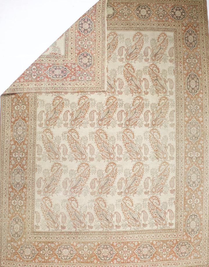 The well-woven to finely knotted 1890 to 1910 pieces woven in the eponymous workshop or its copyists, in Tabriz, in formats ranging from mats to giant carpets, with prayer (niche), allover and medallion layouts, with filled or open fields, often with a characteristic rust-red field tone. Prices are usually unsigned and undated. Cotton foundations, brisk pile. Expensive and up.
