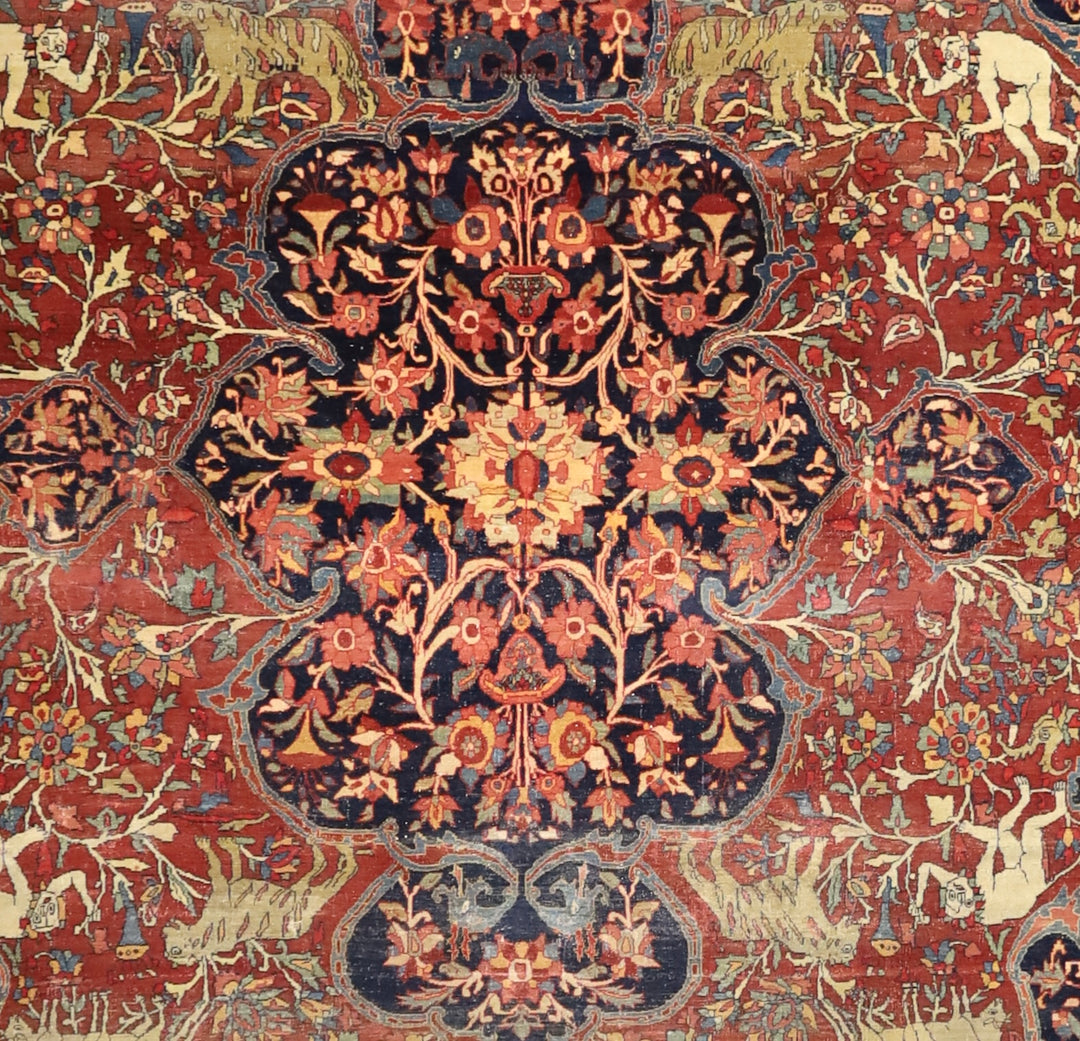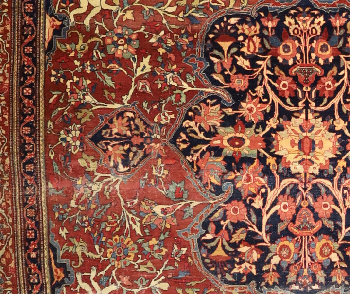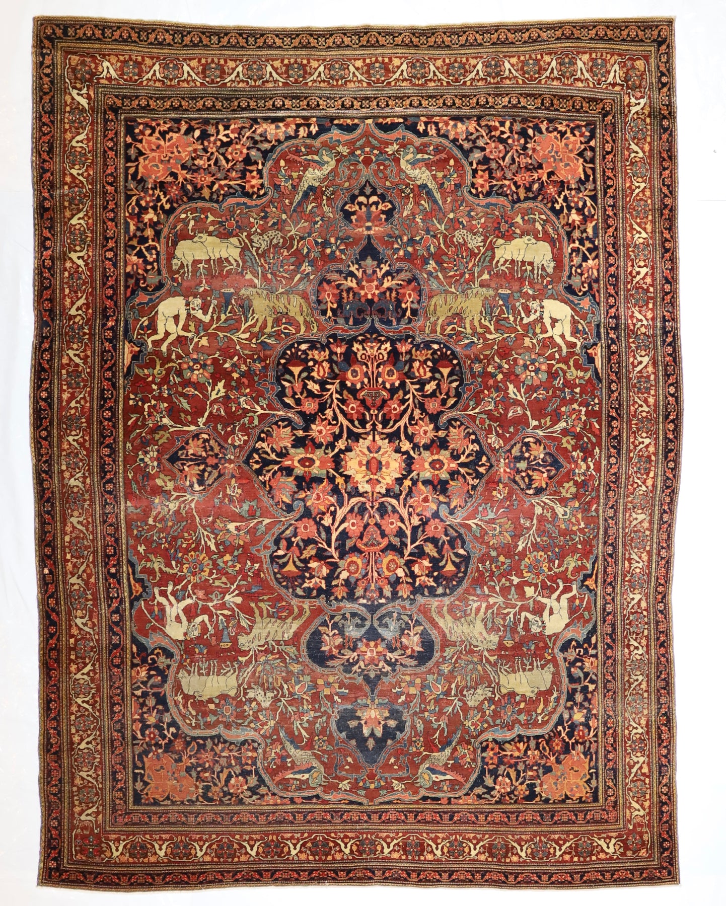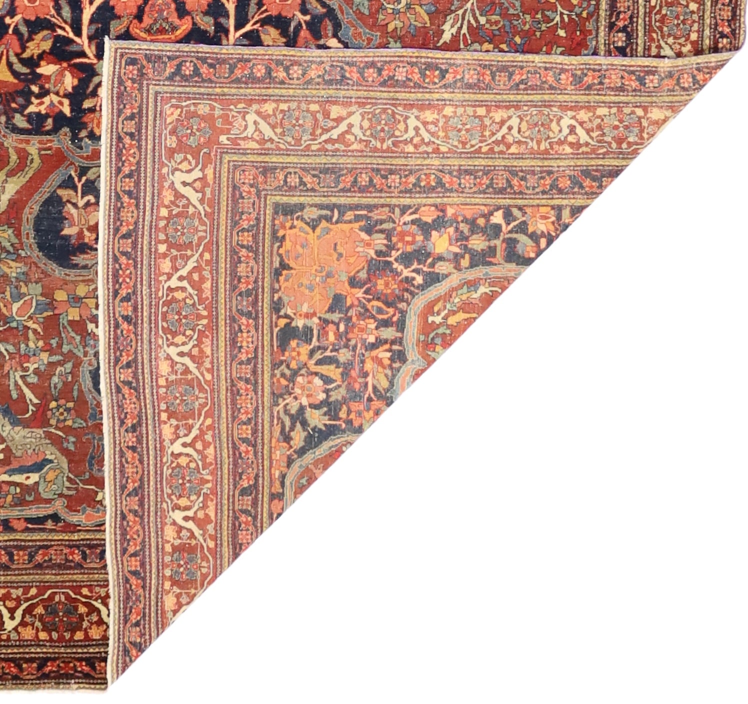 The scatter and room size pieces made in the Arak/Sultanabad area, between 1880 and 1910, with firm and leathery well-woven textures, and strong in red, navy and ecru tones, usually in medallion formats. A transition group between the earlier 19th century Farahans and the post-WWI Sarouks. Drawing is between curvilinear and angular.