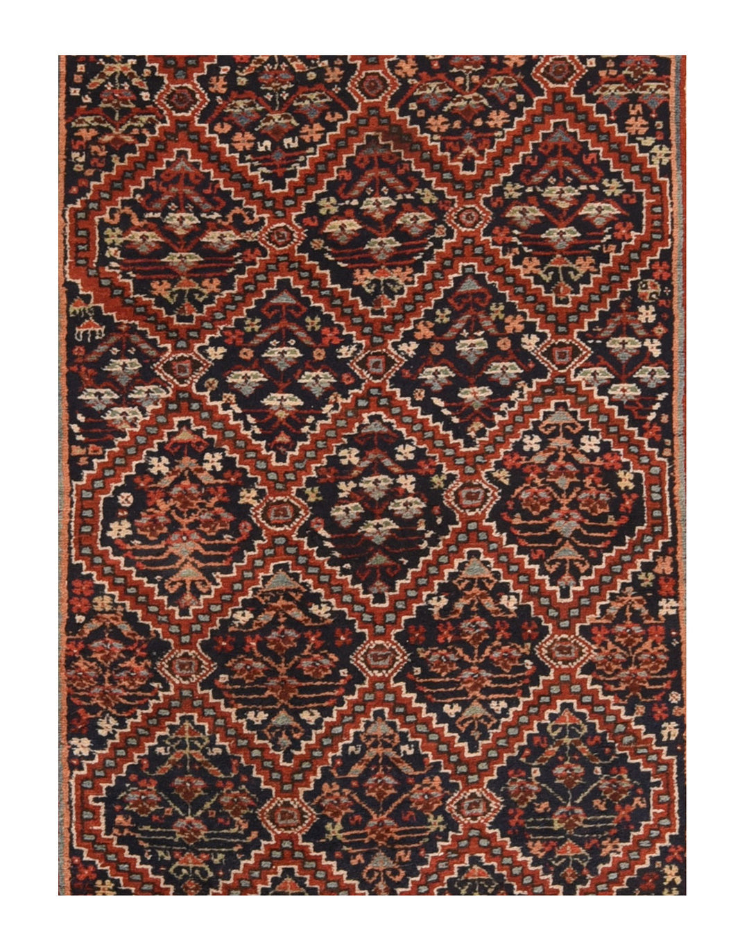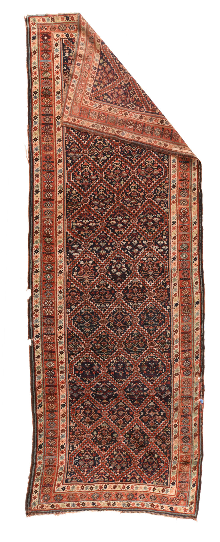 The rugs of the nomads of Luristan is western Persia. Geometric patterns in centralized or allover layouts, wool foundations, resemble somewhat their Fars parallels. Scatters to long rugs (Kellegis), bags and bag faces. No prayer rugs or antique room sizes. Moderate to medium weave. Crisp palettes. Probably undervalued.