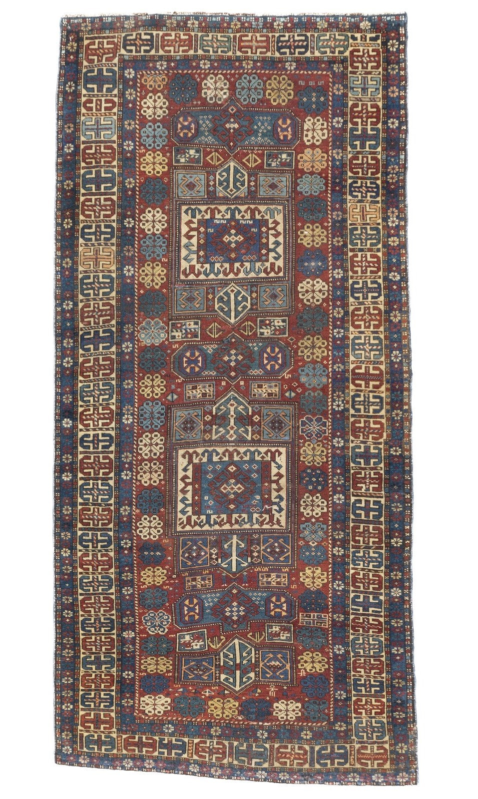 Azeri Turks inhabit the Kuba area of the central west Caspian Caucasus and weave a wide variety of geometric scatters, runners, long rugs and niche (prayer) pieces, in geometric allover and medallion designs. Some flat-weaves in kilim/tapestry and sumak (weft-wrapping) techniques are also woven. Numerous identified types/villages: Zeychur, Alpan, Chi-chi, etc. Generally all-wool, moderate to medium weave. Colorful.