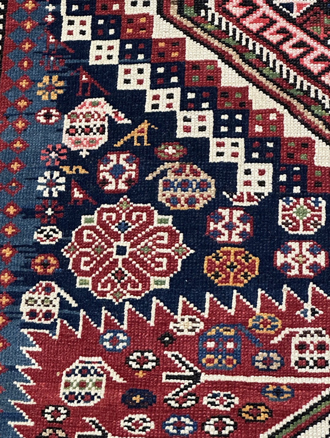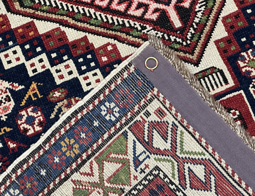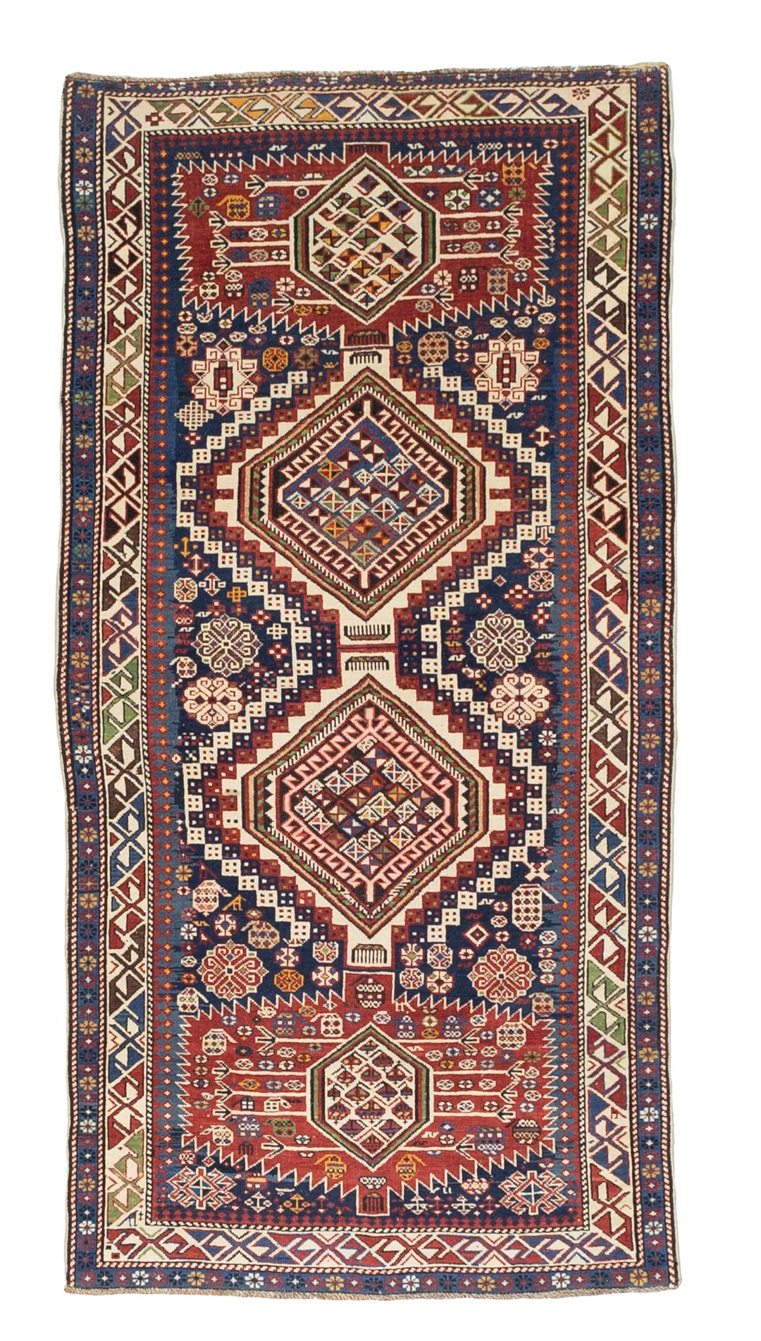 Azeri Turks inhabit the Kuba area of the central west Caspian Caucasus and weave a wide variety of geometric scatters, runners, long rugs and niche (prayer) pieces, in geometric allover and medallion designs. Some flatweaves in kilim/tapestry and sumak (weft-wrapping) techniques are also woven. Numerous identified types/villages: Zeychur, Alpan, Chi-chi, etc. Generally all-wool, moderate to medium weave. Colorful.
