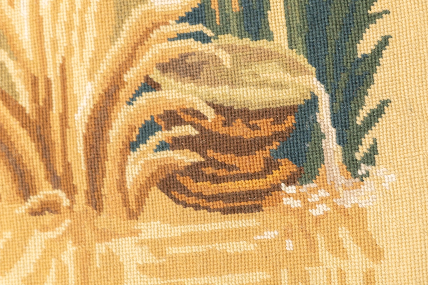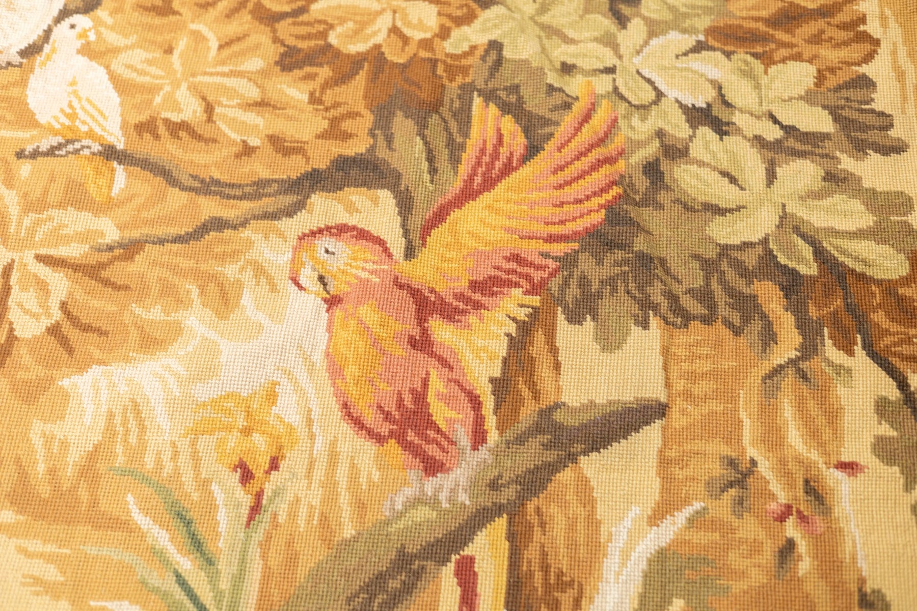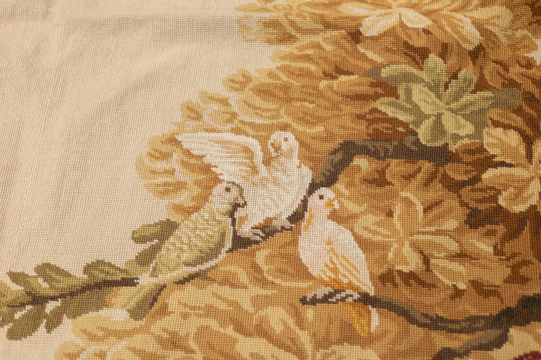 Usually English or French, often with repeating allover designs executed with wool cross-stitches. Larger carpets are workshop productions, smaller pieces have a single artisan author. Flat-weave texture, without elevated pile. Best are 19th century although recent examples are frequent. Patterns of bouquets, single flowers, domestic animals and plants.