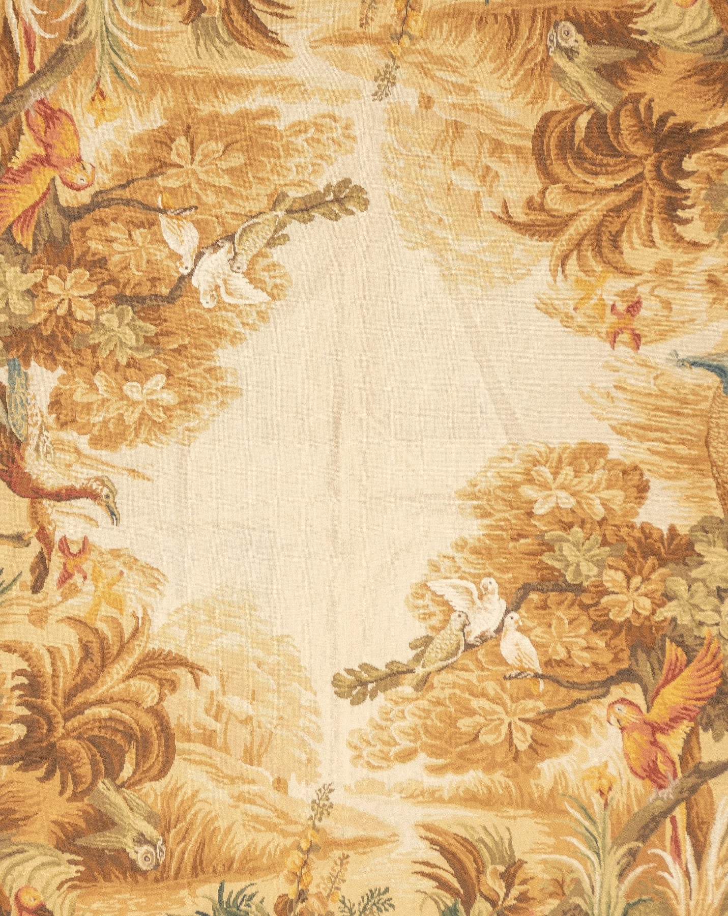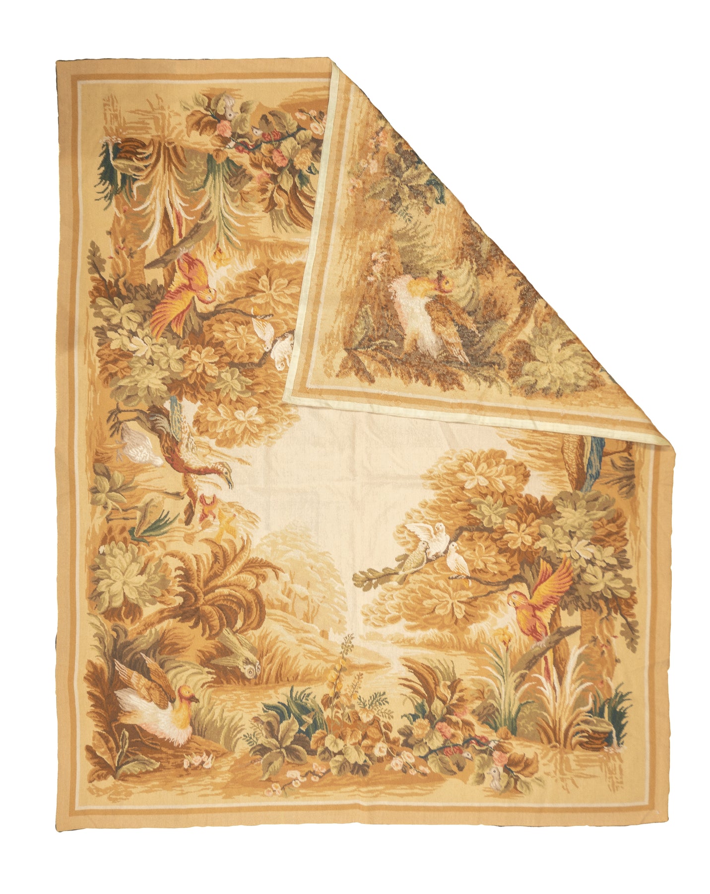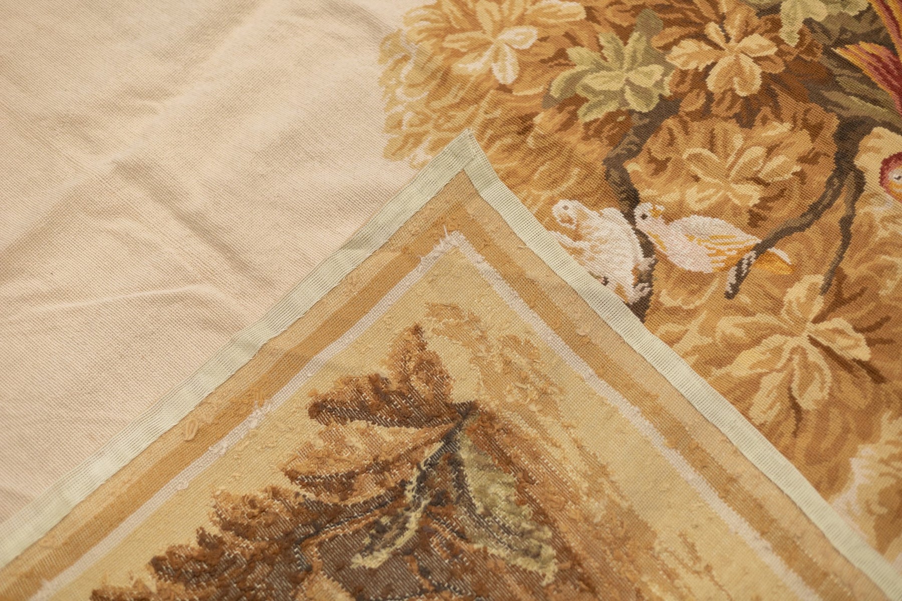 Usually English or French, often with repeating allover designs executed with wool cross-stitches. Larger carpets are workshop productions, smaller pieces have a single artisan author. Flat-weave texture, without elevated pile. Best are 19th century although recent examples are frequent. Patterns of bouquets, single flowers, domestic animals and plants.