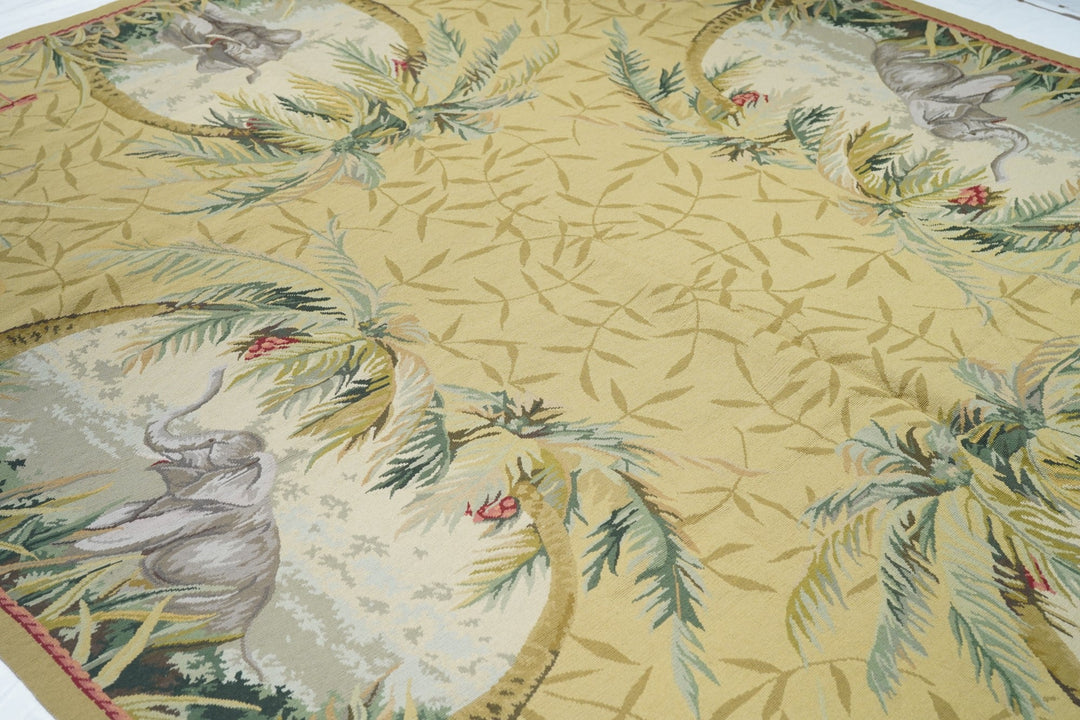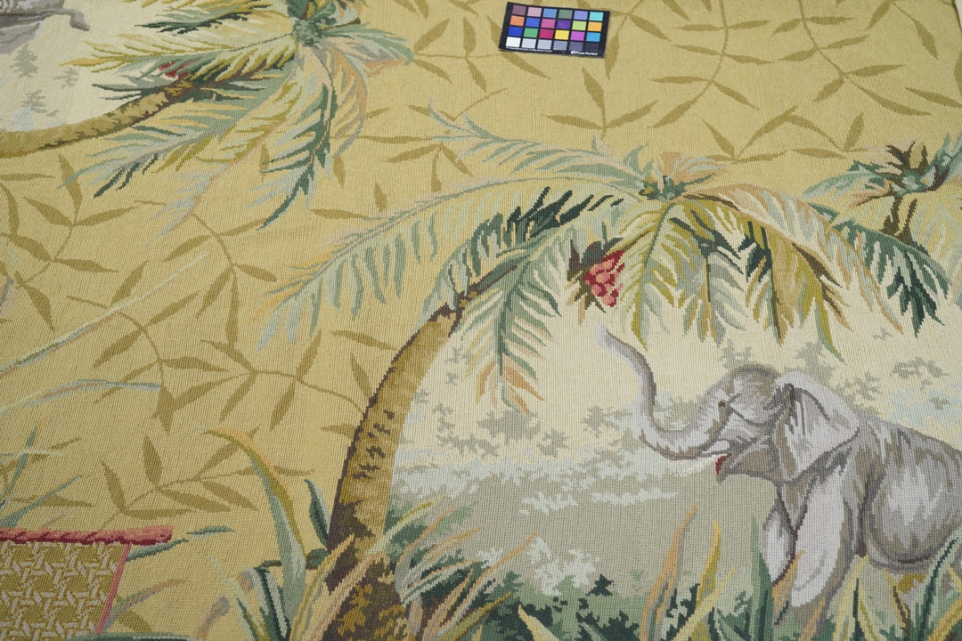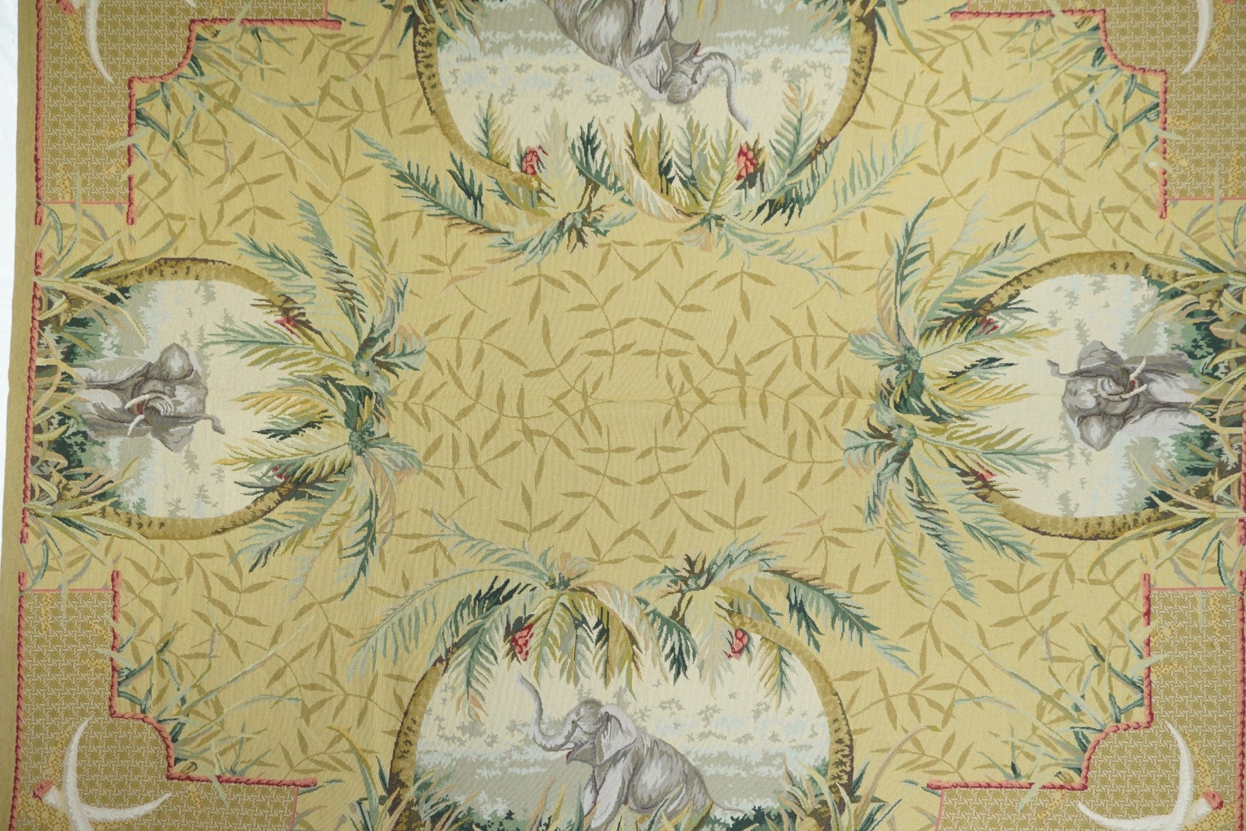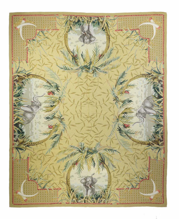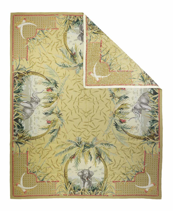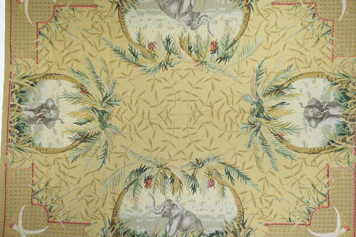 Four large oval vignettes of elephants and palm trees accent the ochre field with its allover decoration of bamboo leaves. Broken, dotted main border with corner pairs of elephant tusks. Perfect for the Great White Hunter's lair.