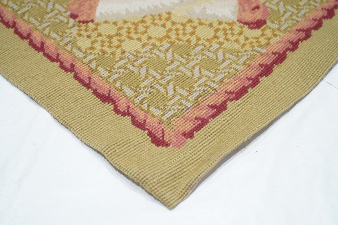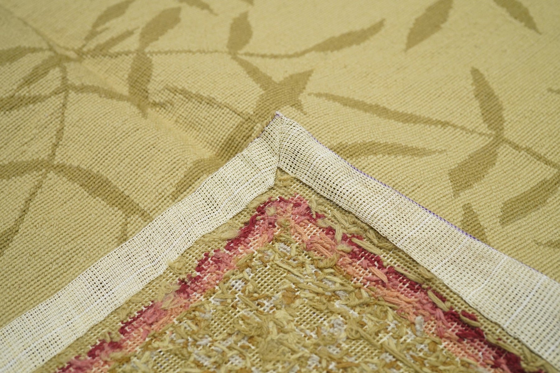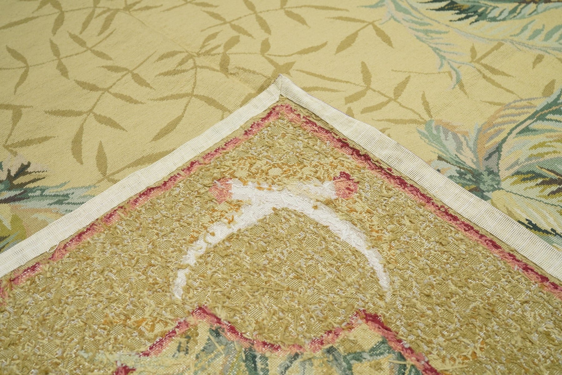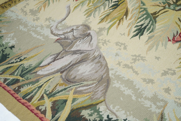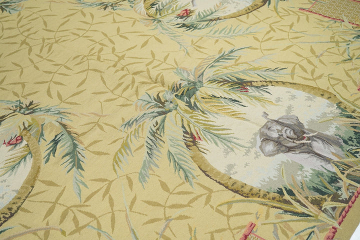 Four large oval vignettes of elephants and palm trees accent the ochre field with its allover decoration of bamboo leaves. Broken, dotted main border with corner pairs of elephant tusks. Perfect for the Great White Hunter's lair.