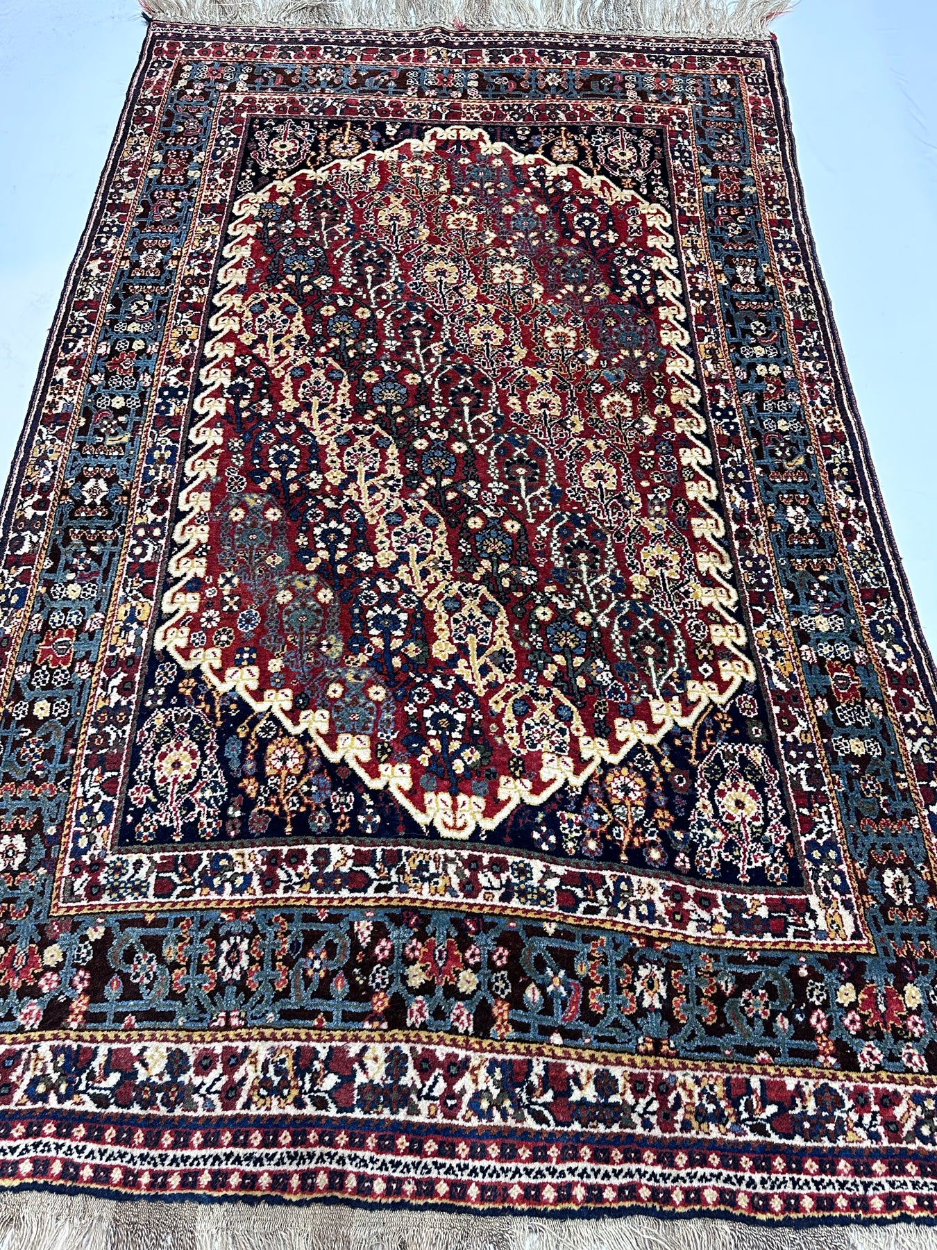 The best SW Persian, Fars Province nomadic rugs, mostly in scatter formats. Geometric Gabbehs, lion rugs, adapted Persian curvilinear styles. Some well-woven prayer rugs. All-wool constructions. Pictorial rugs. Weaving goes back to at least the mid-19th century. Excellent wool quality.