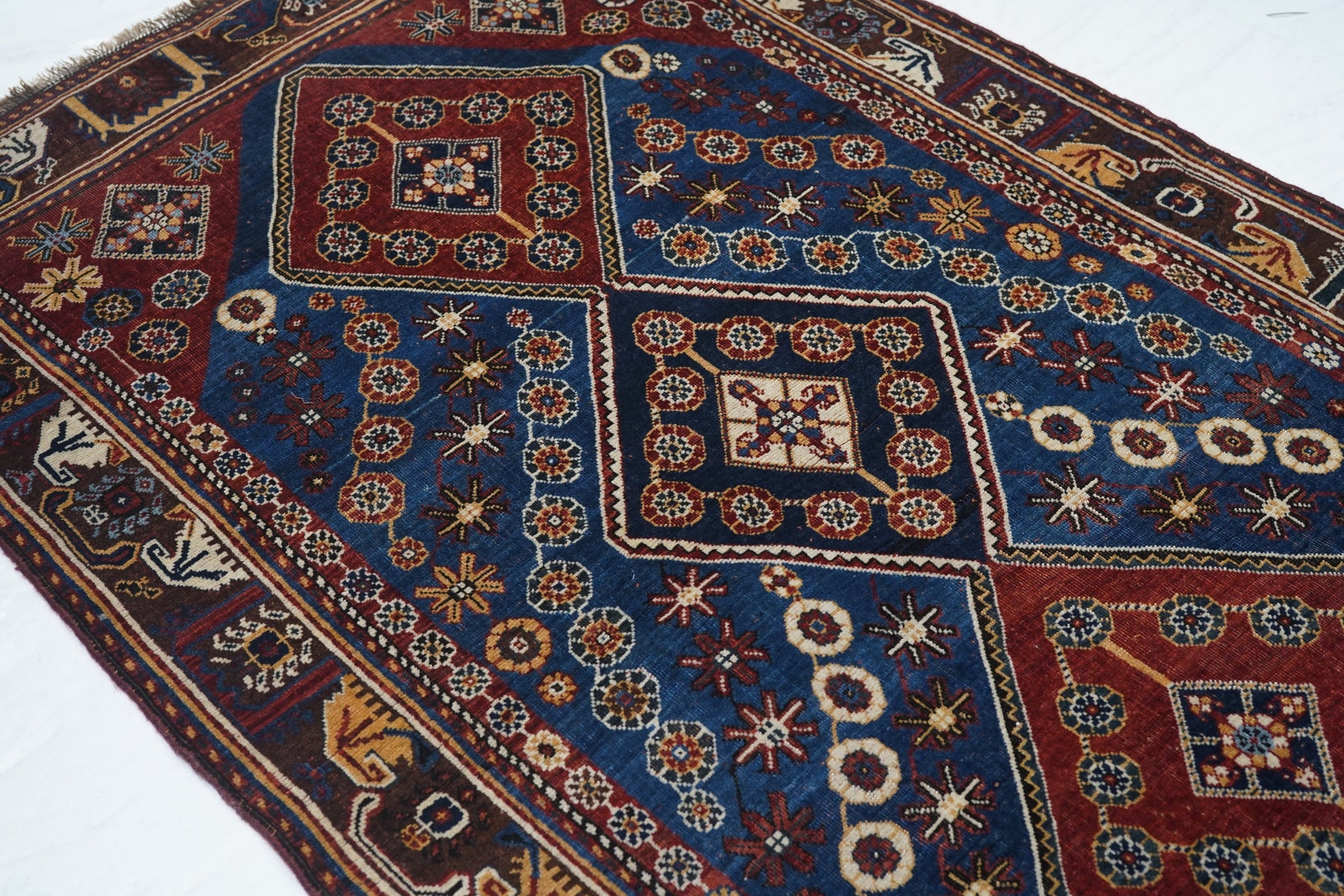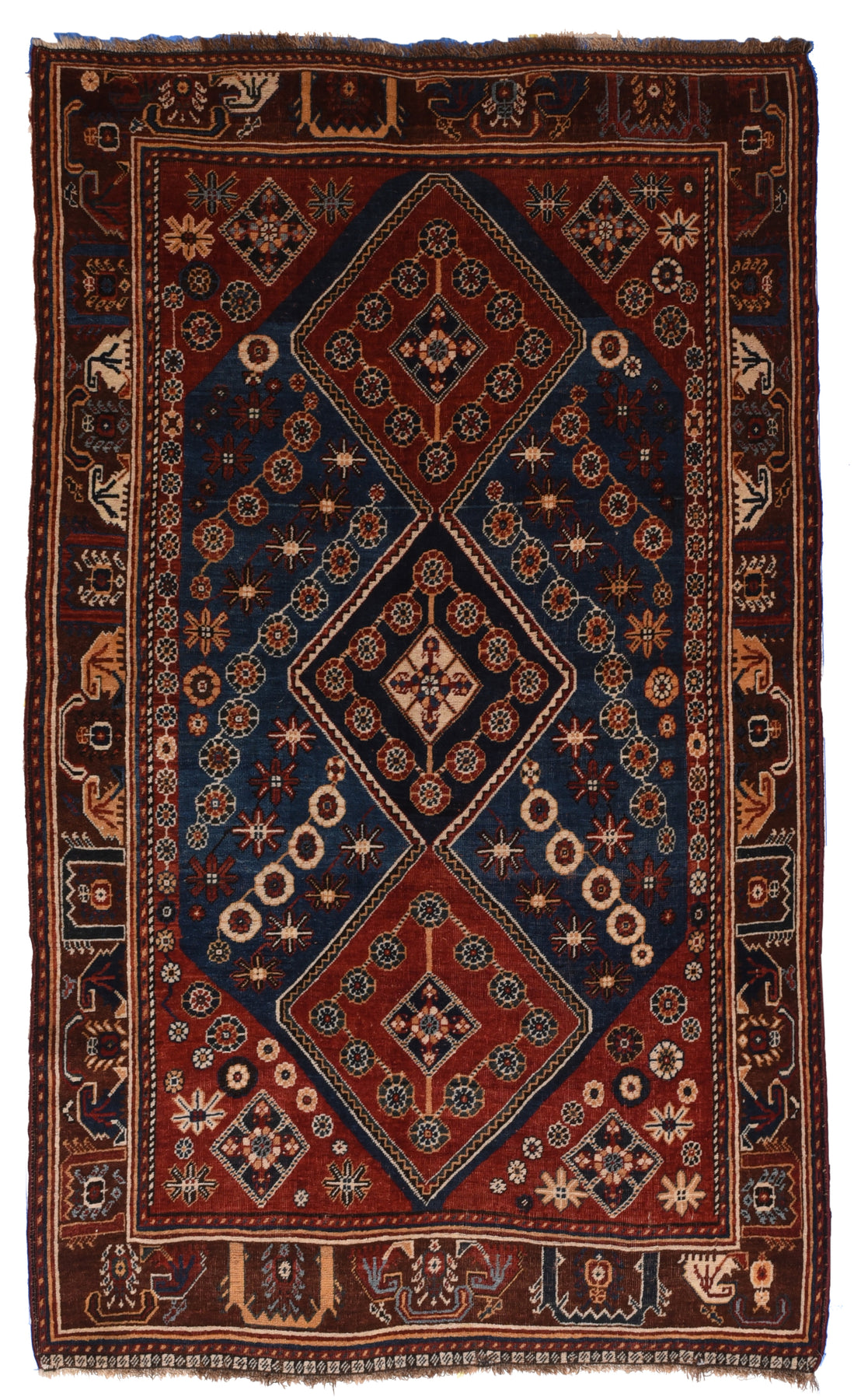 A bold pole medallion of three attached stepped lozenges in red and brown-black shows conforming internal rosette wreaths and central, smaller diamonds. Diagonal chains of rosettes in ivory, blues and red, within triangular red corners. Dark chocolate main border with wonky palmettes and leafy brackets. Black/ecru chessboard line at one end characteristically Qashghai. Well-woven southwest Persian tribal scatter in good condition.