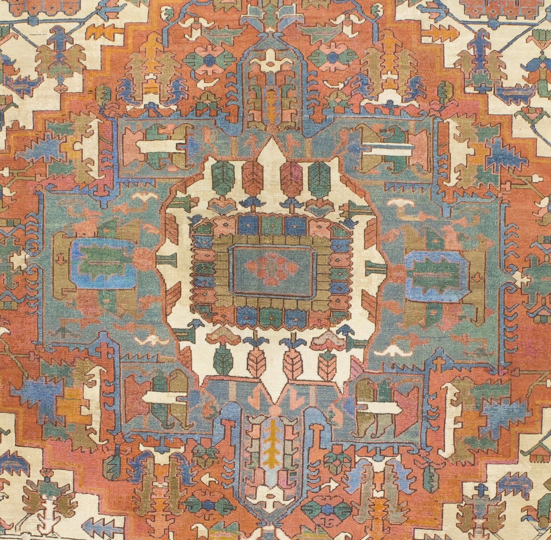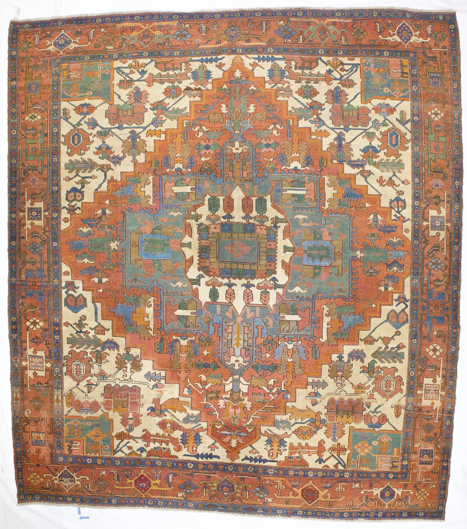 Generally in squarish sizes, allover patterns and coarse to moderate weaves, wool or mixed constructions; woven before 1900. Term is often extended to early medallion, later 19th century. Earlier pieces often have slightly more muted palettes employing rust, straw and lighter blues. Generally in carpet sizes, some scatters. Expensive