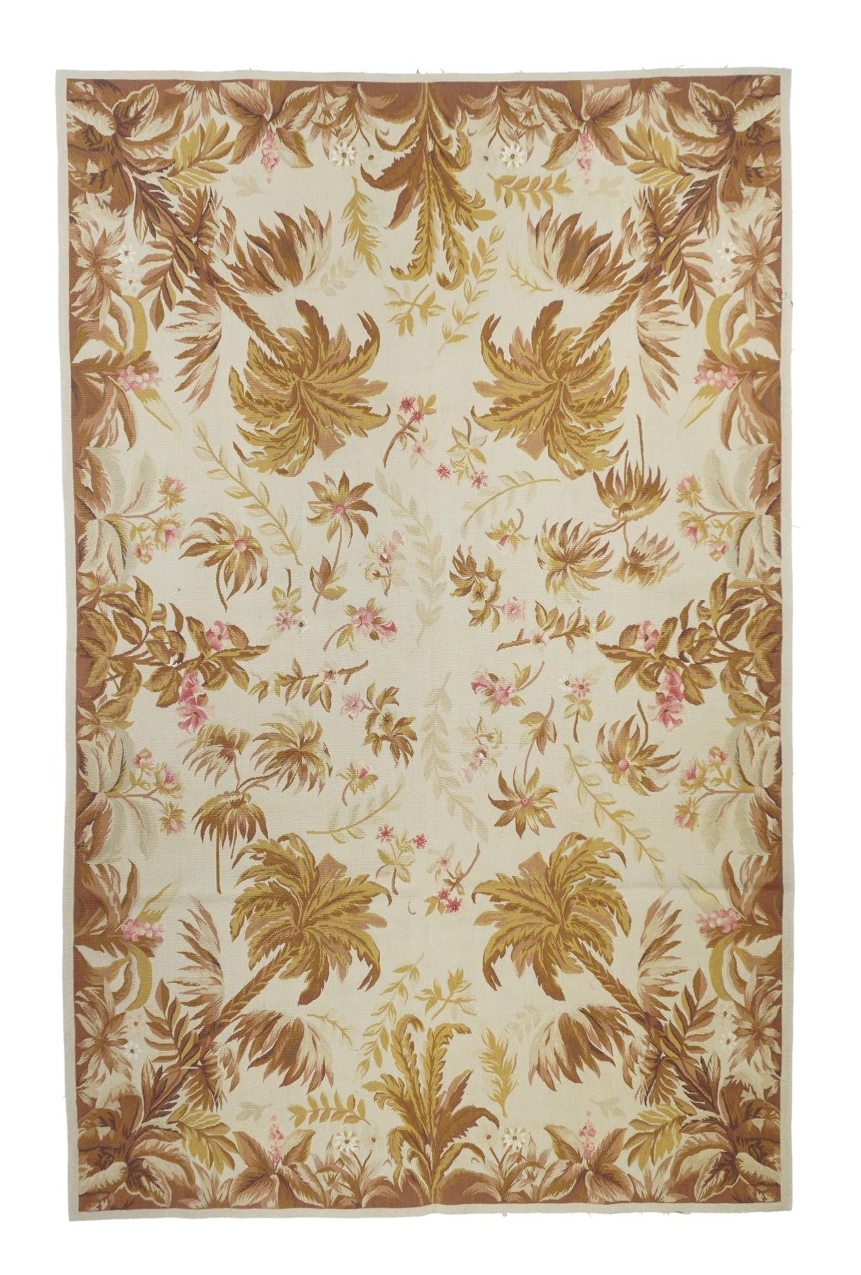Refers generally to modern carpets in tapestry technique and inspired by French Aubusson designs of the 18th and later centuries. Geometric or semi-floral. Scatters to room sizes. Recent pieces are usually Indian. Wool pattern wefts.