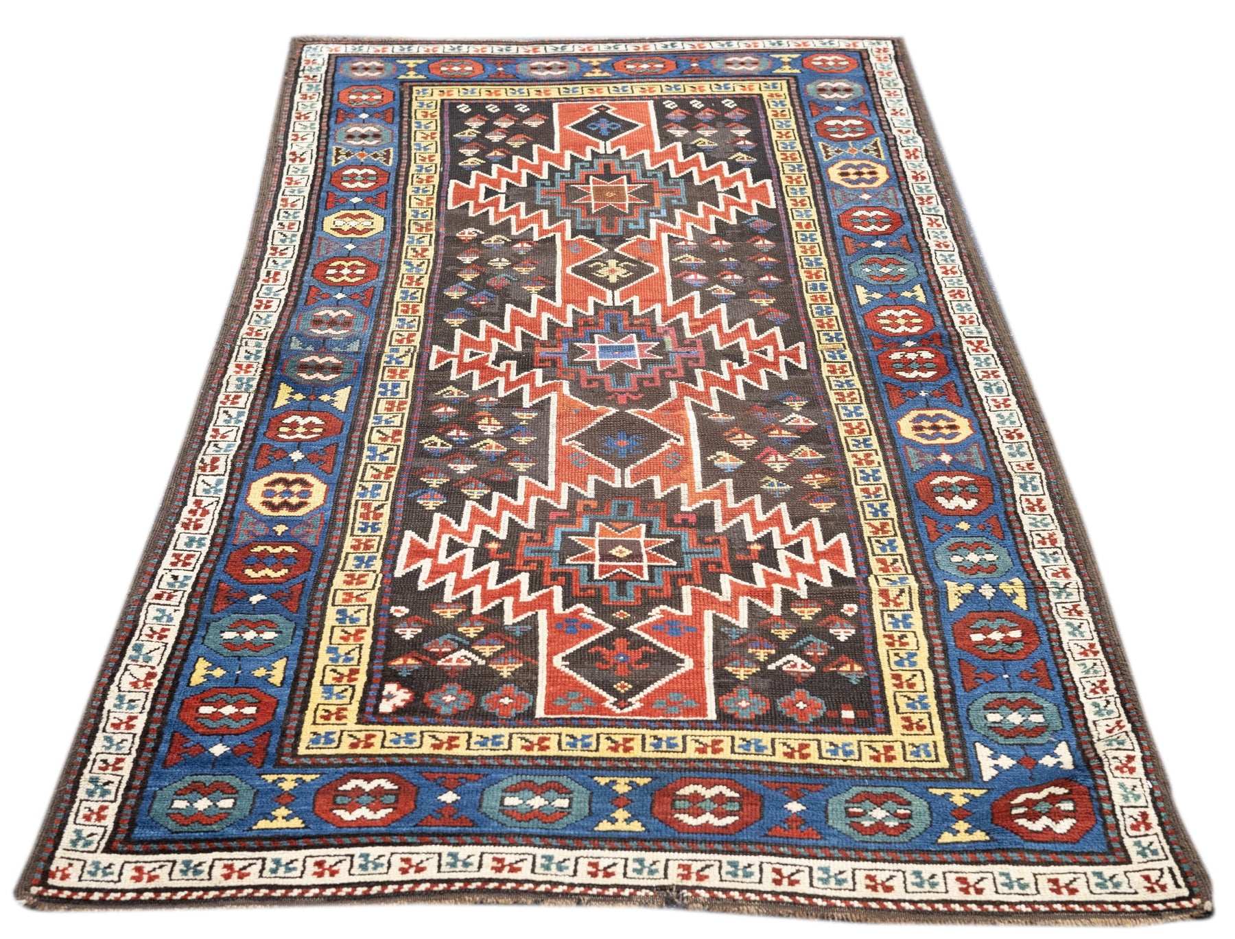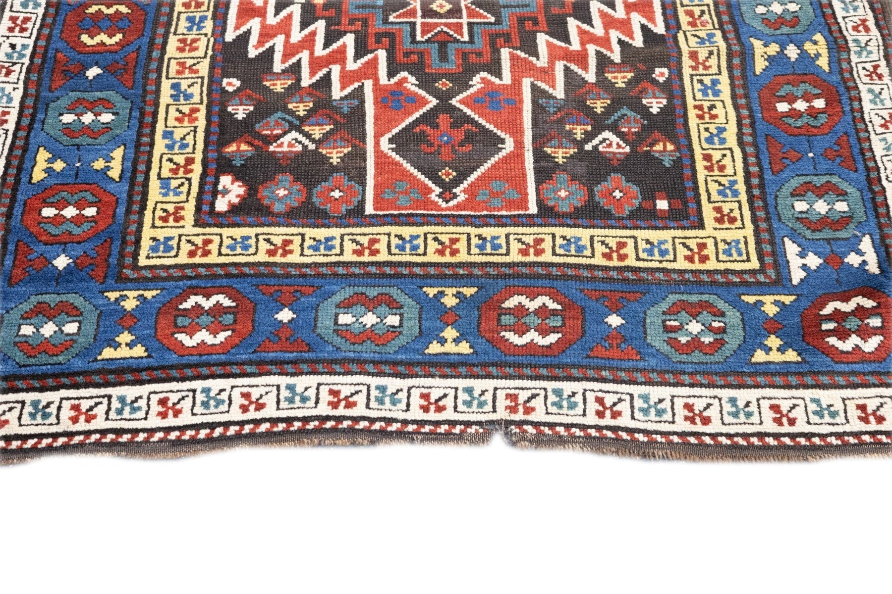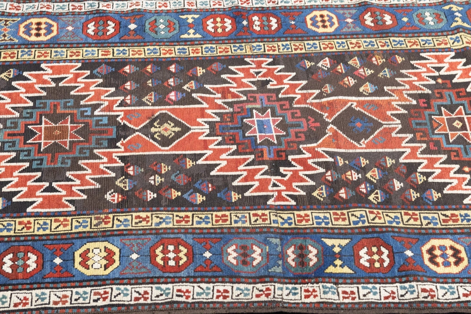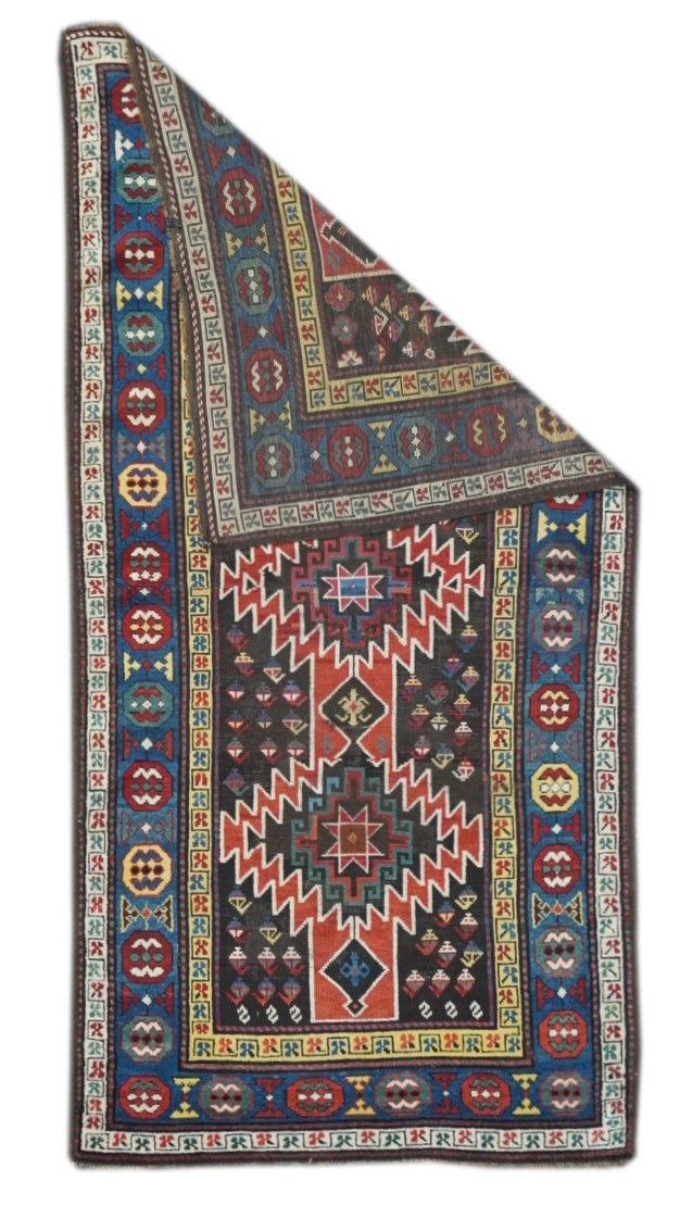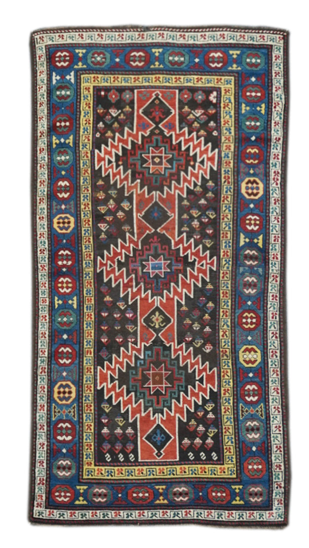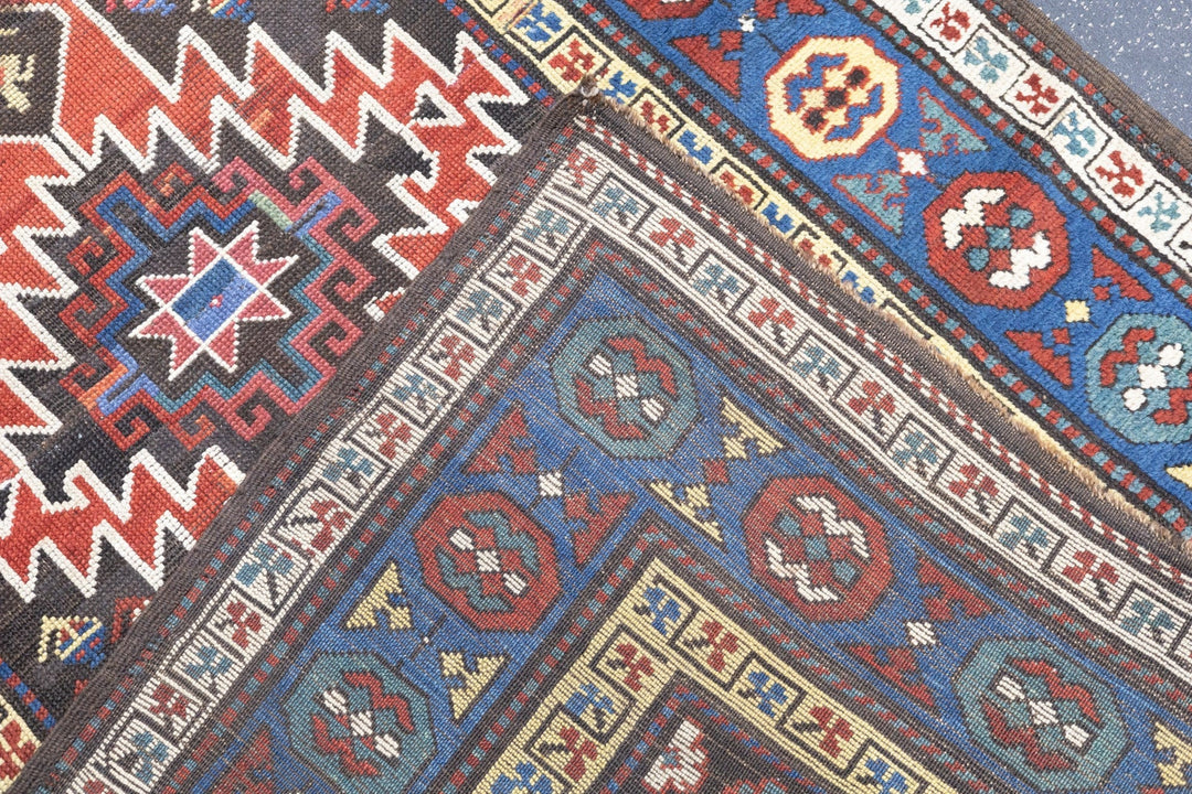 A variant of the "Chan" type, here with three floating ashik and Memling gul medallions floating on a cochineal red central and, with near black serrated side trapezoids filled with small botehs. Royal blue main border with octagons and fillers. Ecru and pale yellow minors with four leaf clovers in squared meanders. All wool construction. Moderate weave. Good condition.
