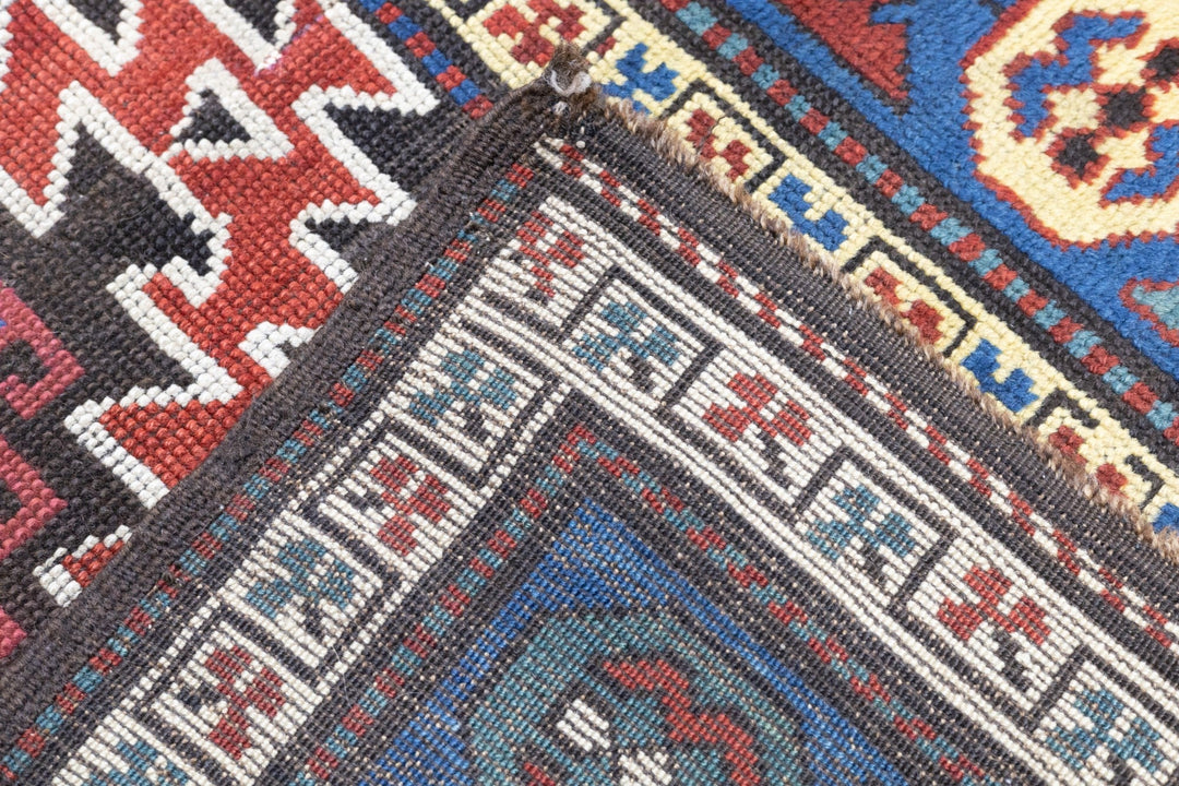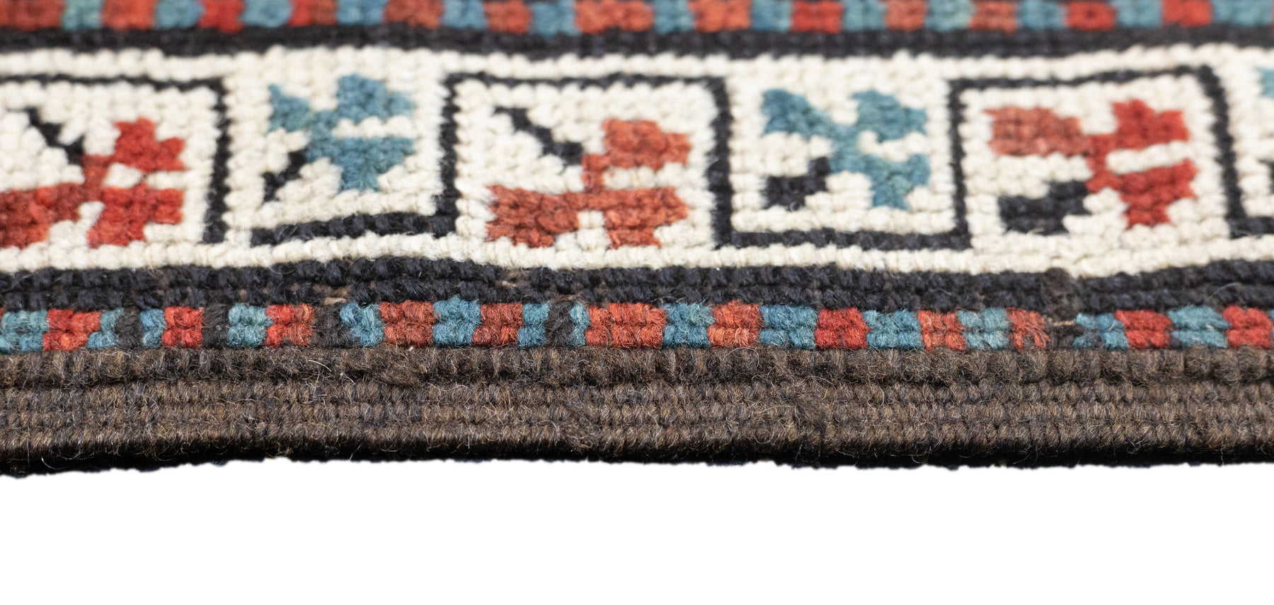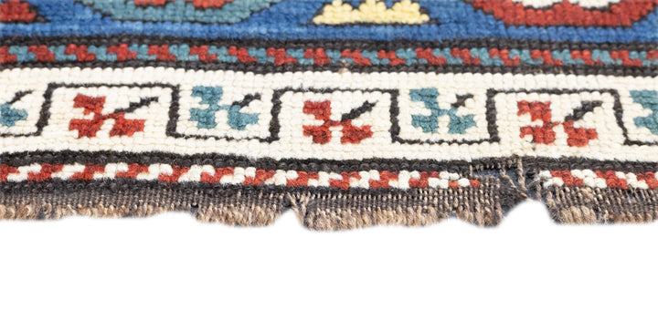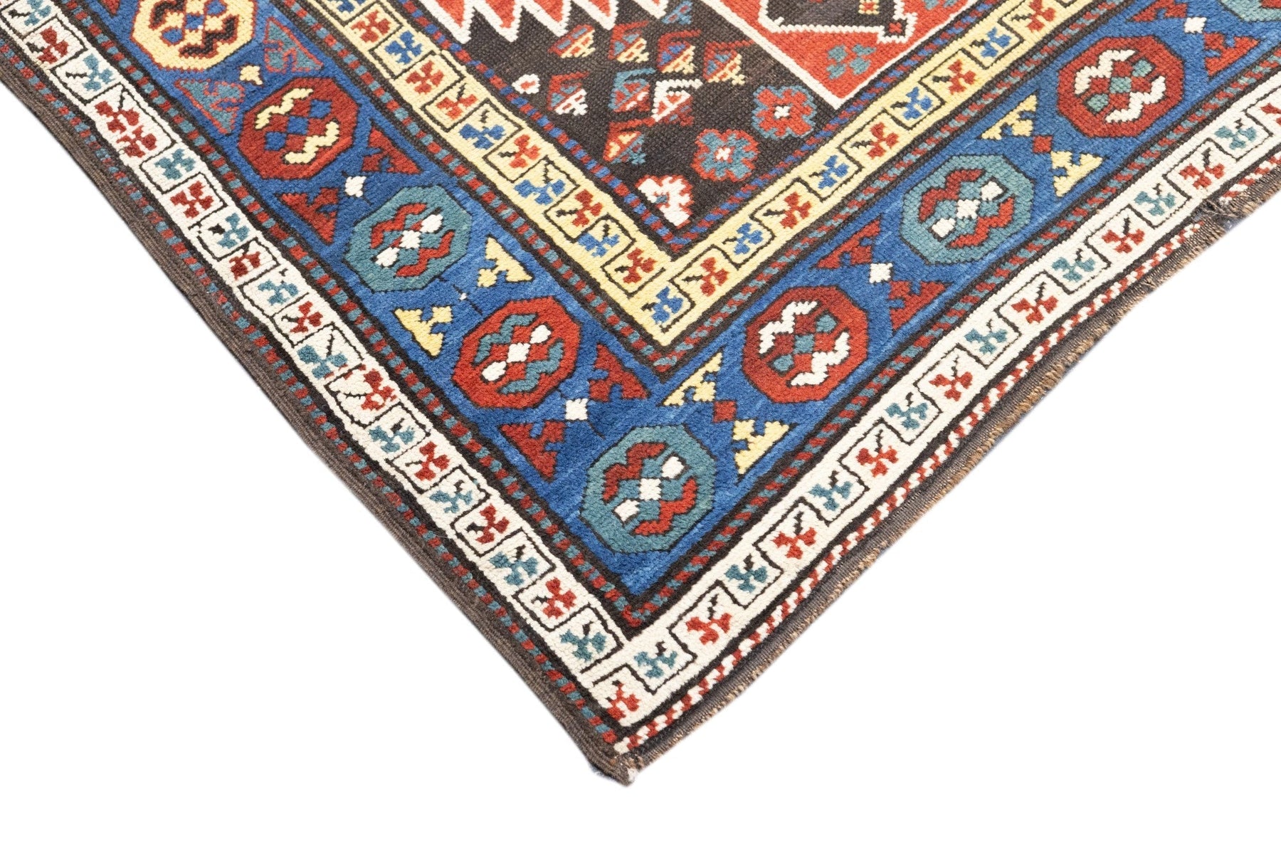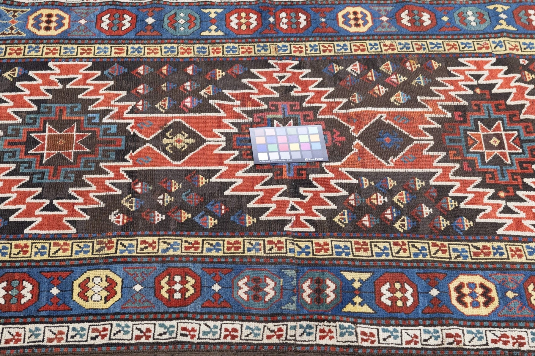 A variant of the "Chan" type, here with three floating ashik and Memling gul medallions floating on a cochineal red central and, with near black serrated side trapezoids filled with small botehs. Royal blue main border with octagons and fillers. Ecru and pale yellow minors with four leaf clovers in squared meanders. All wool construction. Moderate weave. Good condition.
