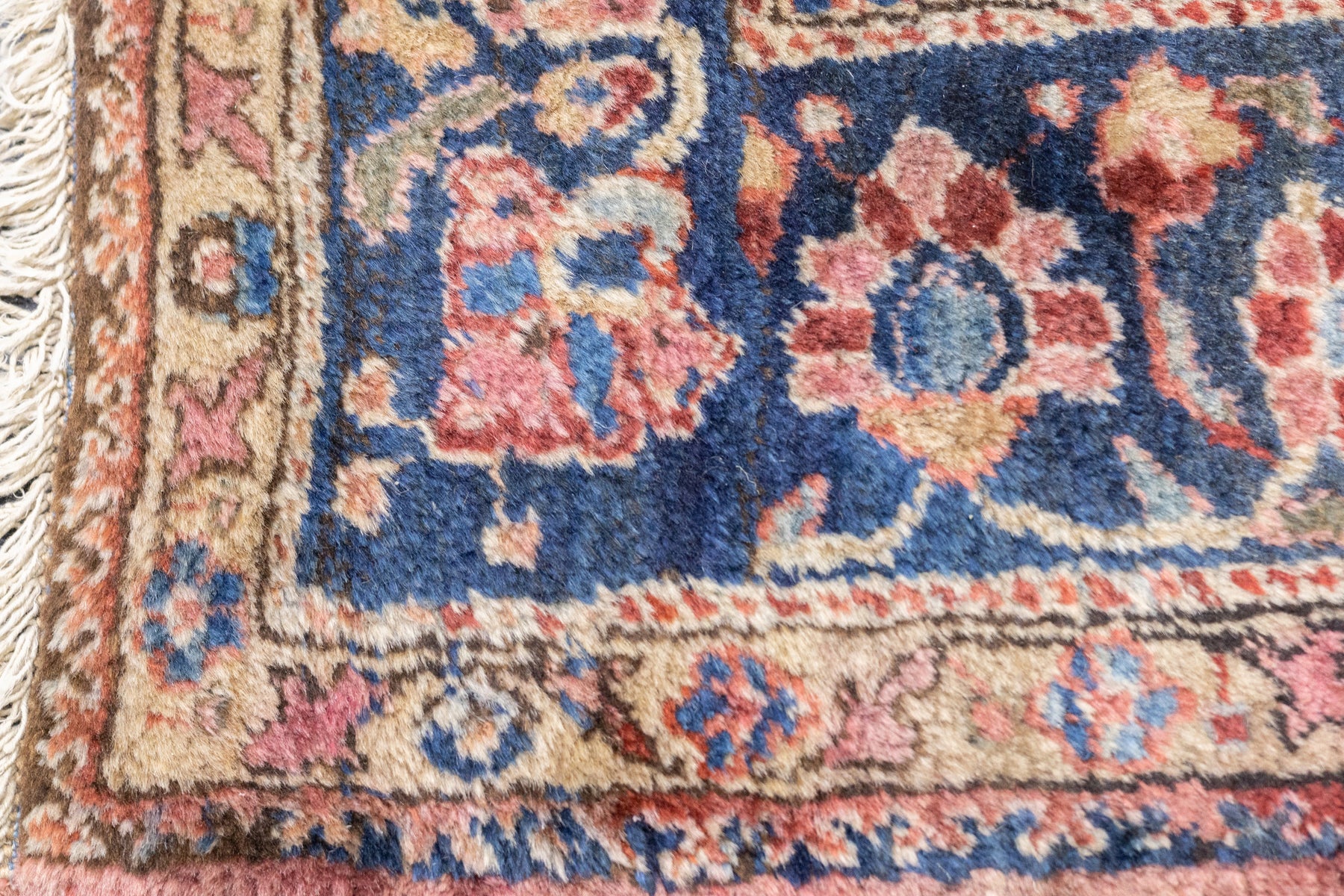 The well-woven village carpets from the Arak/Sultanabad area, especially the red field/navy border, detached floral spray pattern “American Sarouks” of the 1920-1970 period. Robust and leathery, on cotton. Recent examples show medallions and classic allover patterns. Best Sarouks are reputed to be Mohajerans.