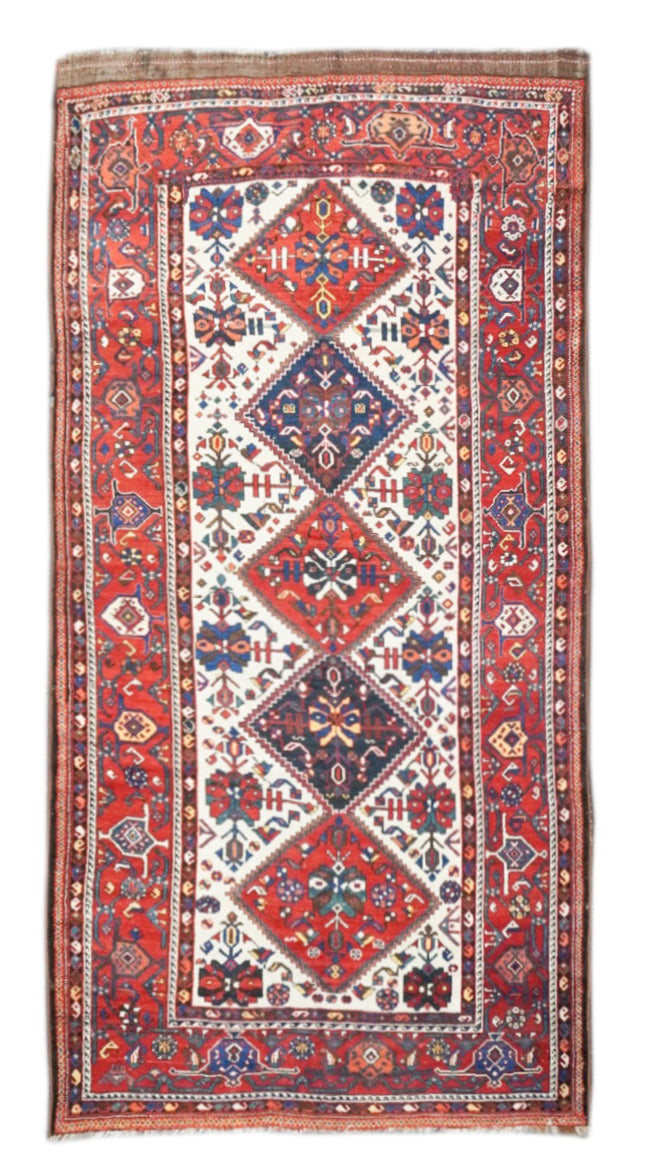 The ecru field is centred by a five diamond section pole medallion in alternating red and navy. Each stepped panel encloses a complex and varying rosette form. Similar rosettes with pendants, along the sides. Red strip style main border with clumsy, but endearing reversing turtles. Darkest brown en suite reversing boteh minors. Light straw details overall. Symmetric knots, moderate weave. Good condition.