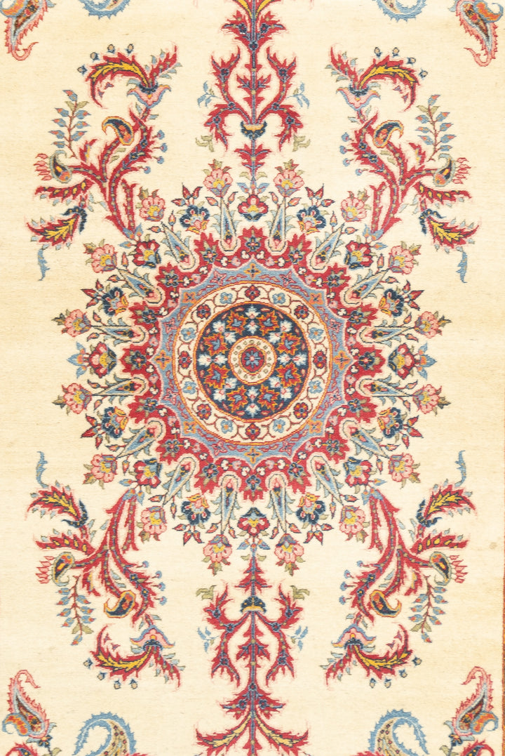 Fine to very finely woven, and wool rugs, mostly scatters, from the central Persian religious capital. Industry began in the 1930's. Curvilinear drawing, Medallion, centralized, panel, allover, boteh and architectural patterns. A few prayer rugs.
