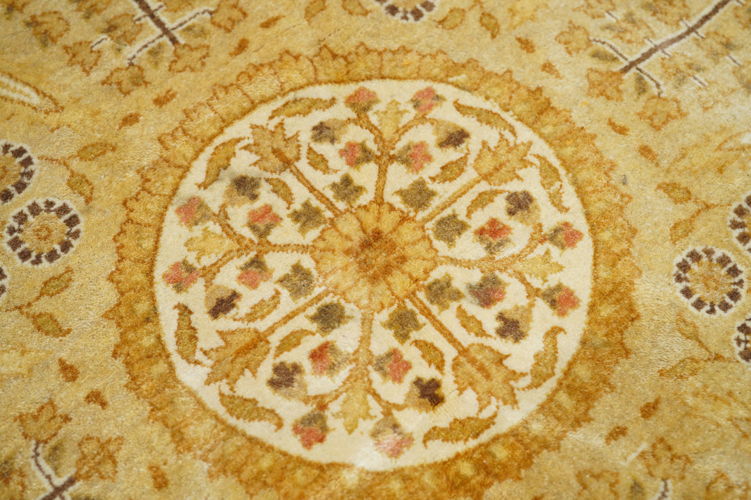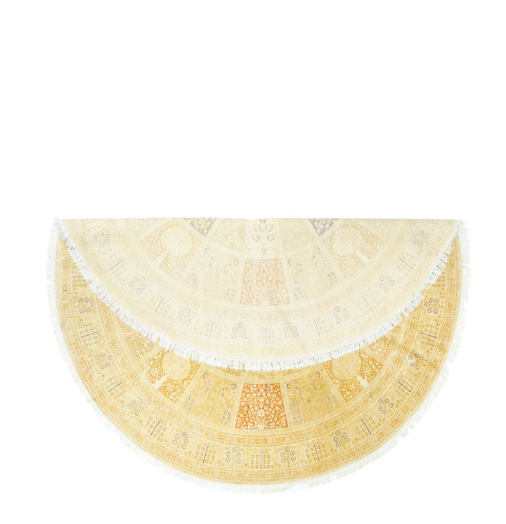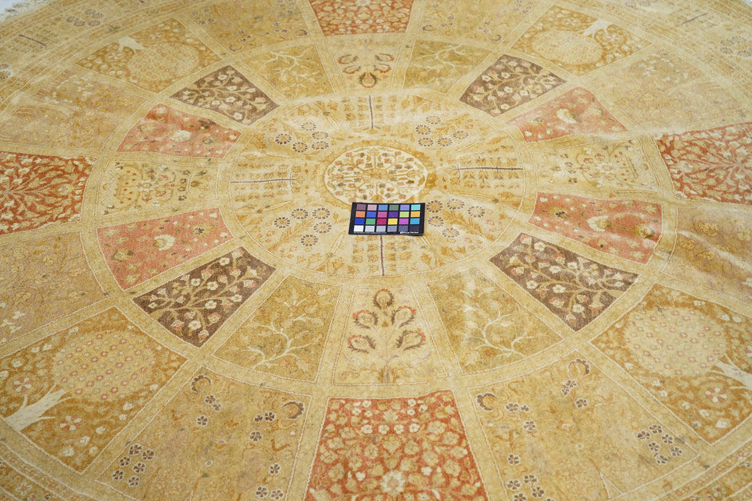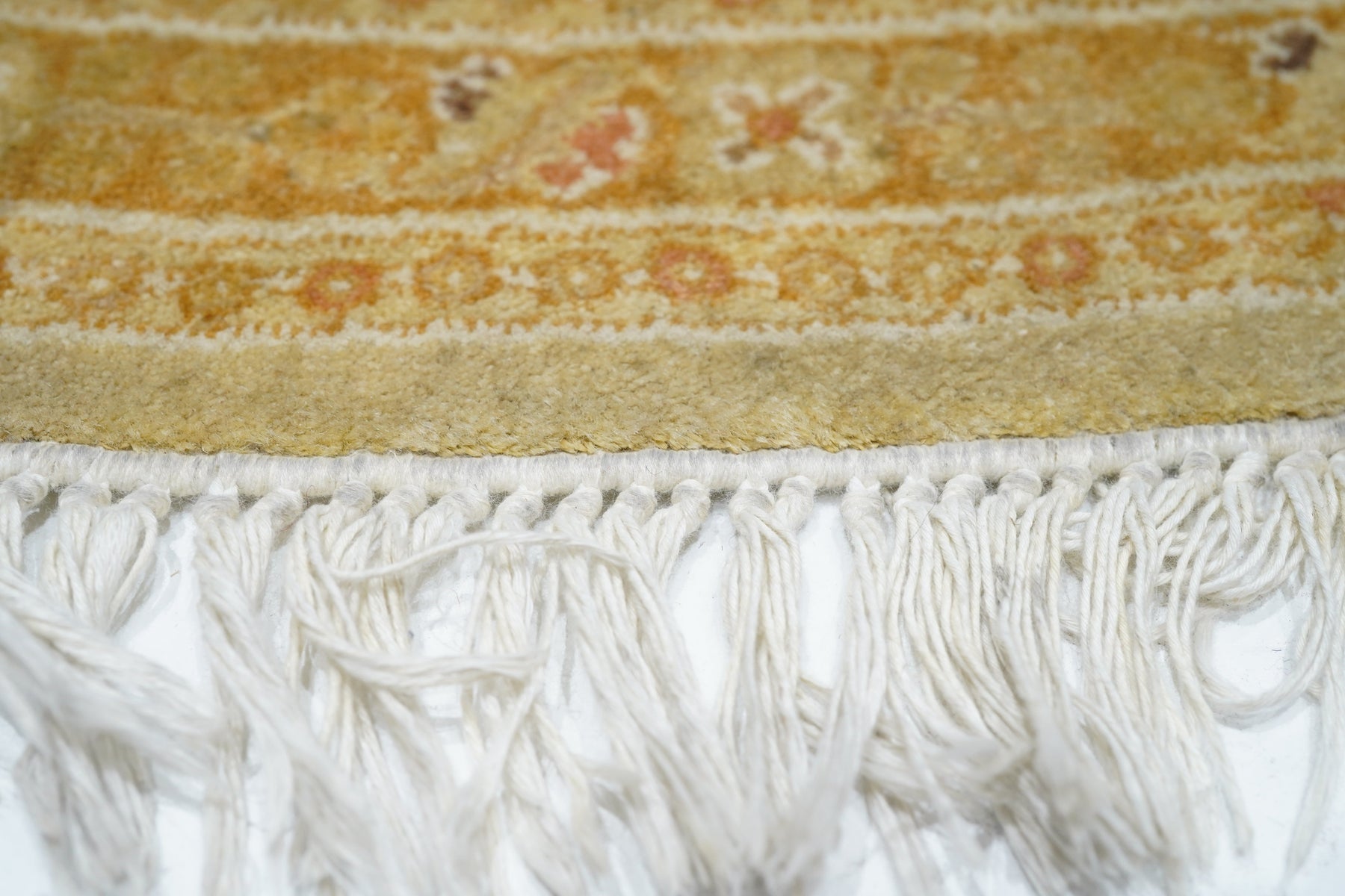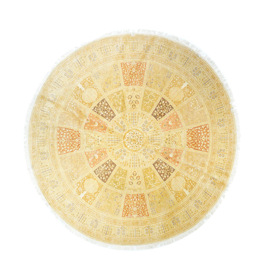 An unusual, lightly toned, circular version of the paneled "garden design". with three echelons of lollipop and branching trees, cypresses, and dense floral compositions, on rust, red, tangerine and straw. Sandy border of two alternating upright flower modules. Ecru round centre. Finely woven. Recent. New condition.